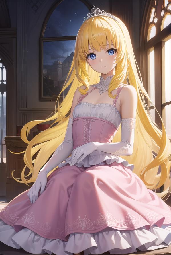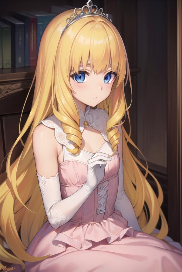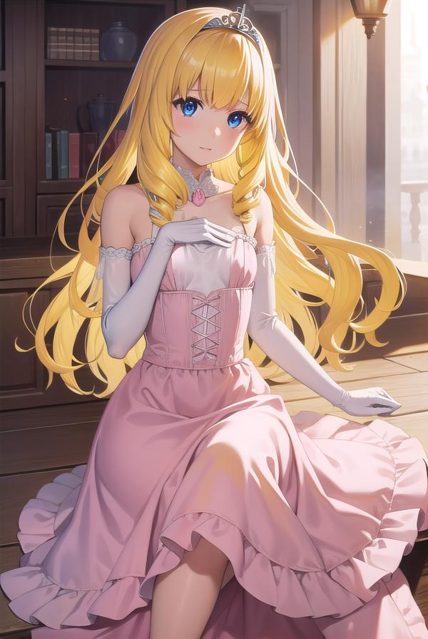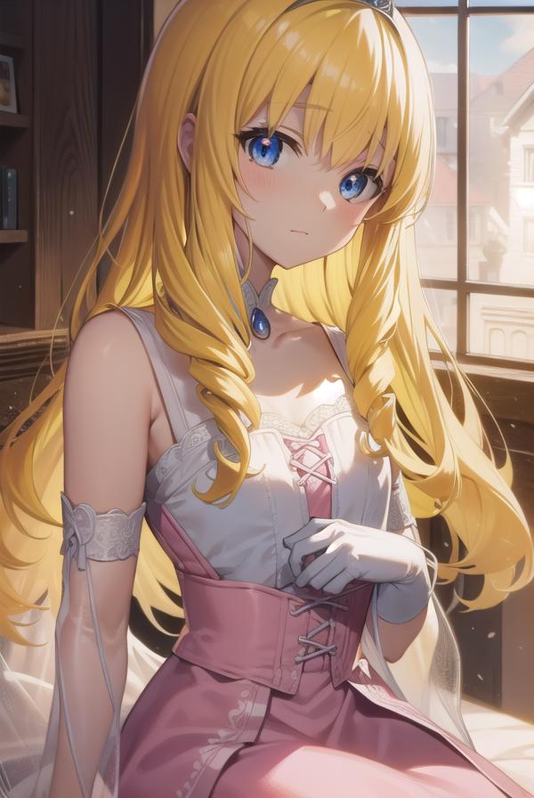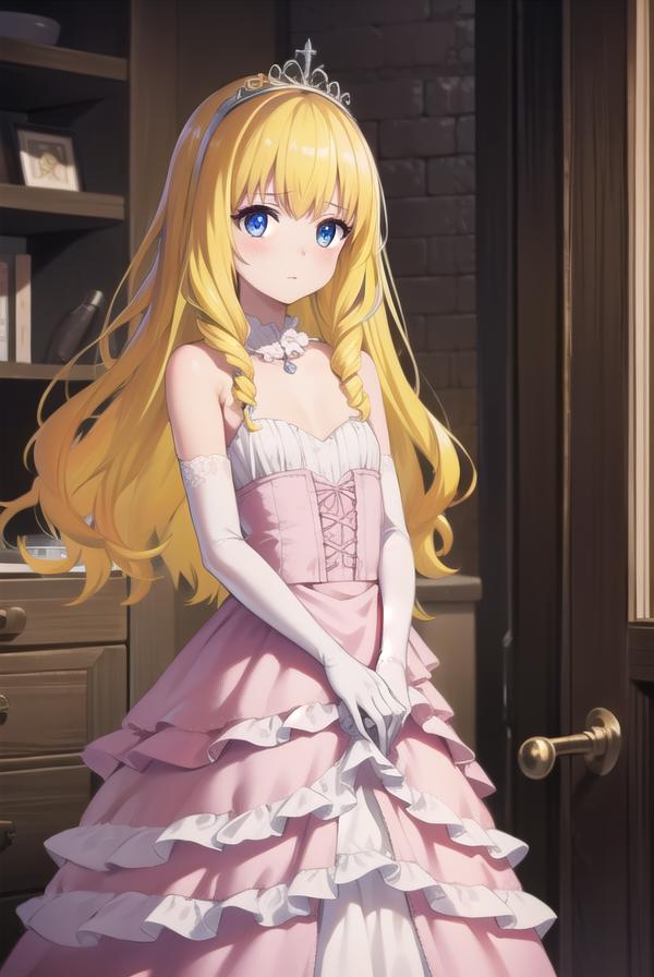 diadem, tiara, elbow gloves, gloves, white gloves, dress, frilled dress, long skirt, frilled skirt, corset, (pink dress:1.5),