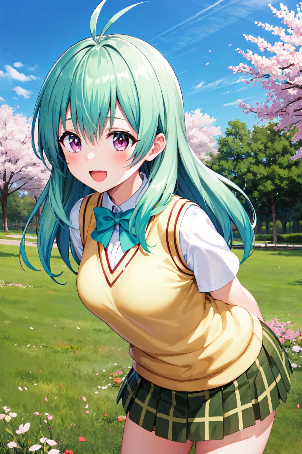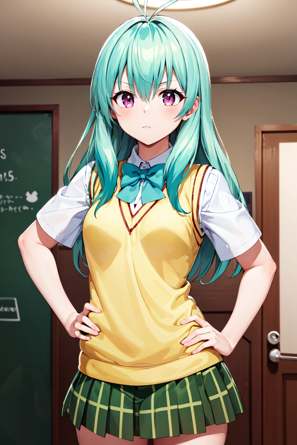aarej, solo, long hair, antenna hair, purple eyes, school uniform, green bowtie, white shirt, sweater vest, yellow vest, short sleeves, plaid skirt, green skirt