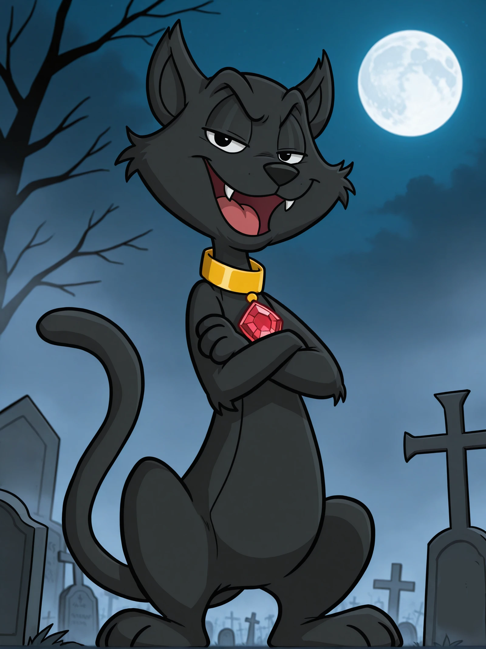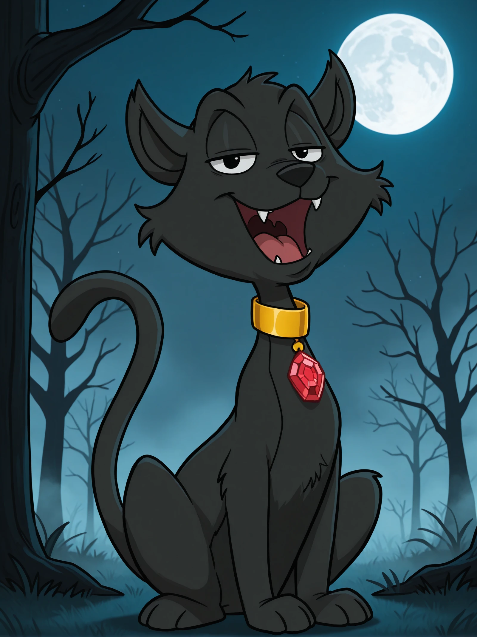 Suggested reinforcement tags: black fur, black nose, black eyes, gold collar, gem, feline tail, fangs, feral