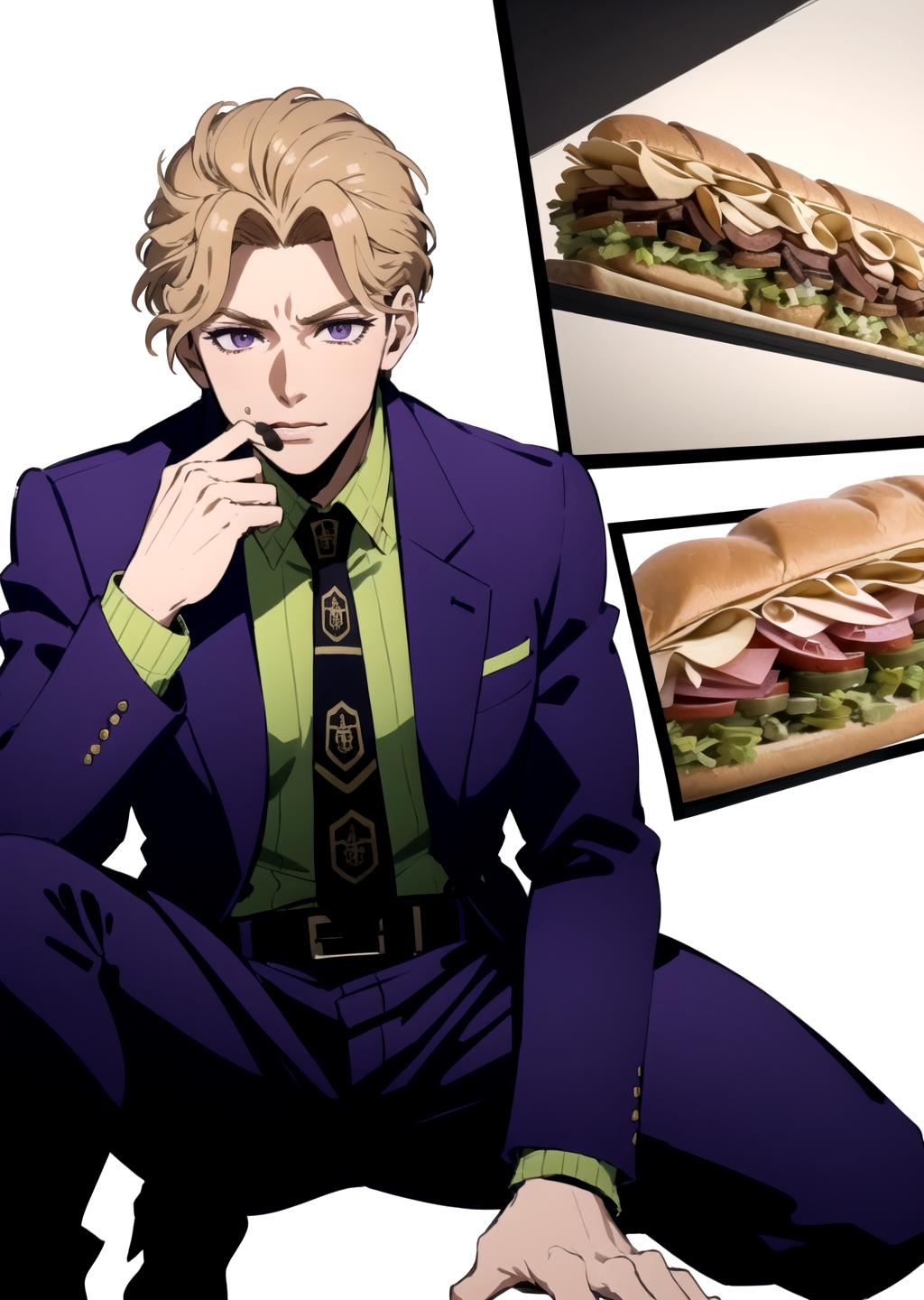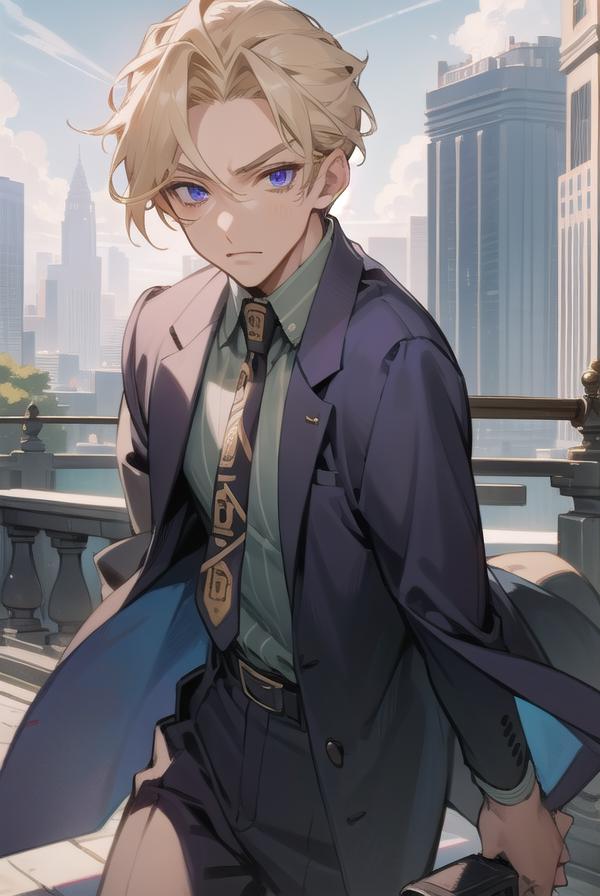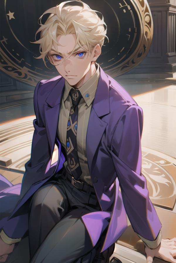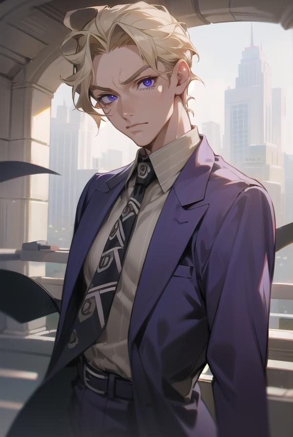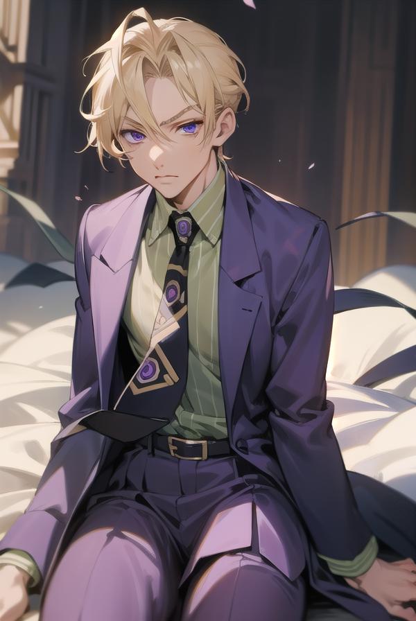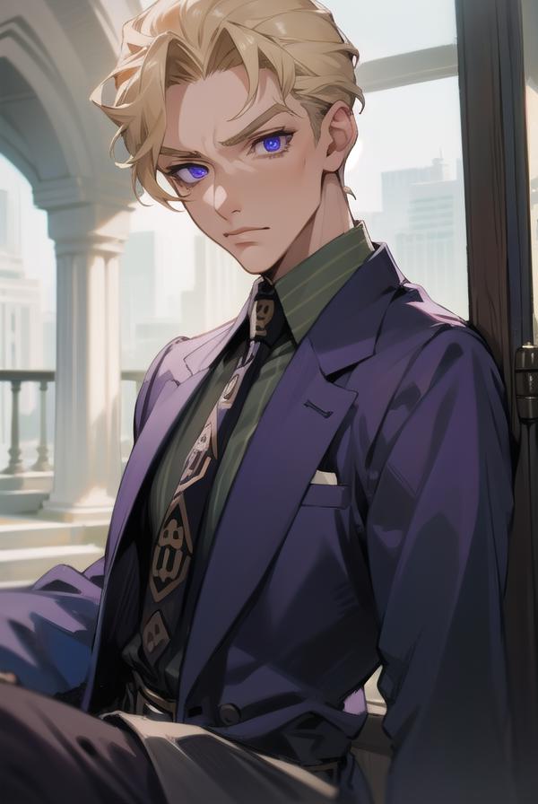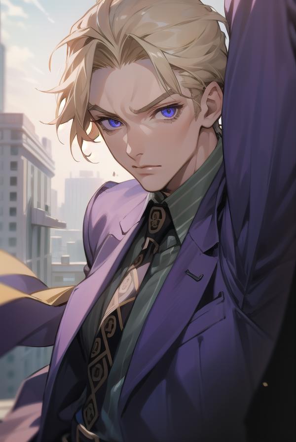 kira yoshikage, 1boy, blonde hair, short hair, mature male, cheekbones, purple eyes,