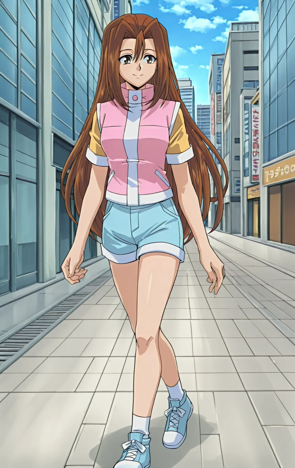 For her classic outfit use: pink shirt, blue shorts, white socks, blue sneakers.