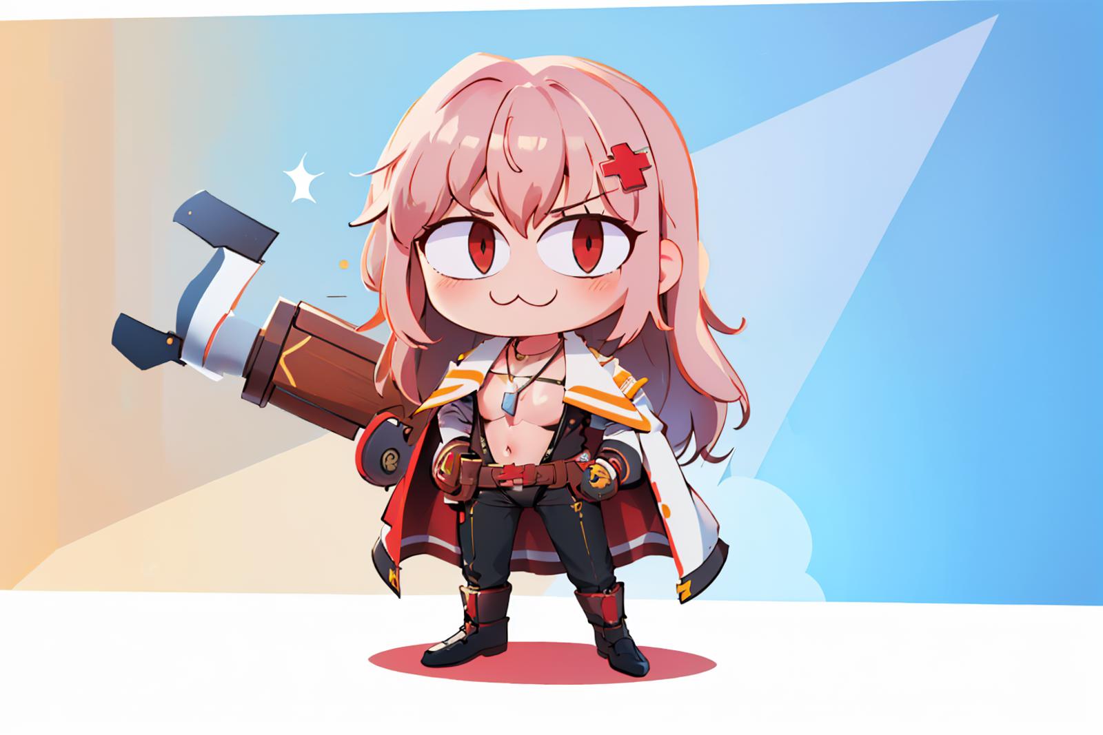 hair ornament, white coat, black gloves, red shirt, cleavage, leotard, belt, black pants