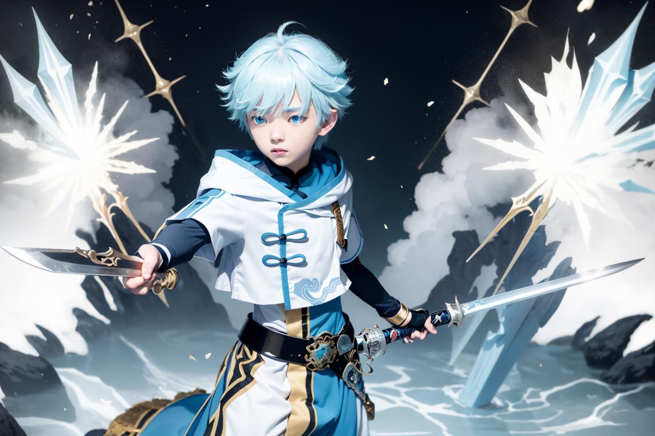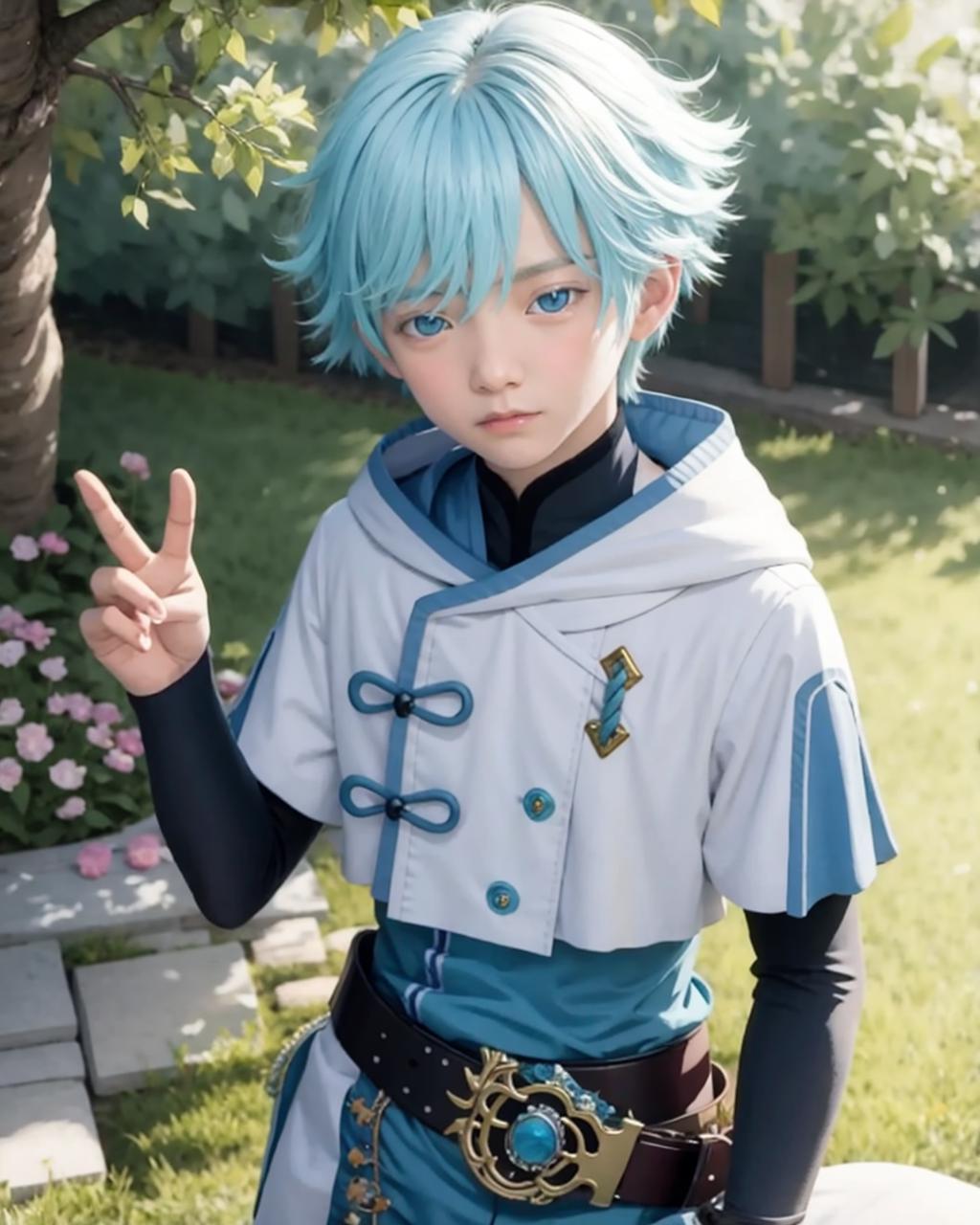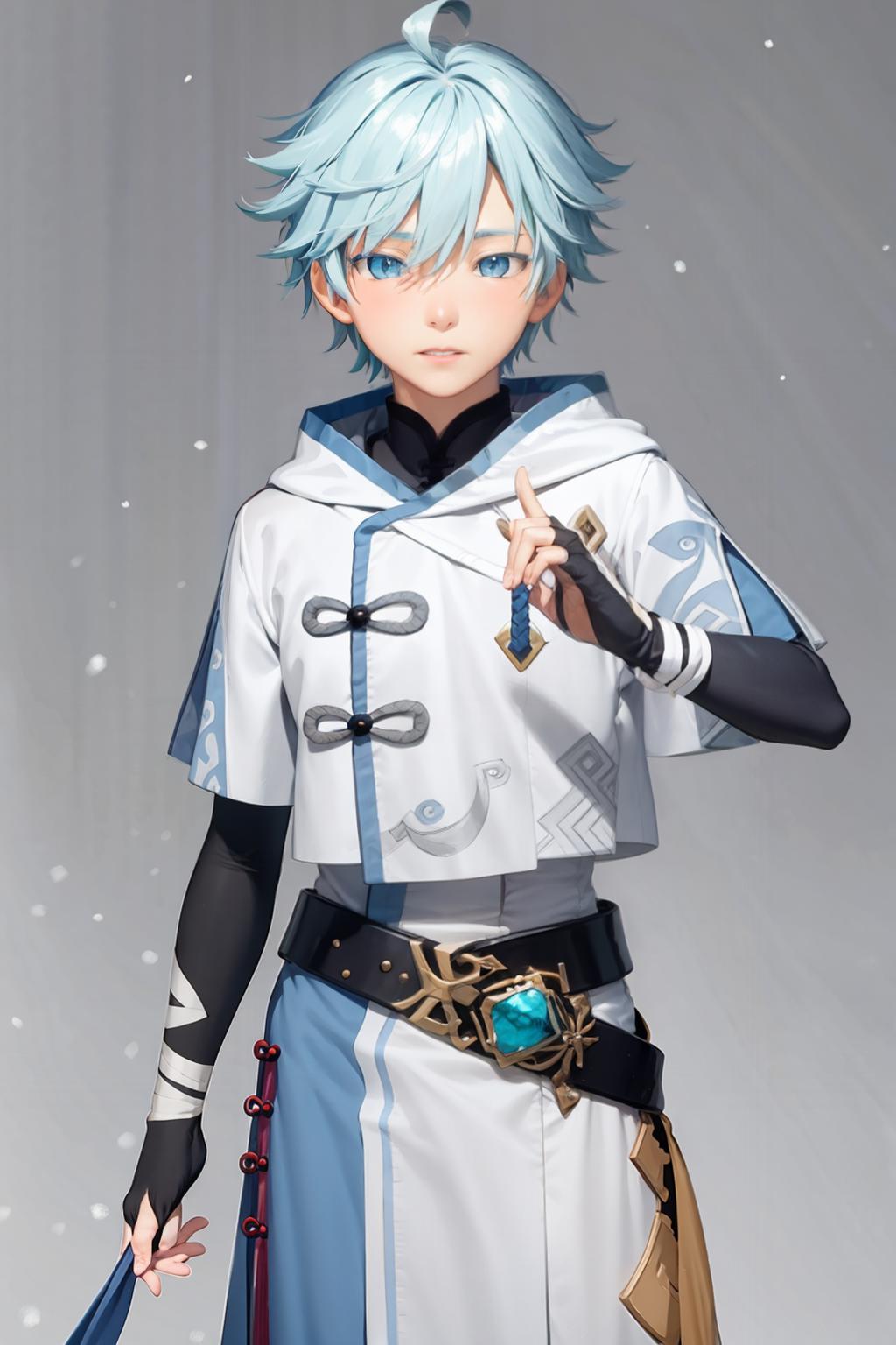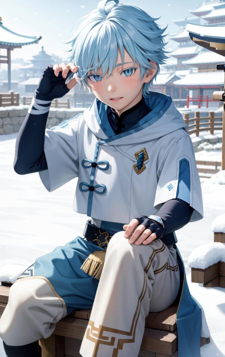 outdoors,snow,chongyun (genshin impact), 1boy, male child, solo, blue eyes, blue hair, gloves, ahoge, chinese clothes, short hair