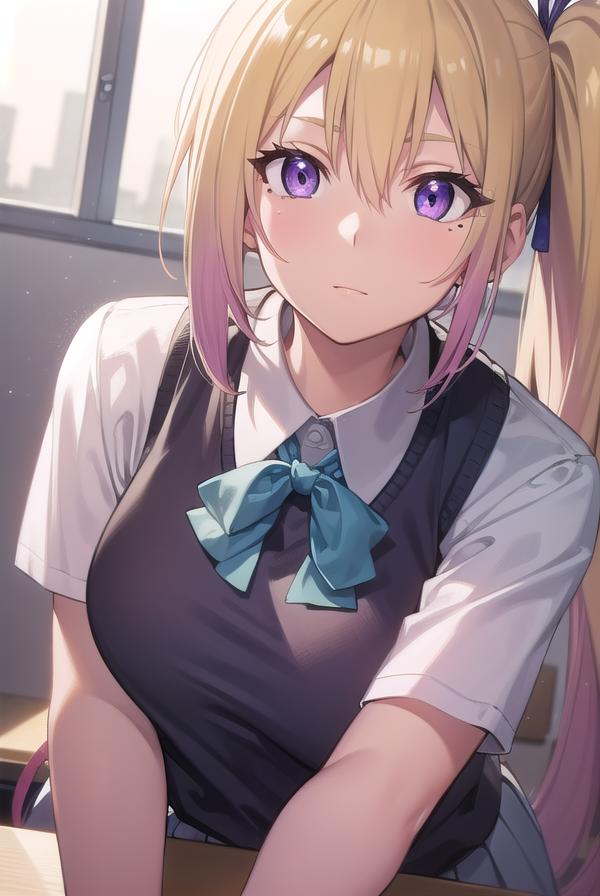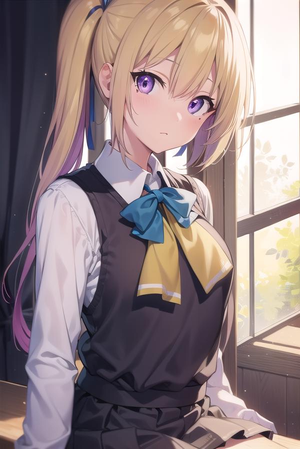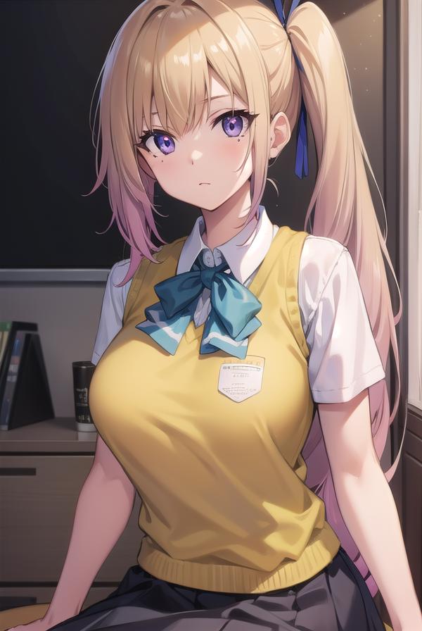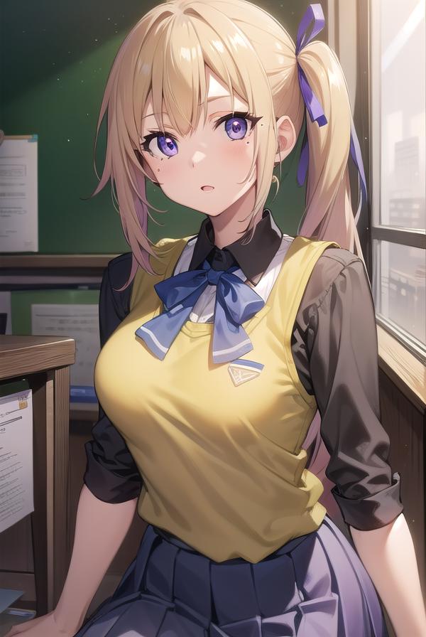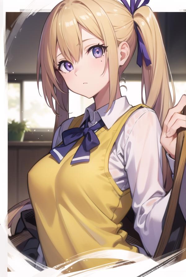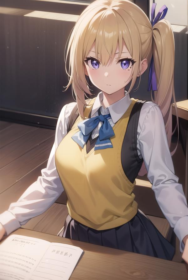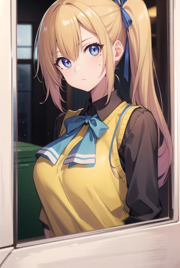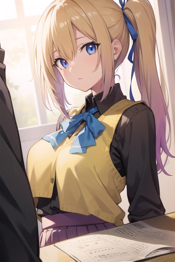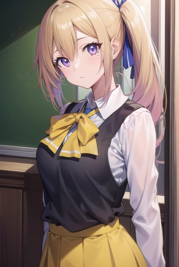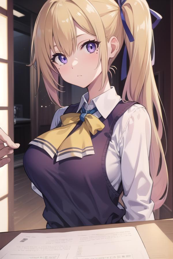 mai kawakami, blonde hair, hair ribbon, long hair, mole, mole under eye, ribbon, side ponytail, (purple eyes:1.2)