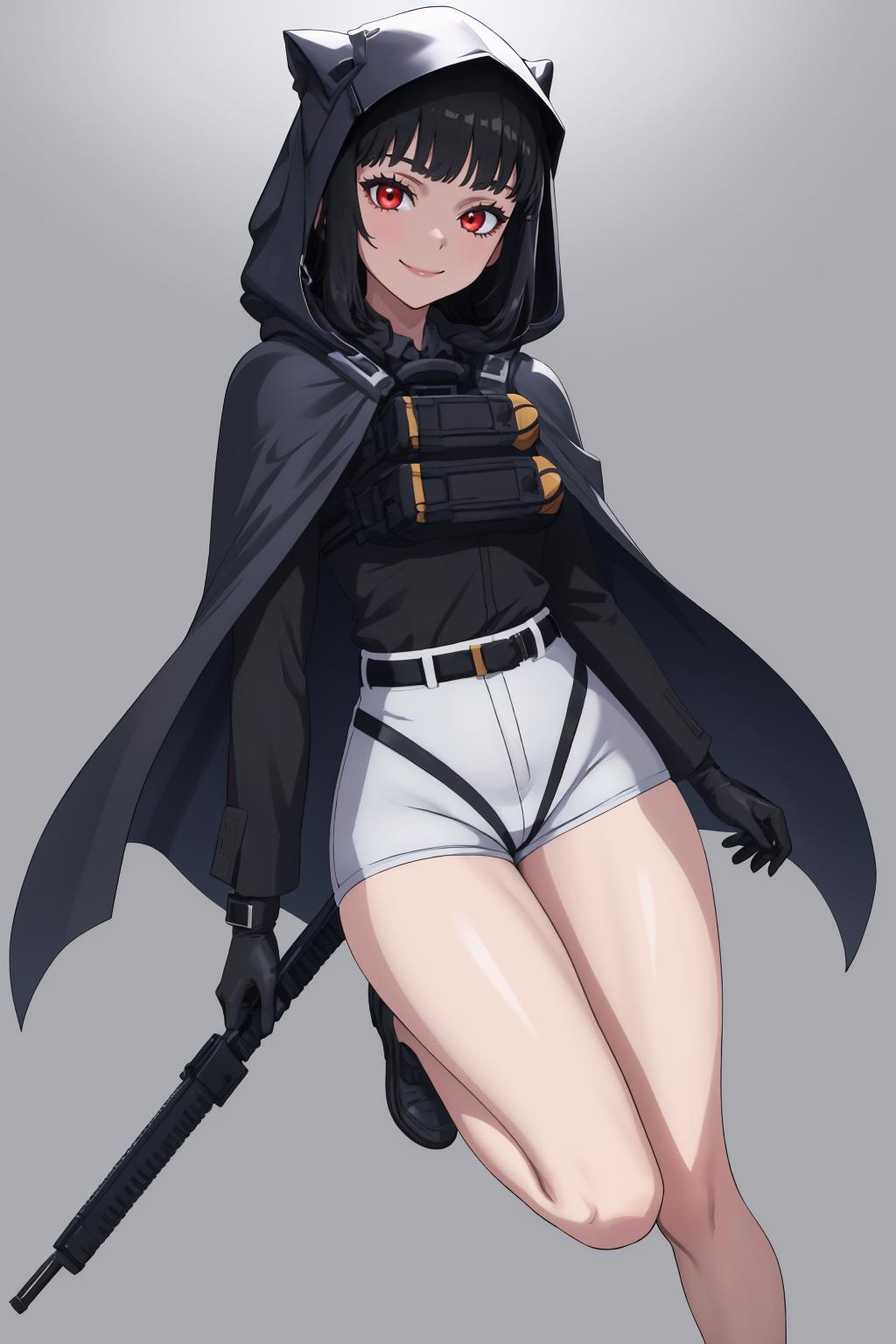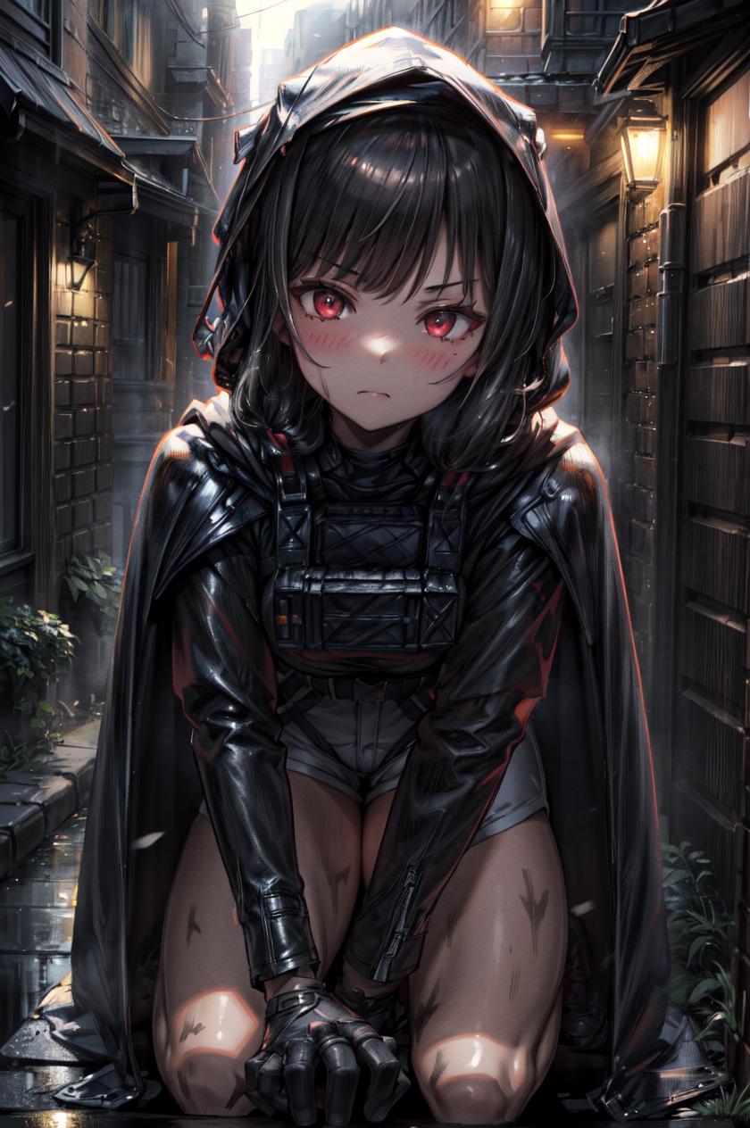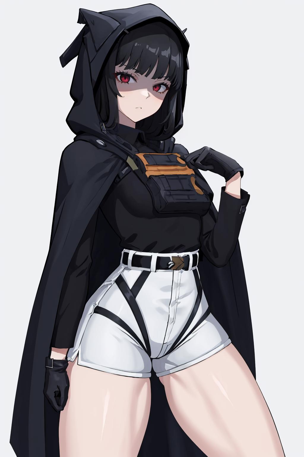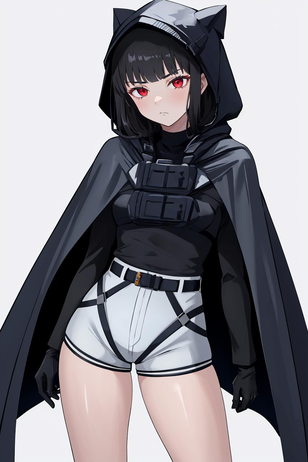 dnikke, long sleeves, hood up, black shirt, gloves, shorts, cloak, belt, tactical clothes