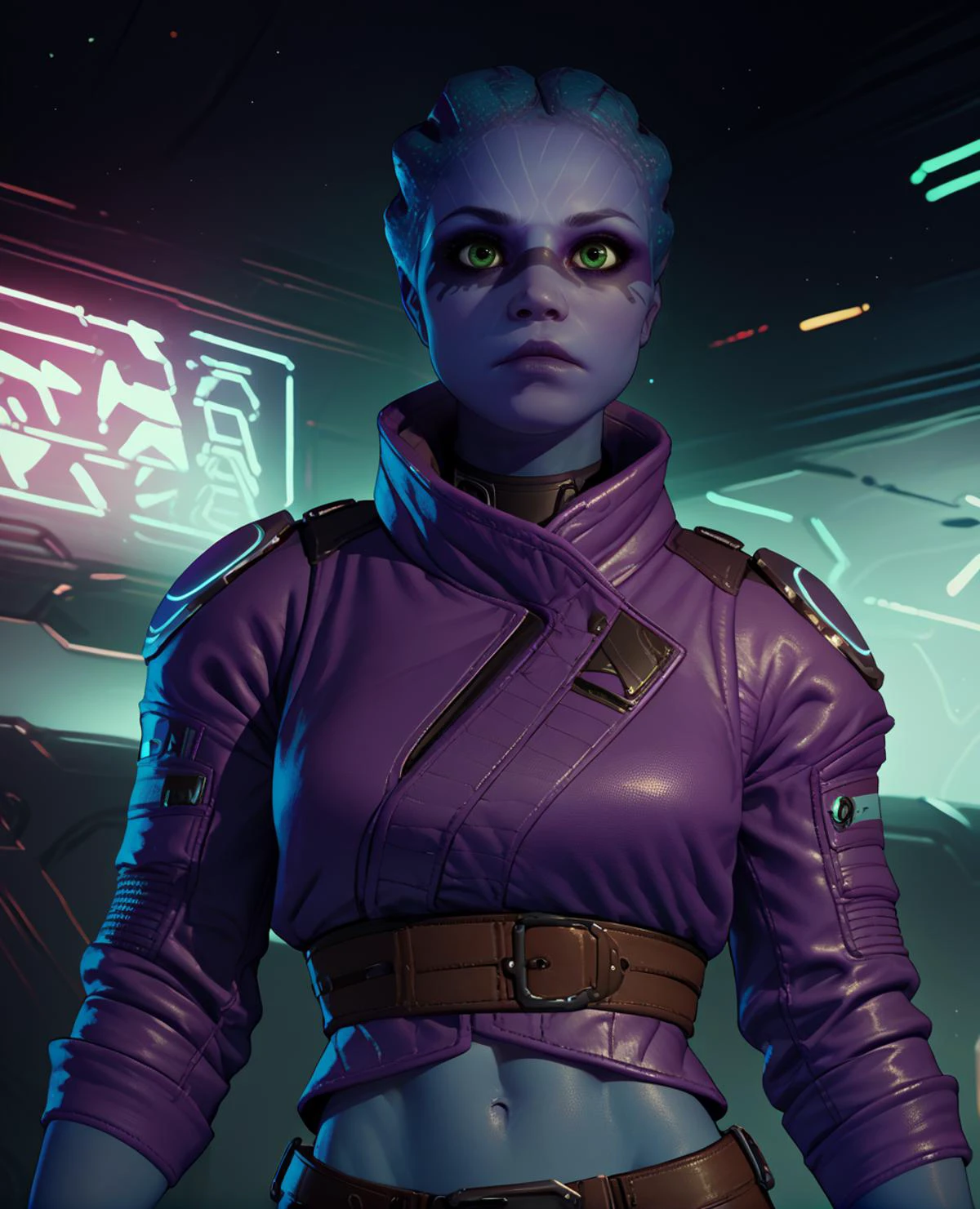 purple jacket ,midriff, pants, belt, black footwear, gloves , or fingerless gloves,