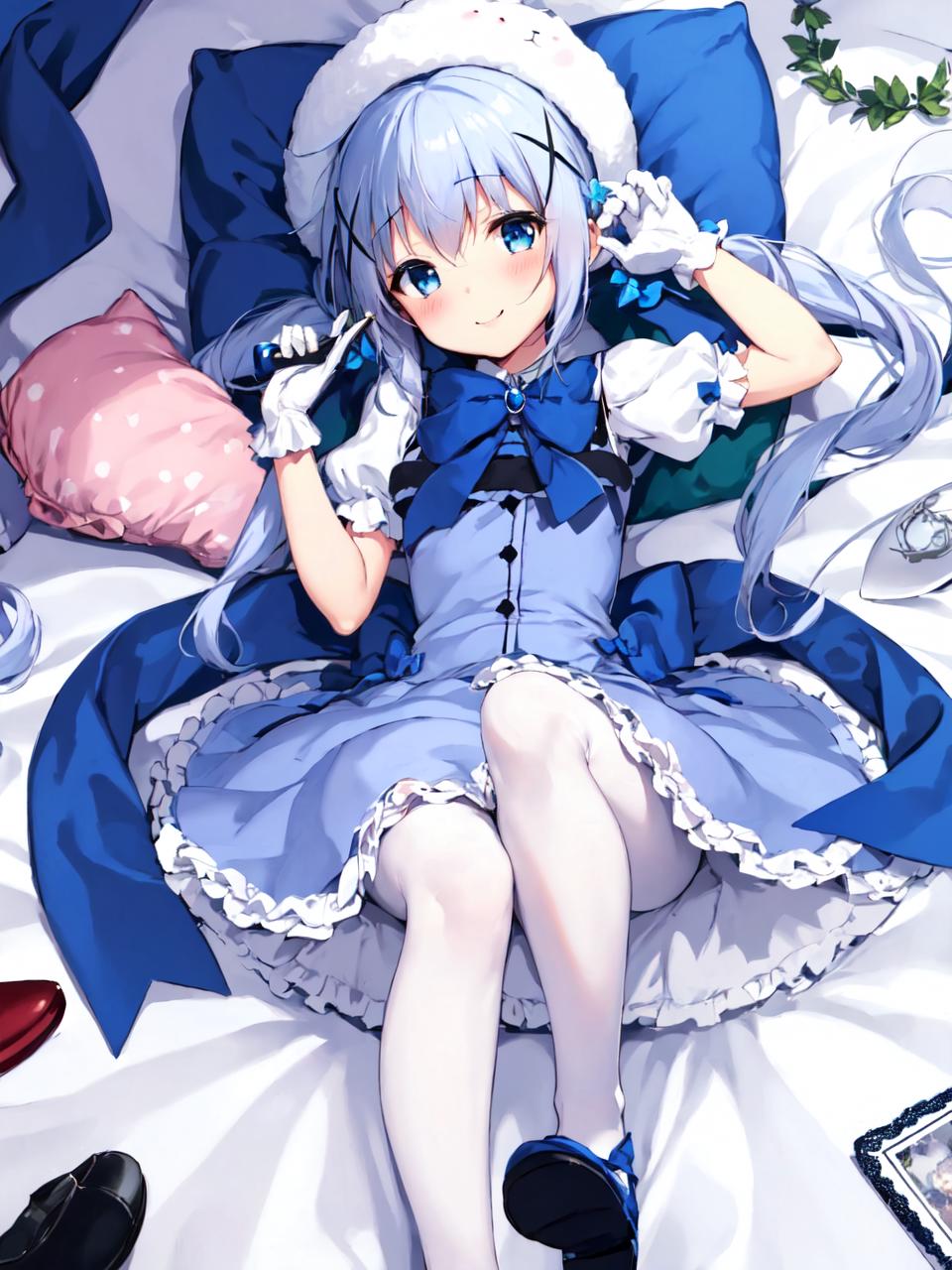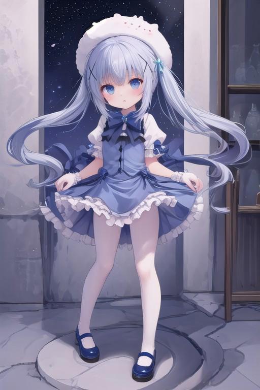 Recommend Tags: twintails, white headwear, x hair ornament, bowtie, blue footwear, blue ribbon, puffy short sleeves,