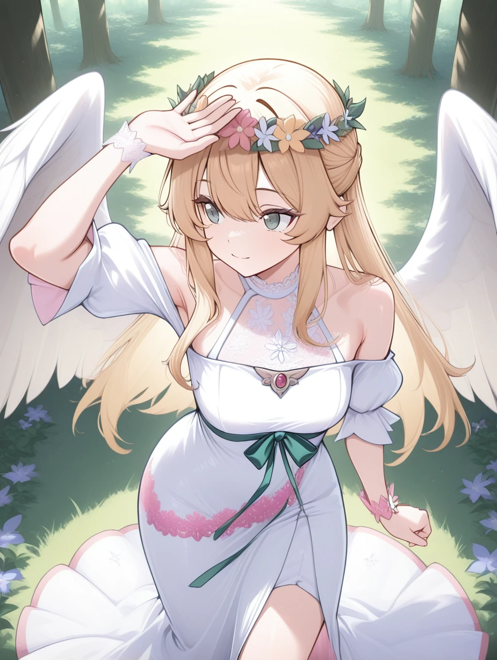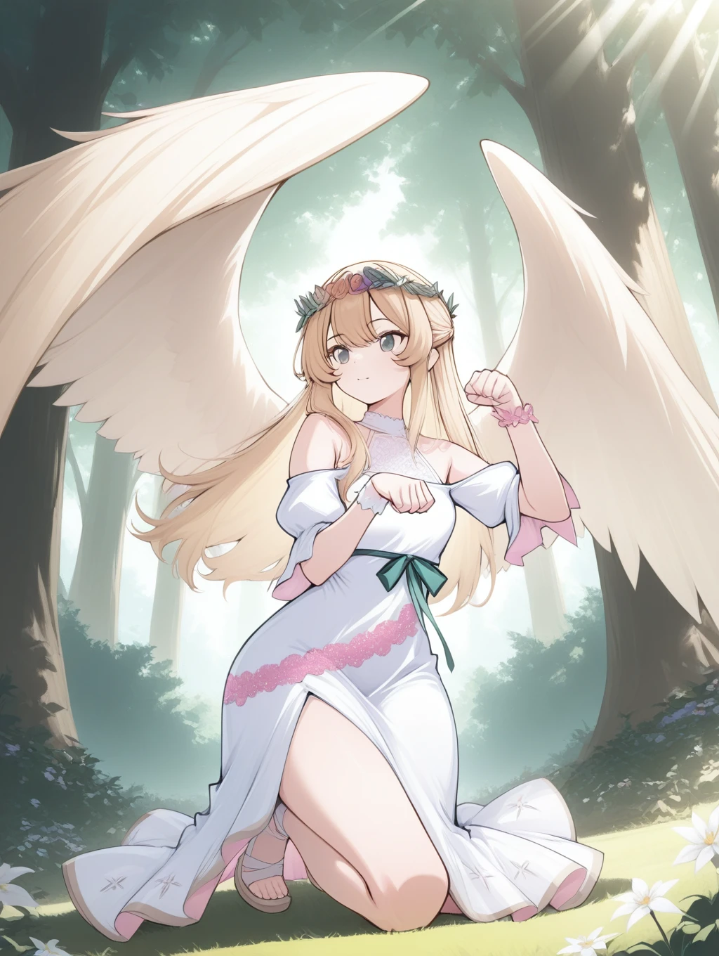 erisu,erisu,head wreath,blonde hair,long hair,green eyes,half updo,feathered wings,pink lace trim on dress,white dress,bare shoulders,lace halter neck,puffy sleeves,flower wristband,light green ribbon,front slit,forest,sunbeam,pink lace,