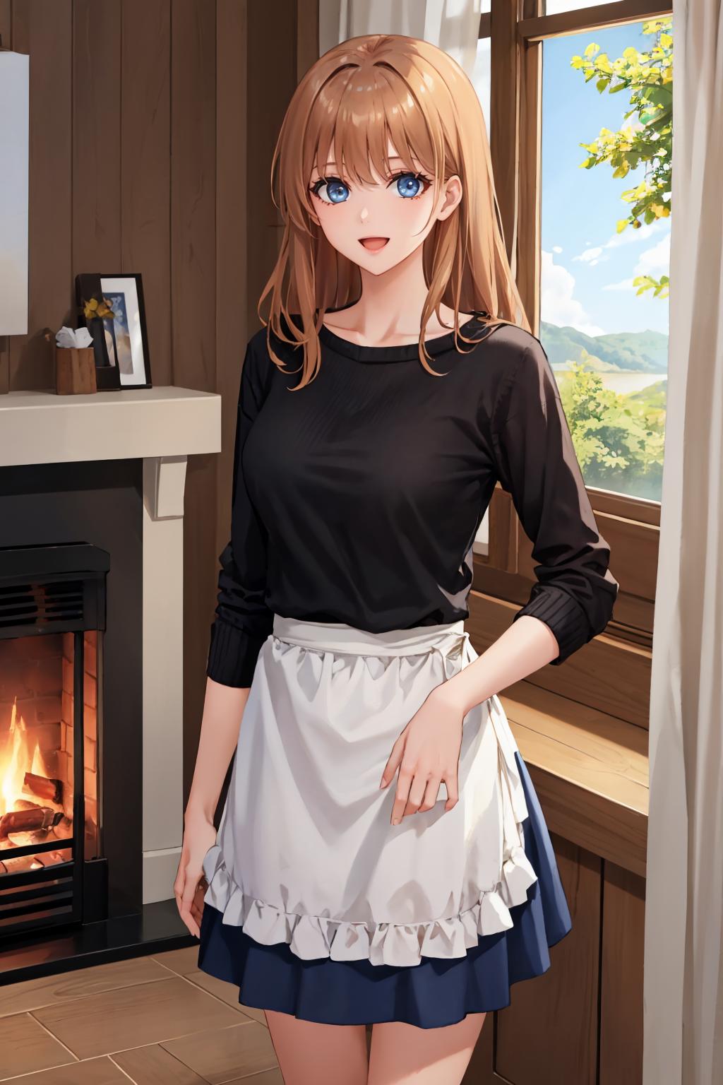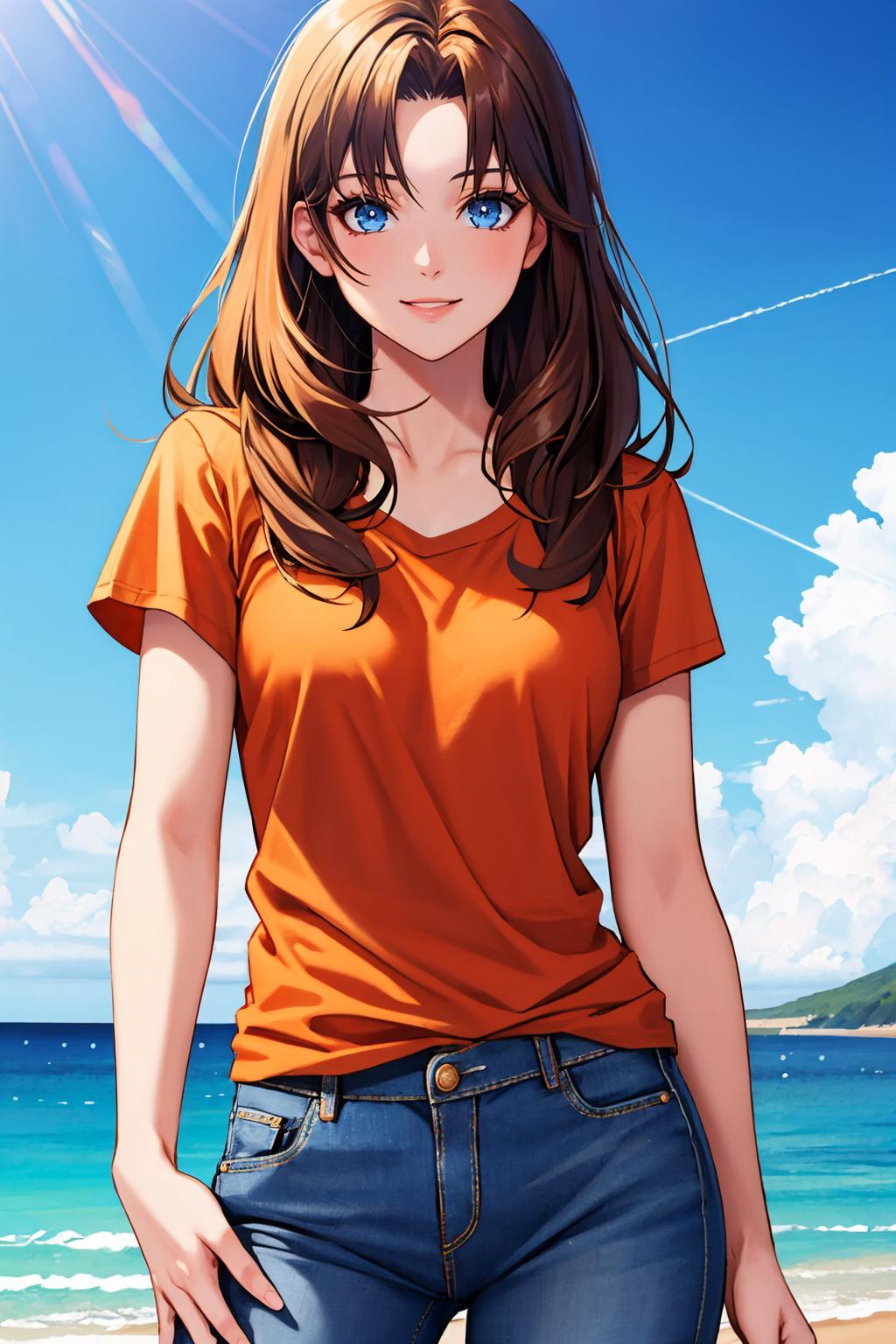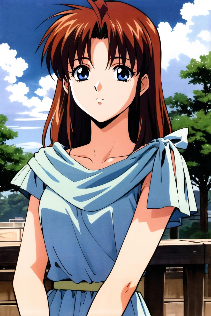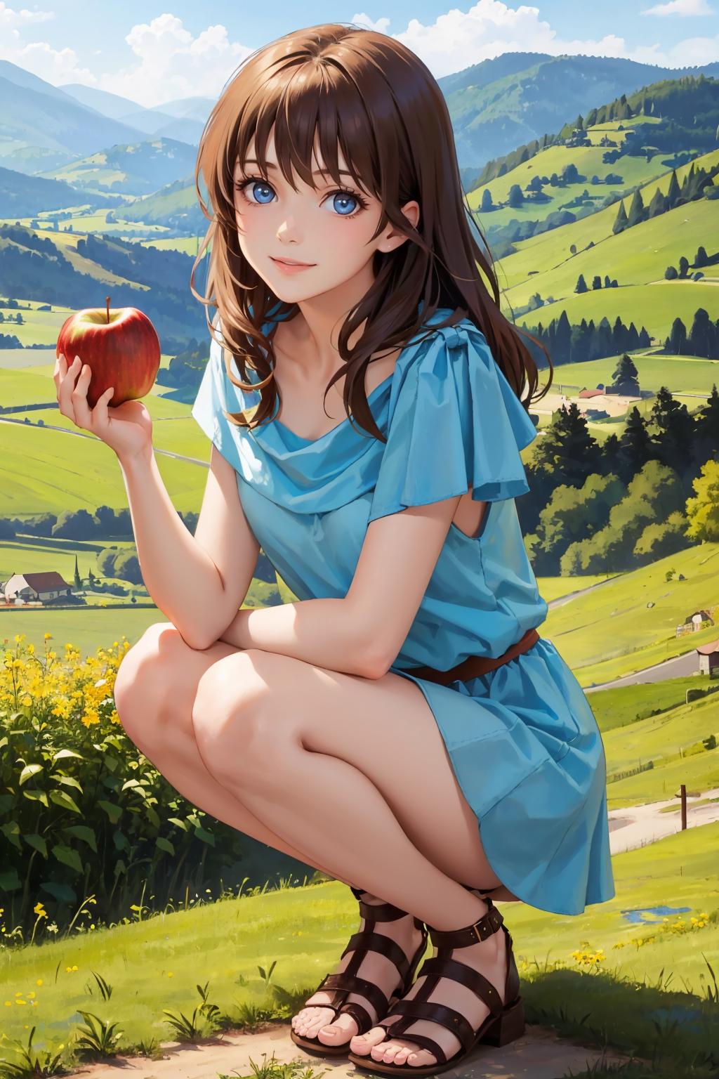 Add "blue dress, sandals" for her typical look.