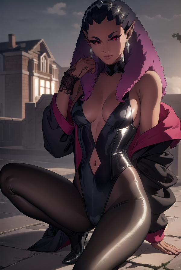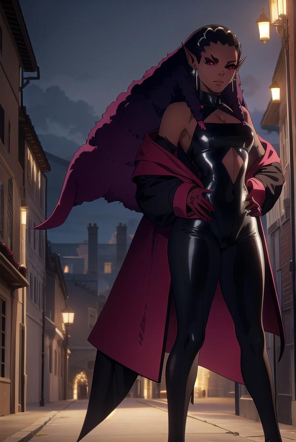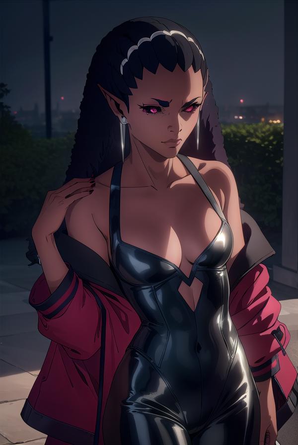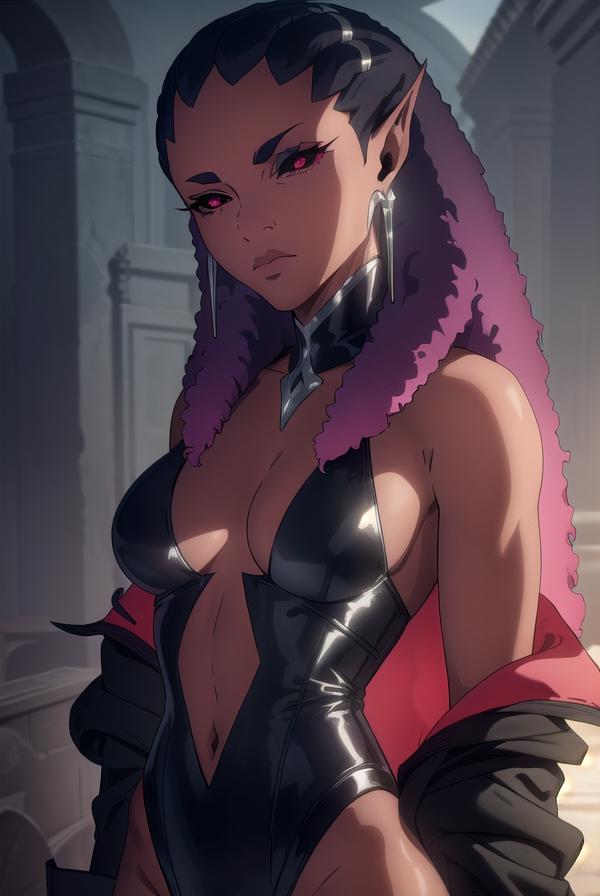 castlevaniadrolta, black hair, (red eyes:1.5), pointy ears, dark skin, dark-skinned female, colored sclera, black sclera, purple hair, gradient hair, two-tone hair,