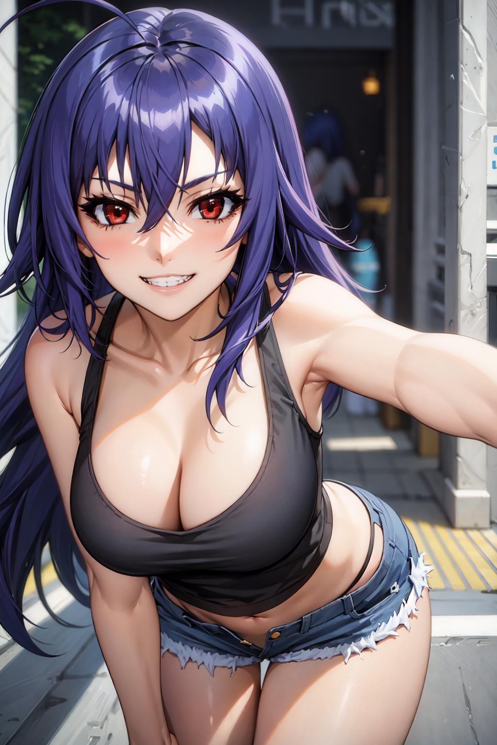 Character: kurokami medaka, red eyes, blue hair, long hair, ahoge, ?????????????
