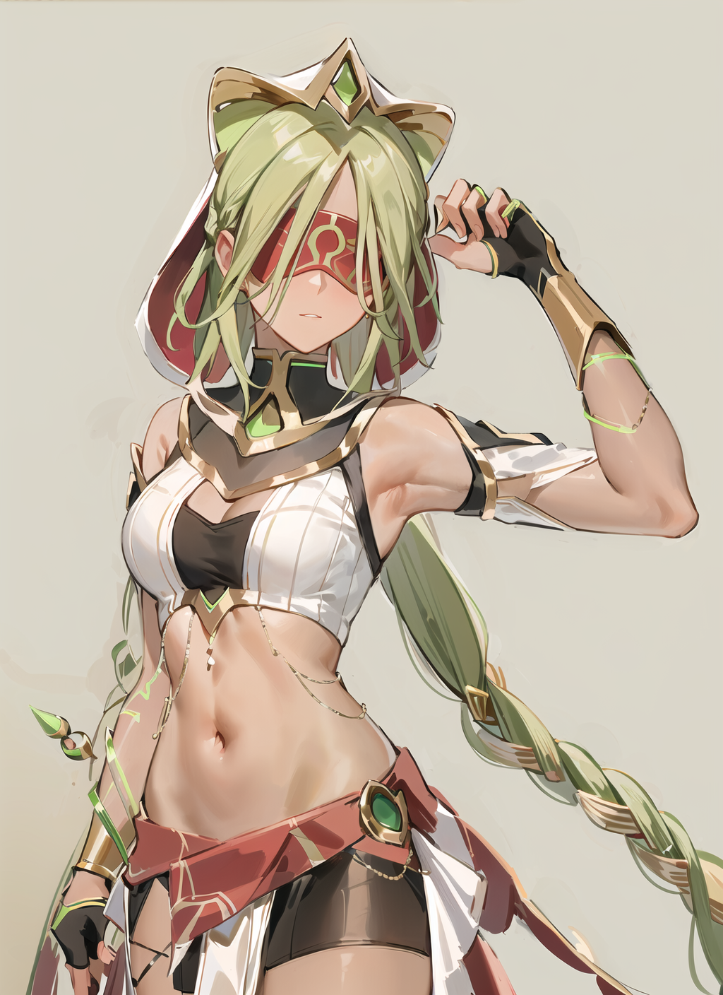 Trigger prompts: red blindfold, twin braids, armlet, fingerless gloves, headdress
