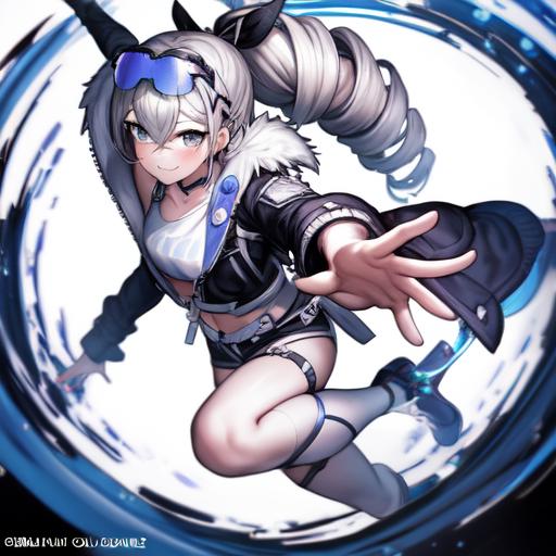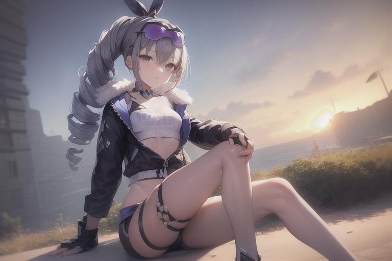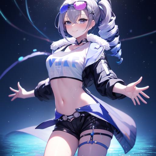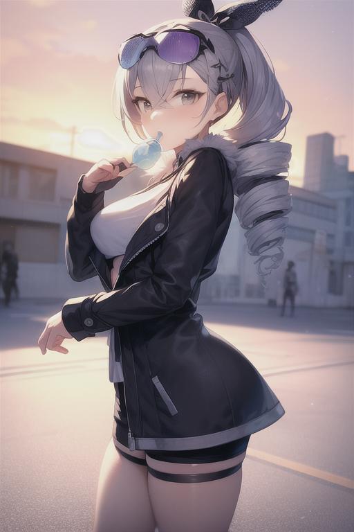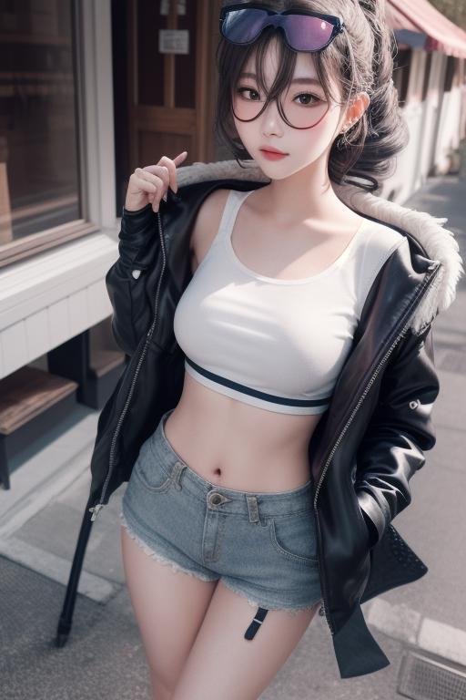 Accompanying prompts: hair drill, coat, shorts, eyewear on head, chewing gum