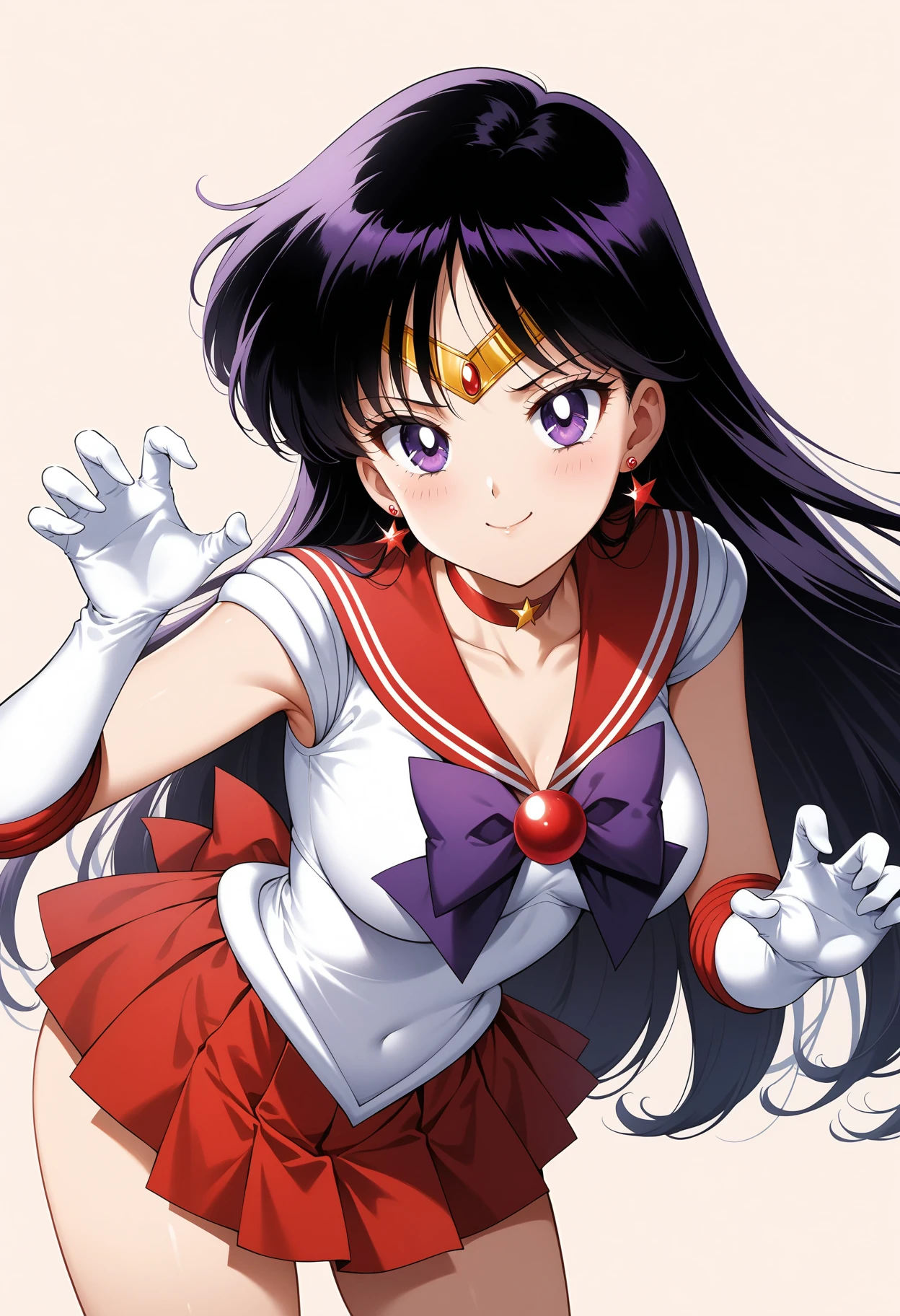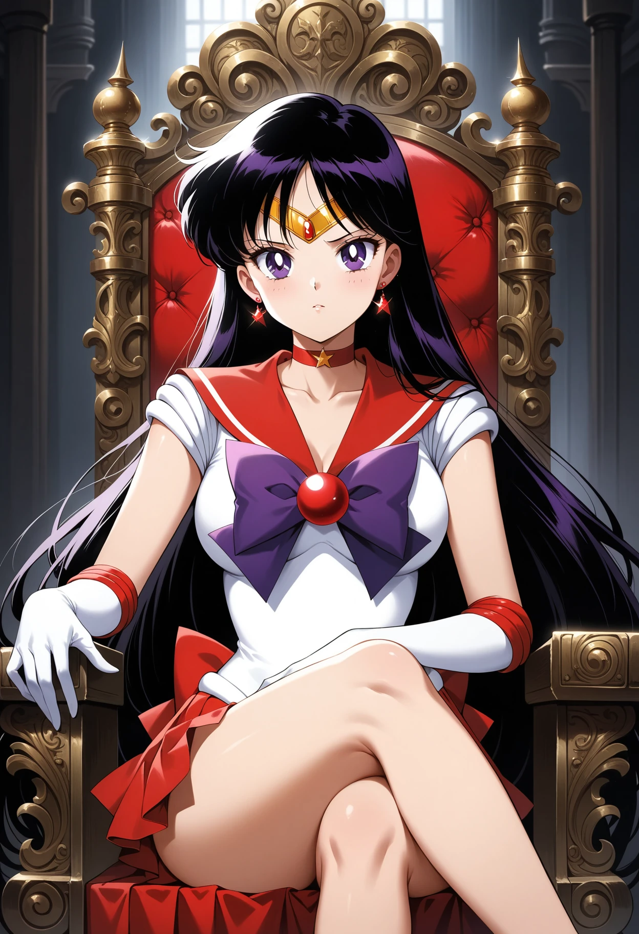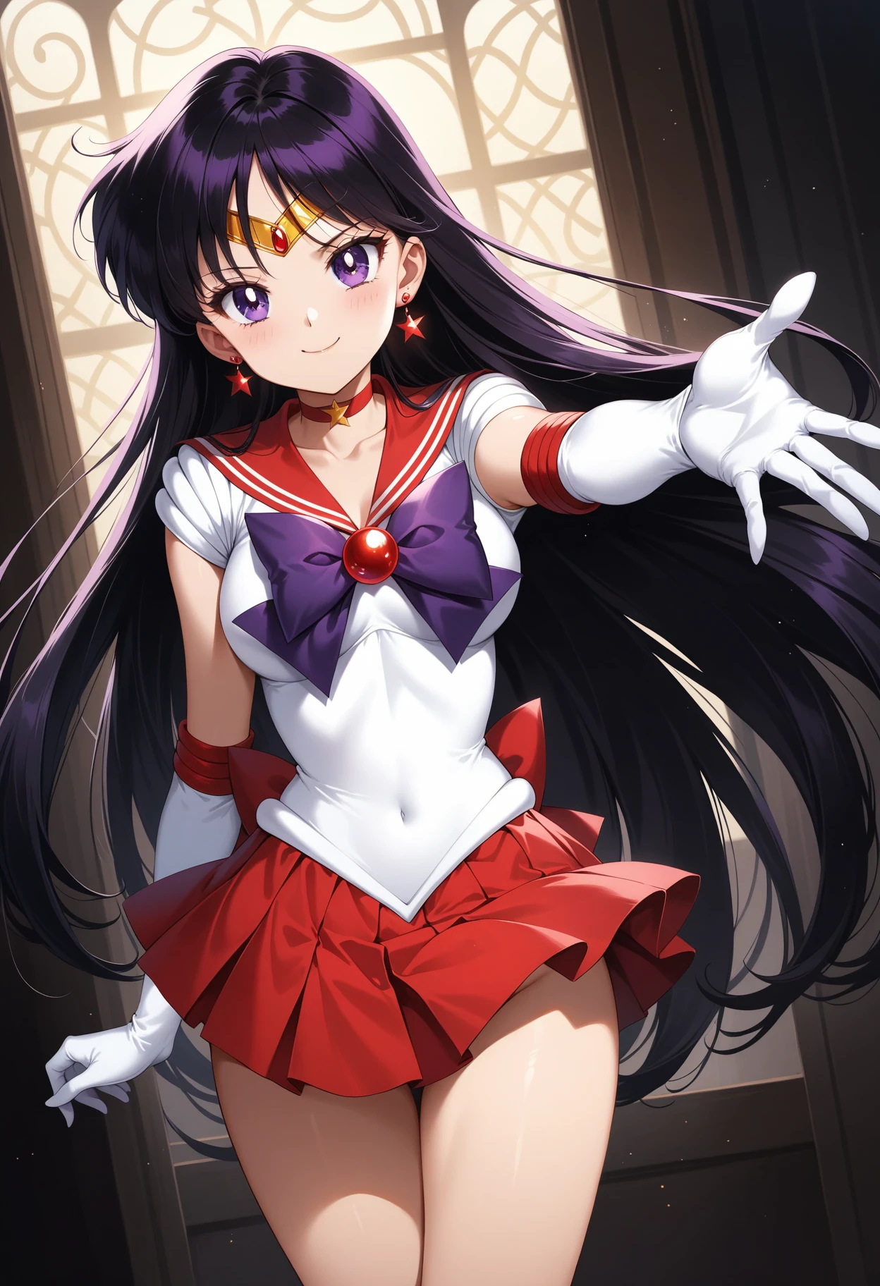 aamars, long hair, black hair, tiara, earrings, red choker, red sailor collar, purple bowtie, white shirt, elbow gloves, white gloves, pleated skirt, red skirt, bare legs
