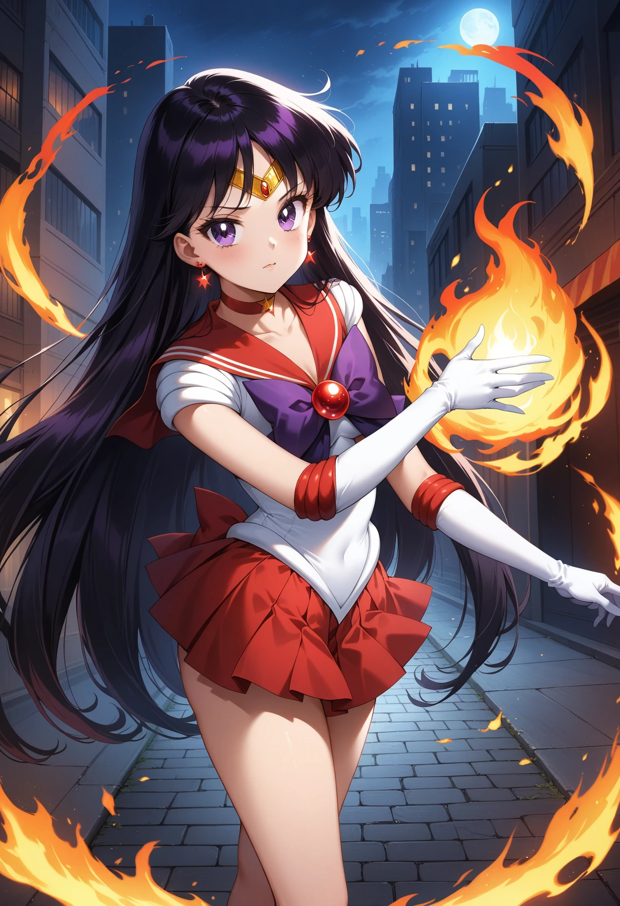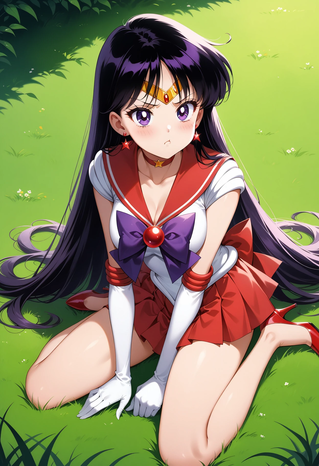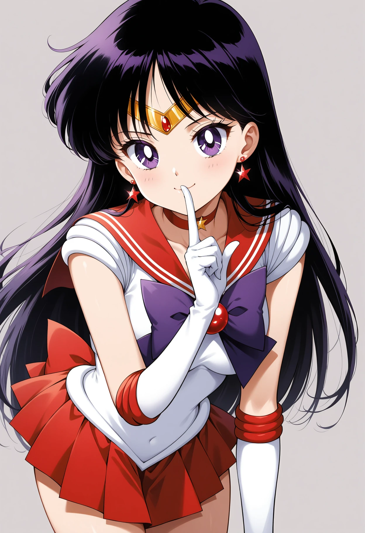 aamars, long hair, black hair, tiara, earrings, red choker, red sailor collar, purple bowtie, white shirt, elbow gloves, white gloves, pleated skirt, red skirt, bare legs