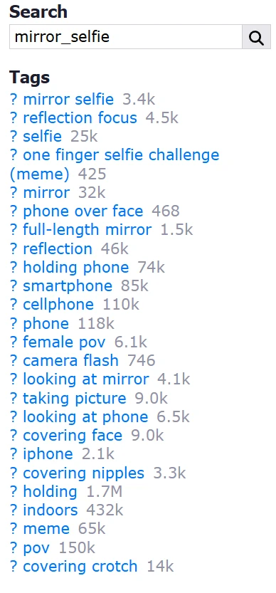 For example, i want my character to take mirror selfie because i want to create an Instagram account for her and manage it. For this i need to find my main tag for composition, which is `mirror selfie` for this image. When i search mirror selfie, i can find that tag on Danbooru, that means it's better to use this tag. But using one tag for entire composition can increase randomness of image. If we include wrong generations to this, there is small chance to get what you want in a few attempts if you are not lucky.