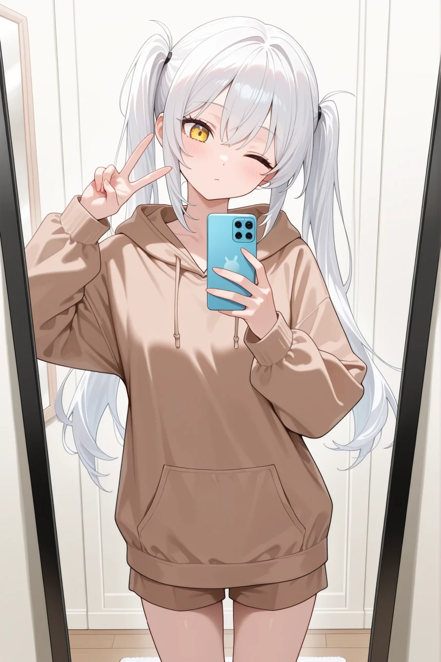 After that, i can use other supportive tags to edit my base pose such as `v`for her hand pose and `head tilt` + `one eye closed` for her head. I can keep editing her pose with changing supportive tags without touching my base pose tags. Which is `mirror selfie, looking at phone, holding phone, full-length mirror` for this subject.