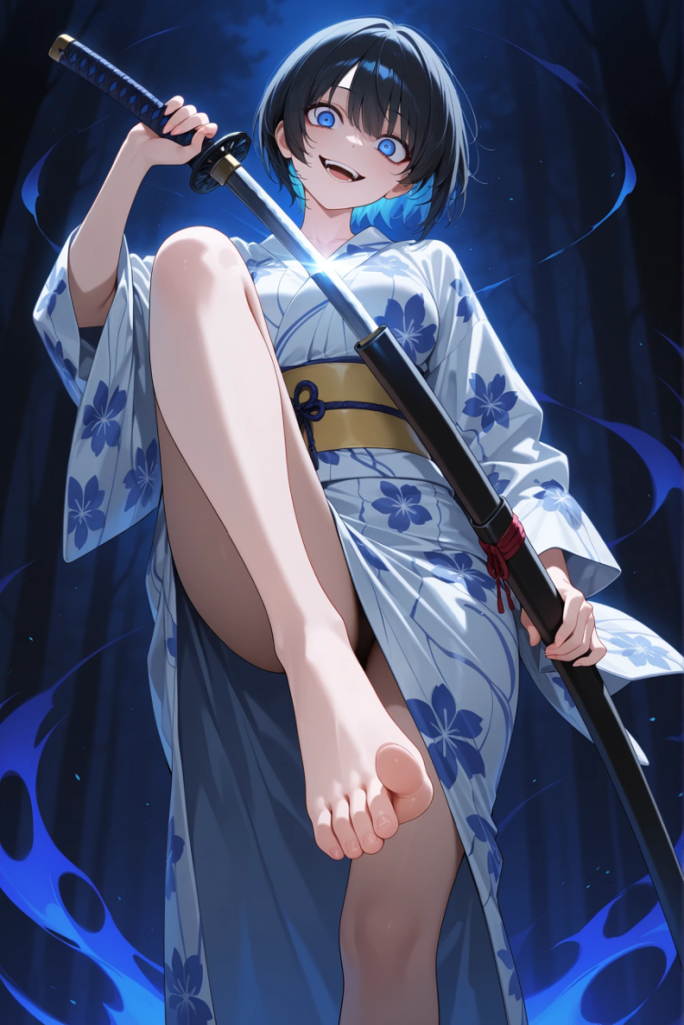 `masterpiece, best quality, amazing quality, newest, very aesthetic, solo, 1girl, black hair, short hair, blue eyes, yukata, front view, standing on one leg, knee up, feet focus, barefoot, holding katana, holding ?, un?ing katana, head tilt, crazy eyes, crazy smile, dark aura, looking at viewer, absurdres, highres`