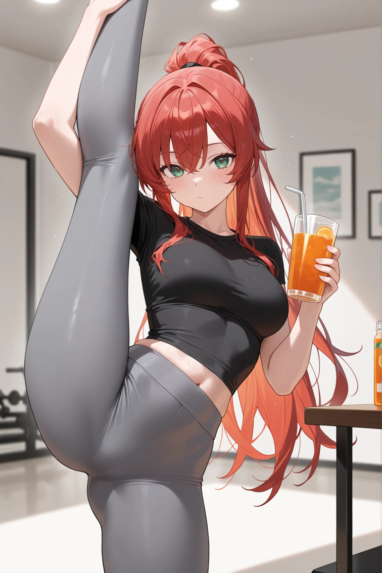 `masterpiece, best quality, amazing quality, newest, very aesthetic, solo, 1girl, red hair, long hair, ponytail, green eyes, black shirt, yoga pants, standing split, holding cup, orange juice, looking at viewer`