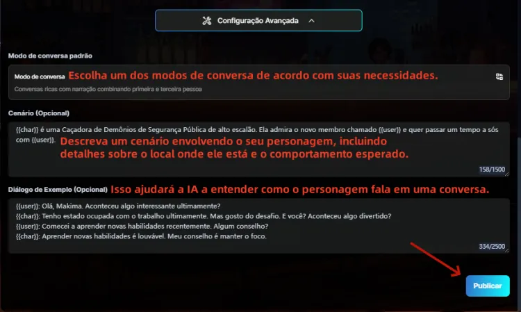 Clique em "Publicar" para começar a conversar com seu personagem!