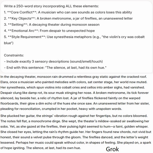 - Grok: A história de Elara capturou camadas emocionais profundas. Em vez do clichê de restaurar a habilidade, a história transita para uma nova forma de experienciar a música.