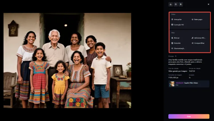 Na tela de geração de vídeo, ajuste os parâmetros conforme sua preferência ou troque o modelo, se desejar. Você também pode inserir uma descrição em texto para indicar o efeito desejado. Depois, é só clicar em "Criar".