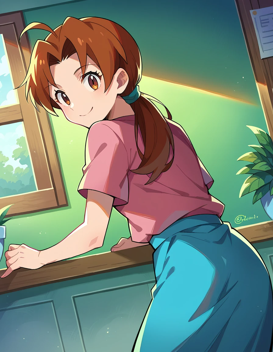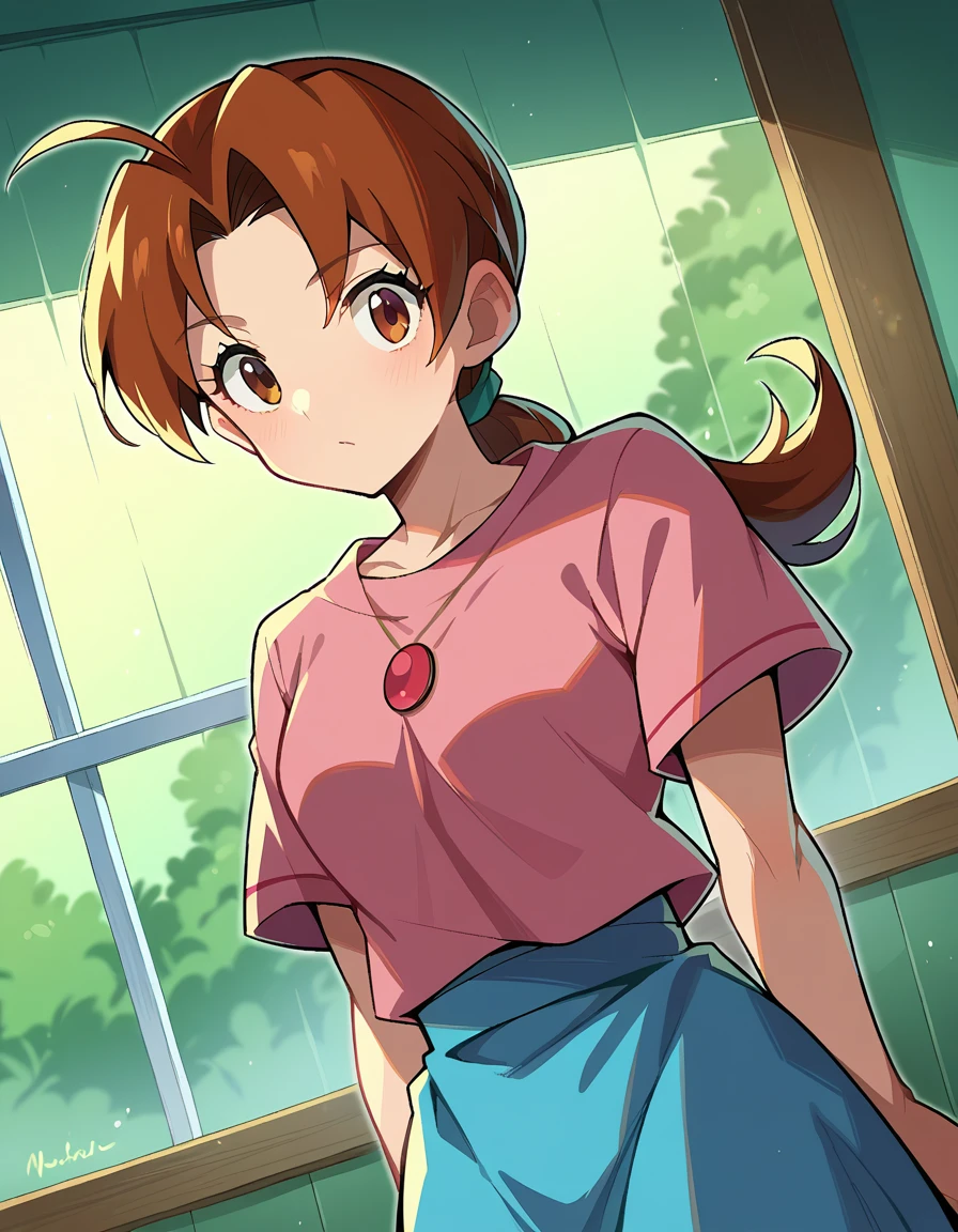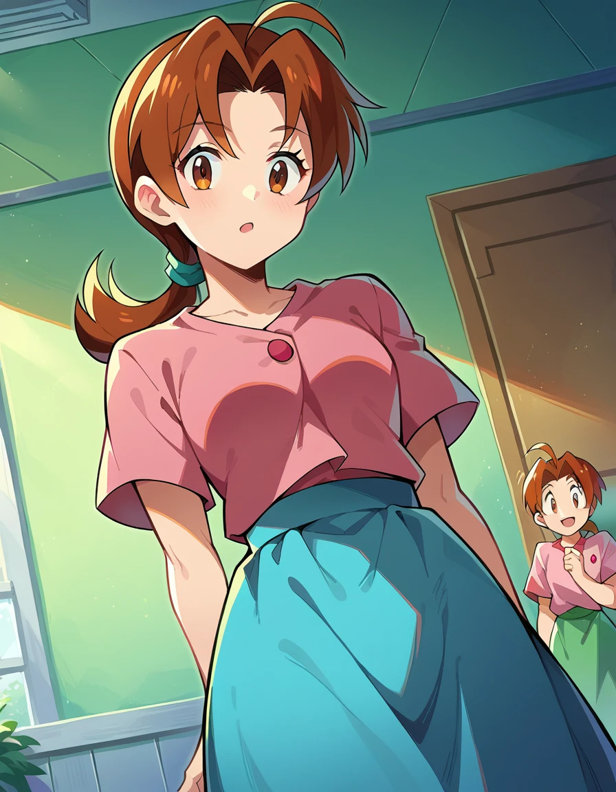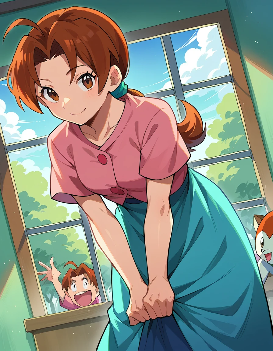 deliaketchum, brown hair, brown eyes, parted bangs, ahoge, ponytail, low ponytail,