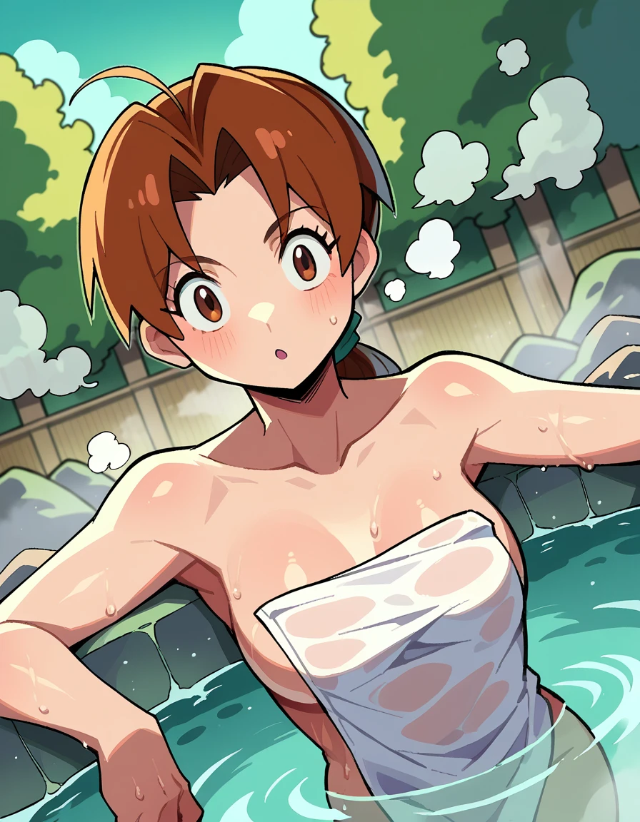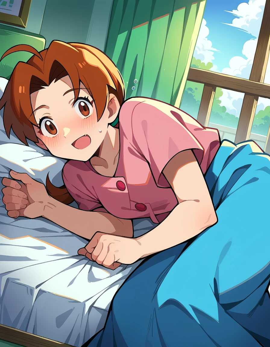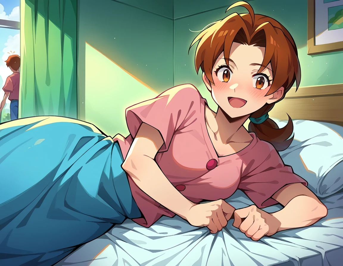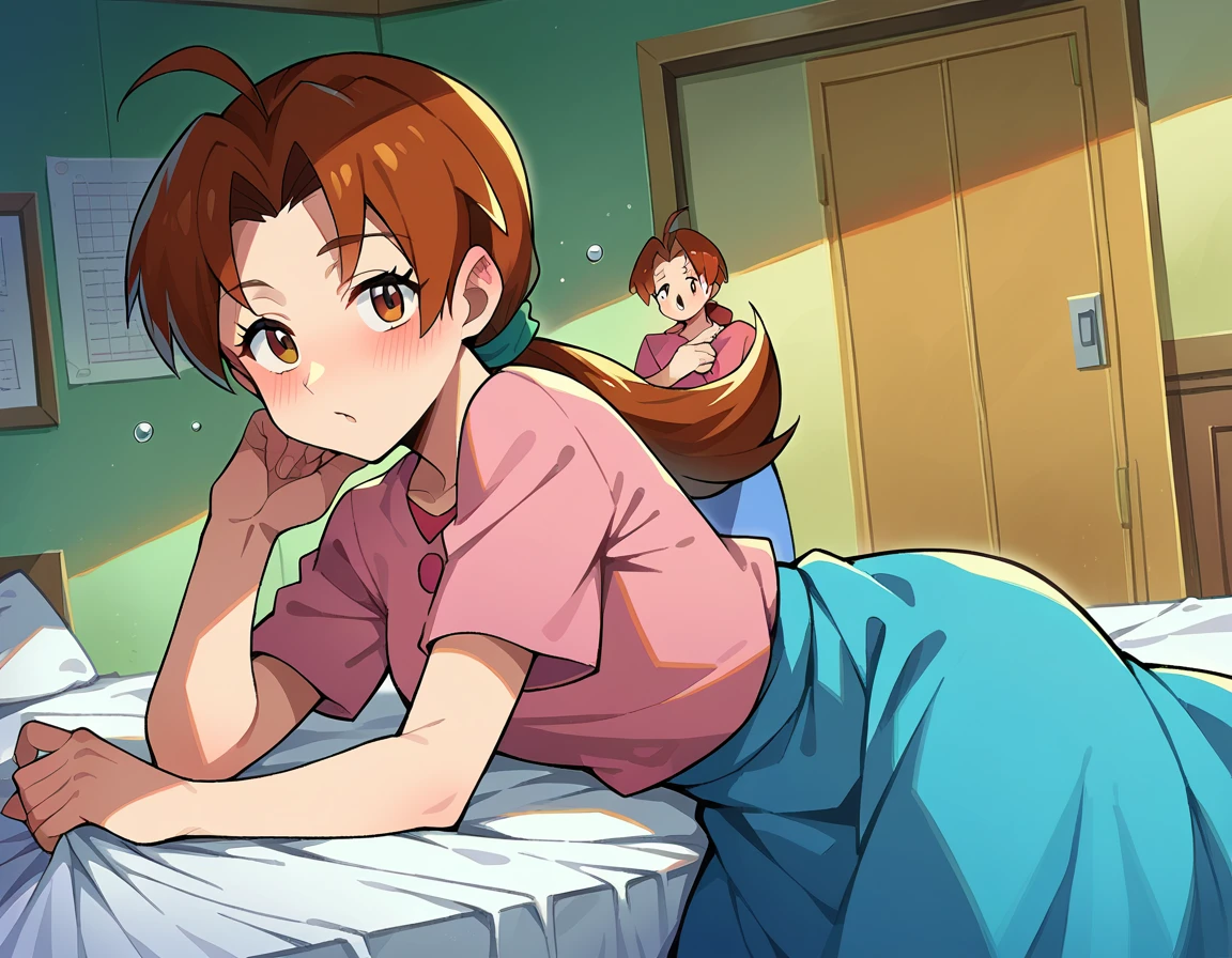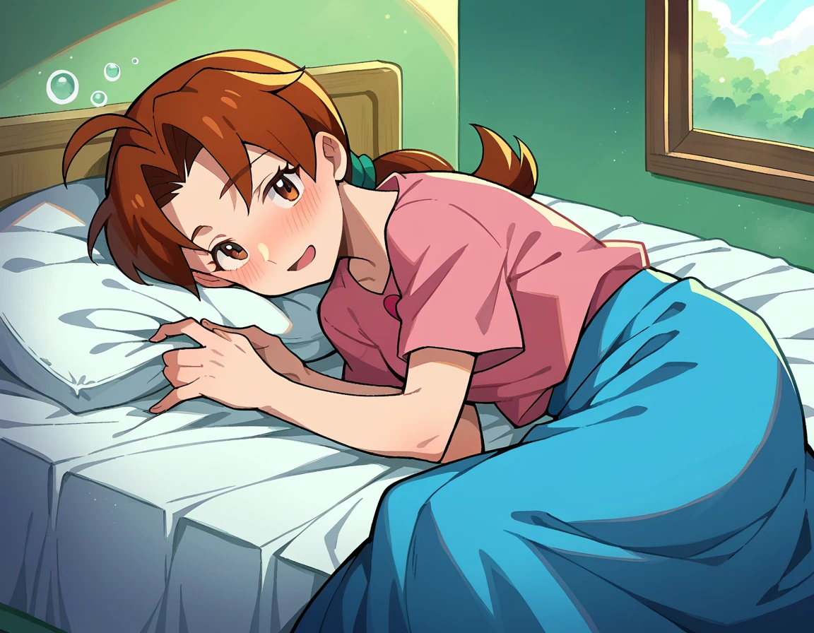 deliaketchum, brown hair, brown eyes, parted bangs, ahoge, ponytail, low ponytail,