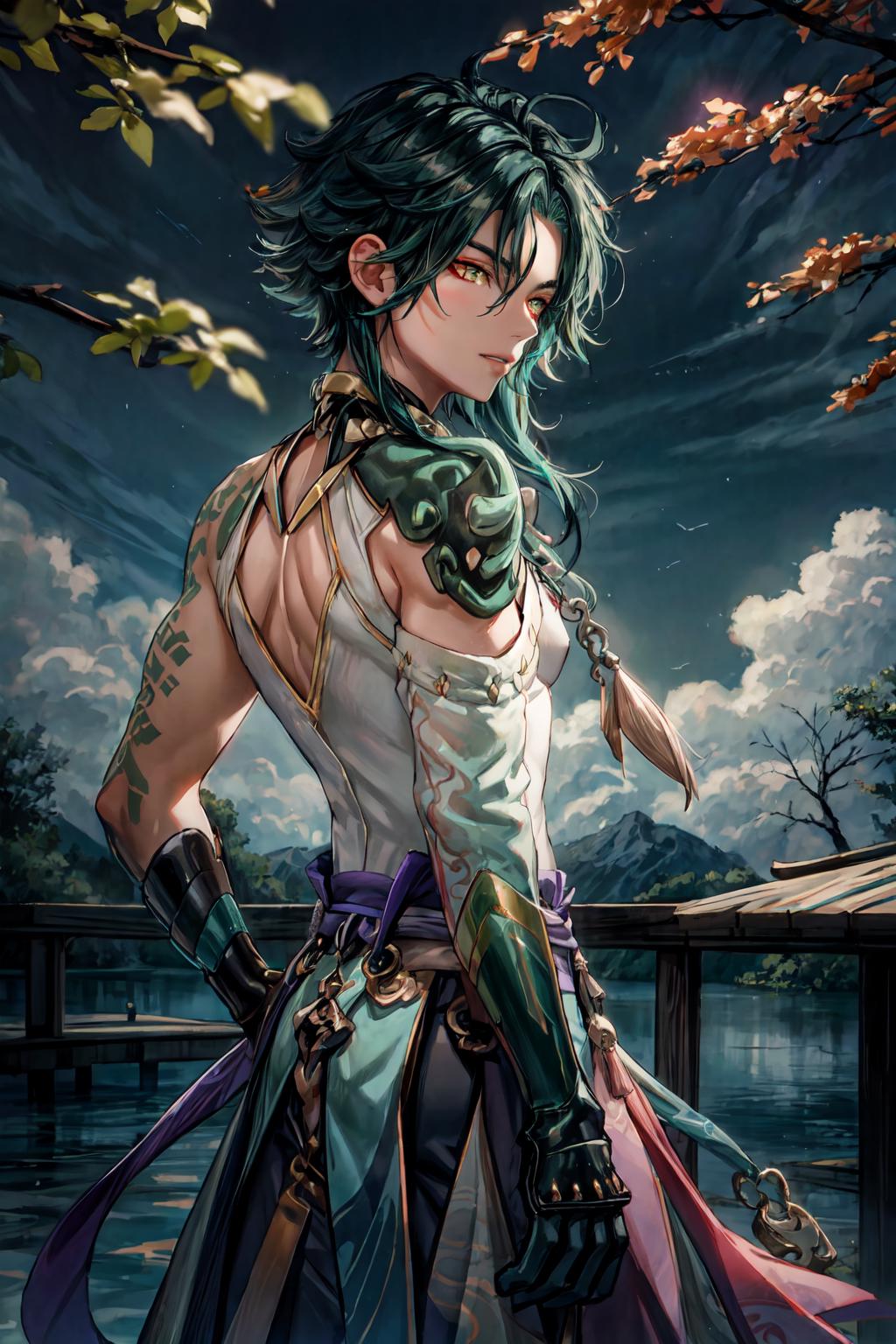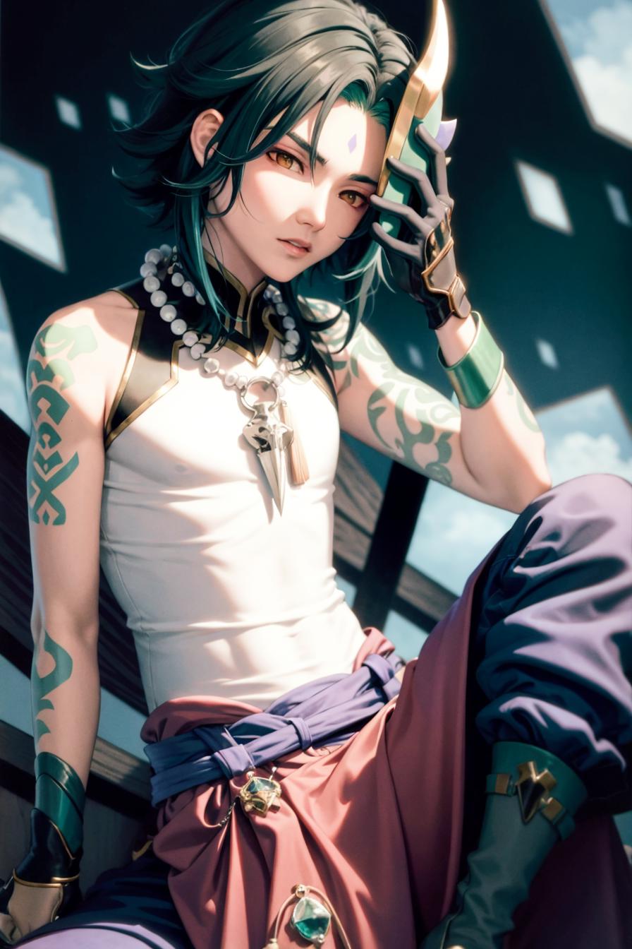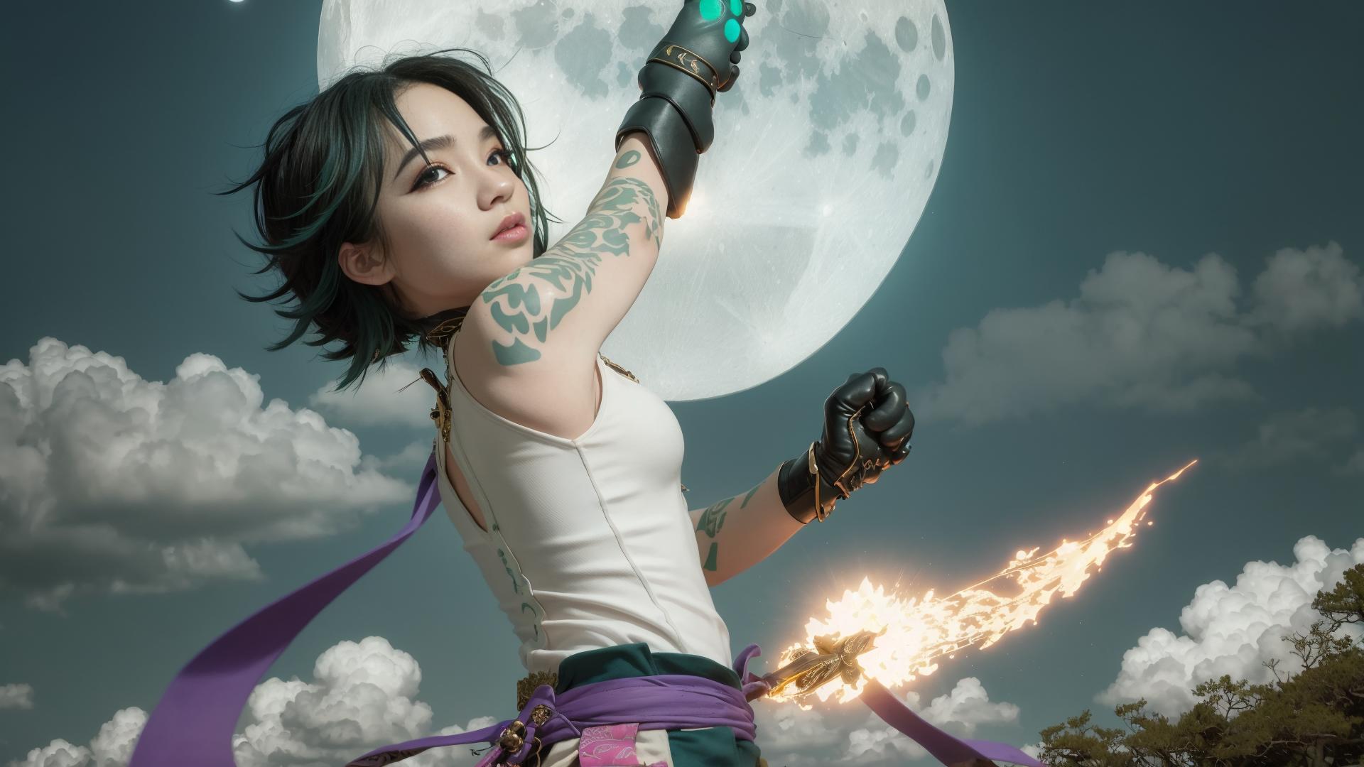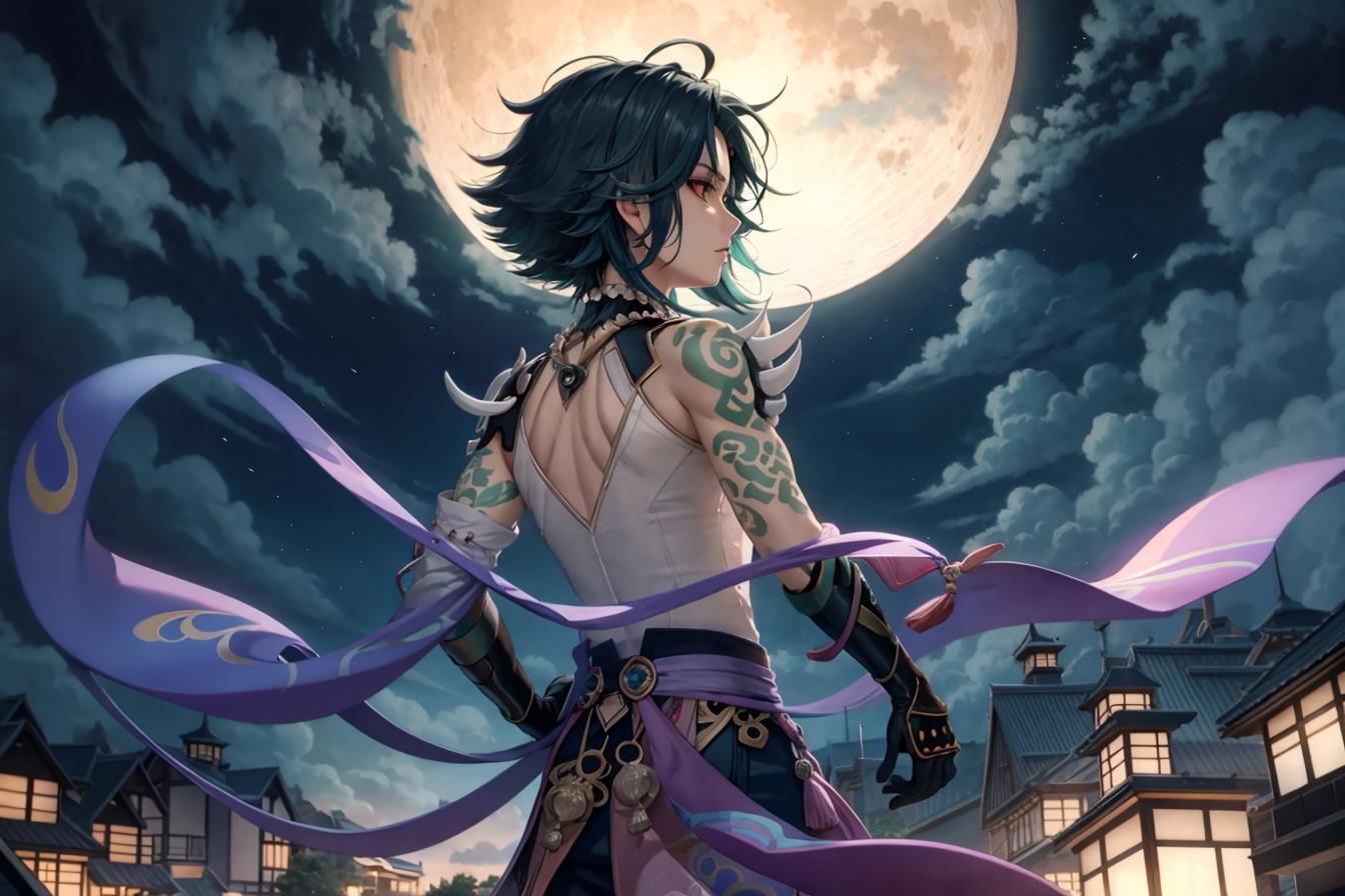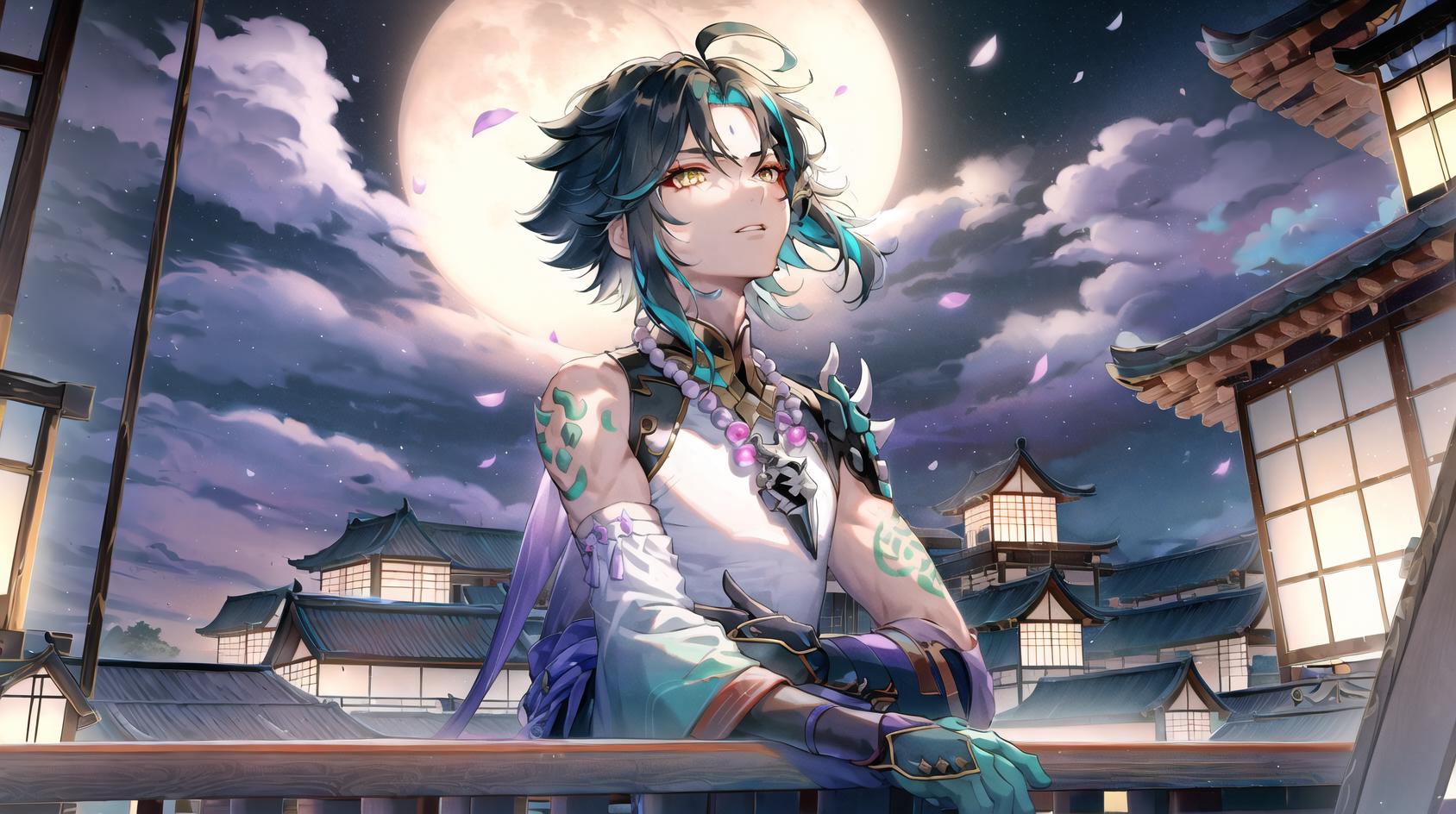 1boy, male focus, solo, xiao (genshin impact), gloves, tattoo, arm tattoo, necklace, cloud, jewelry, mask, sky, green hair, bead necklace, multicolored hair, night, beads, yellow eyes, moon, looking at viewer, weapon, cloudy sky