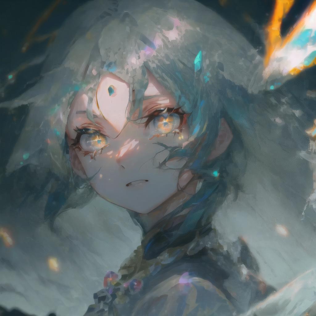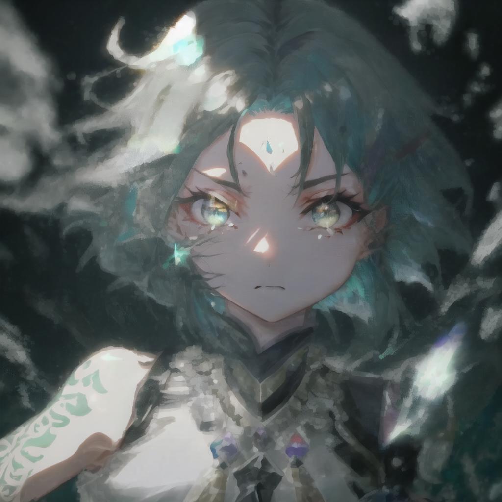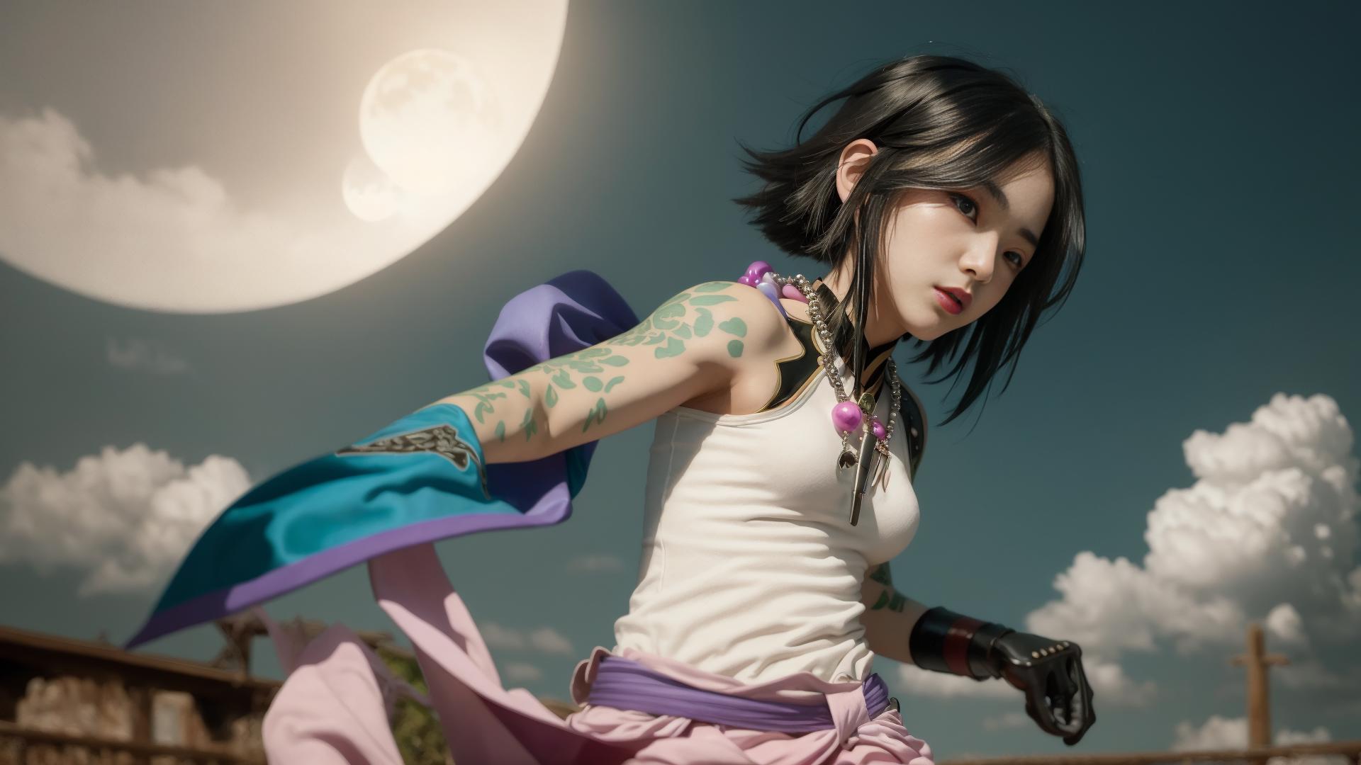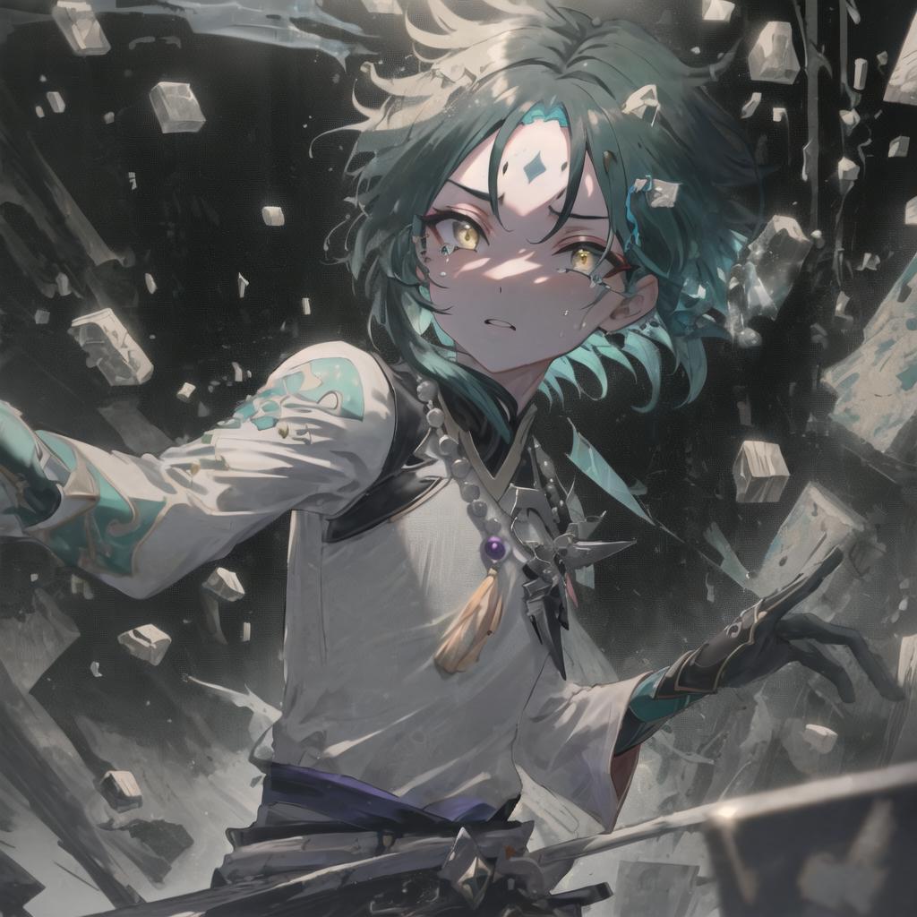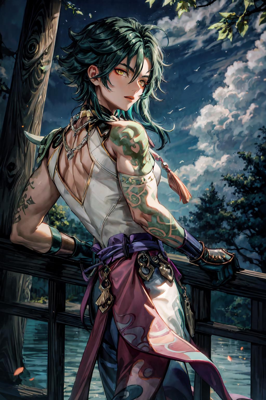 1boy, male focus, solo, xiao (genshin impact), gloves, tattoo, arm tattoo, necklace, cloud, jewelry, mask, sky, green hair, bead necklace, multicolored hair, night, beads, yellow eyes, moon, looking at viewer, weapon, cloudy sky