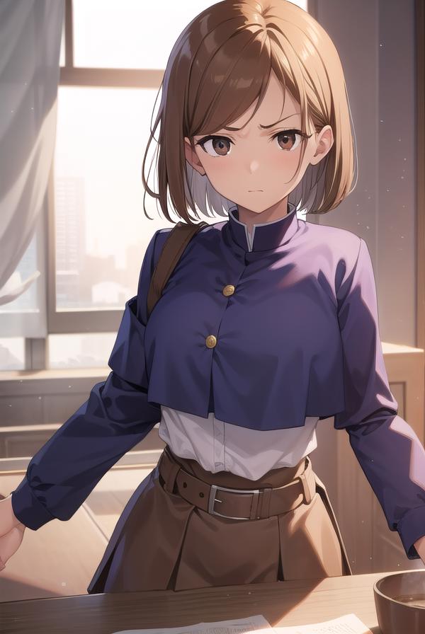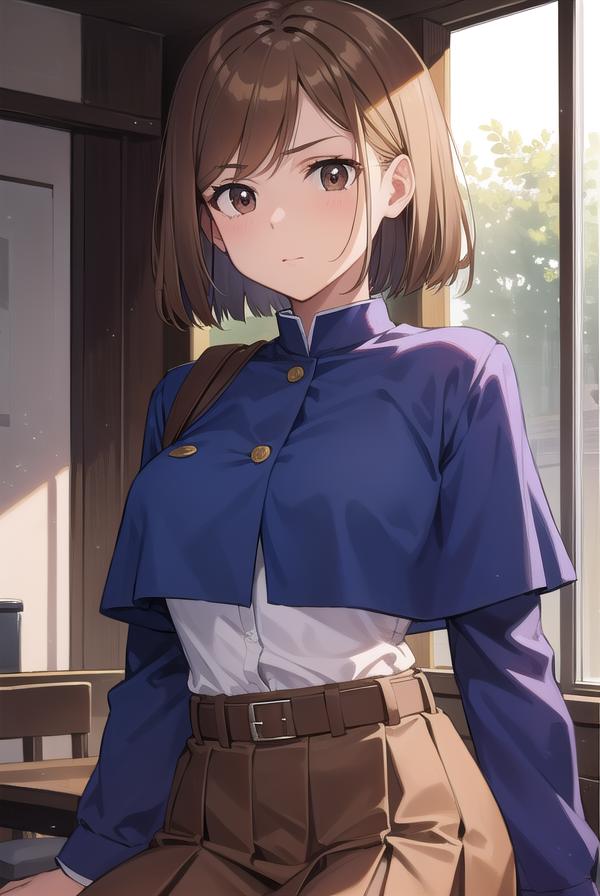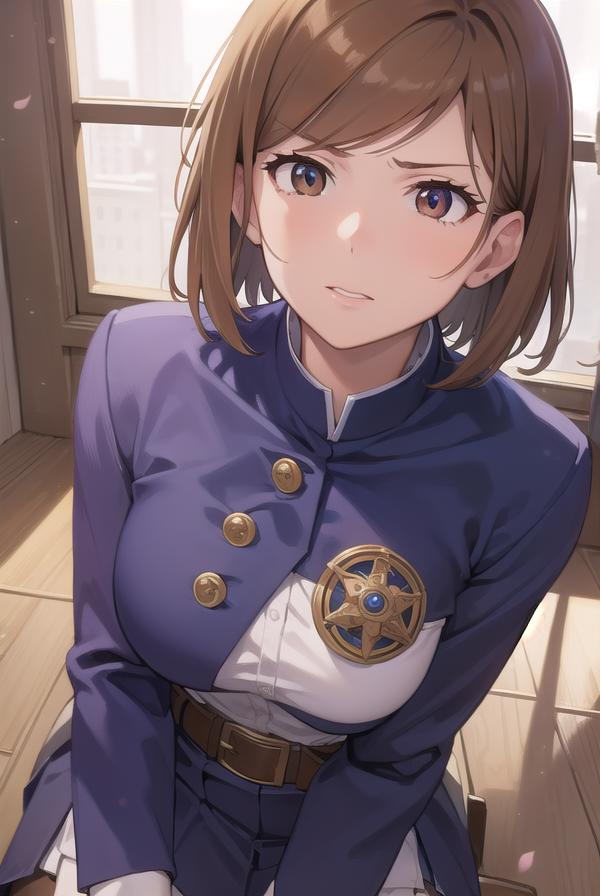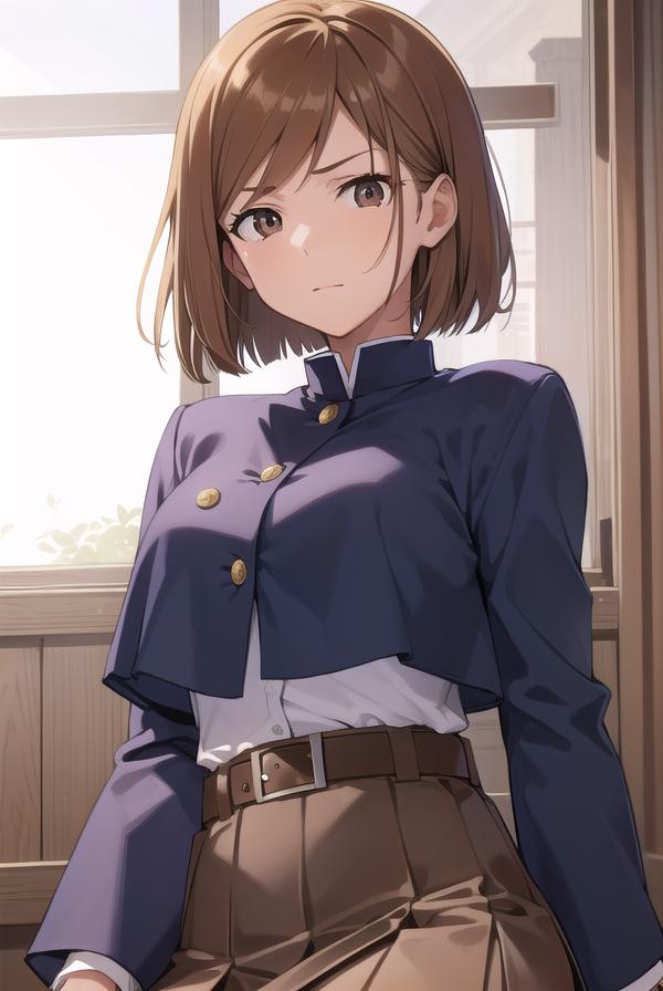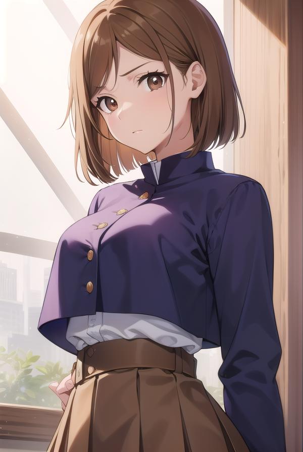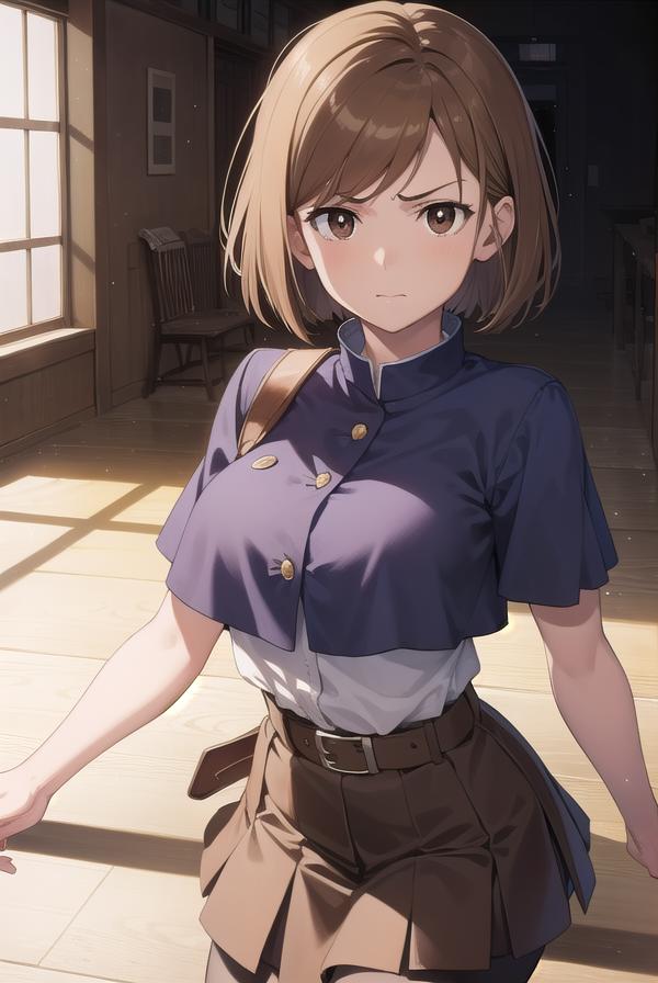 nobara kugisaki, bob cut, (brown eyes:1.7), brown hair, lips, short hair,