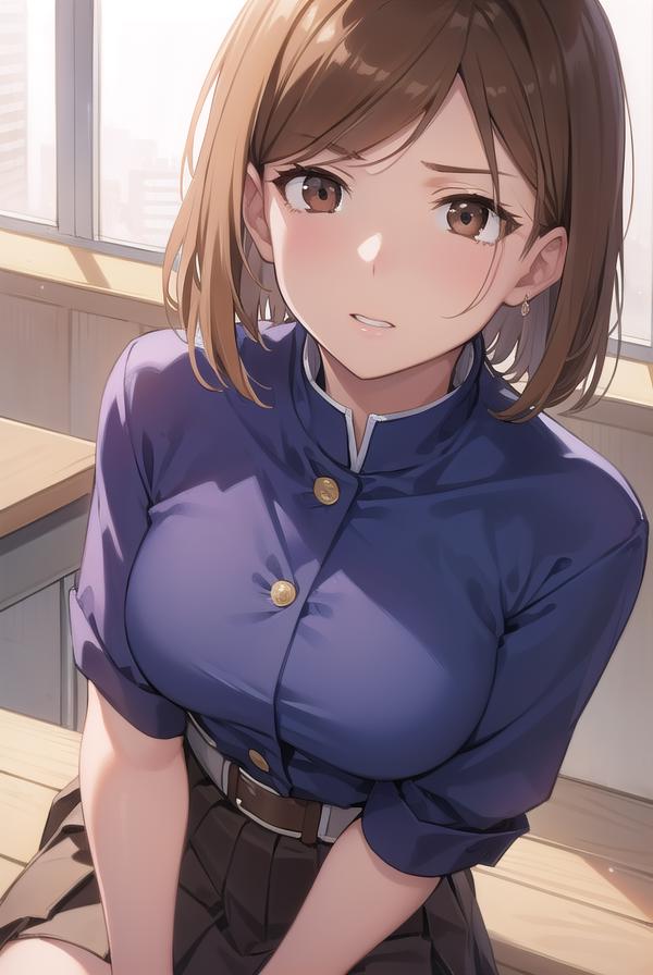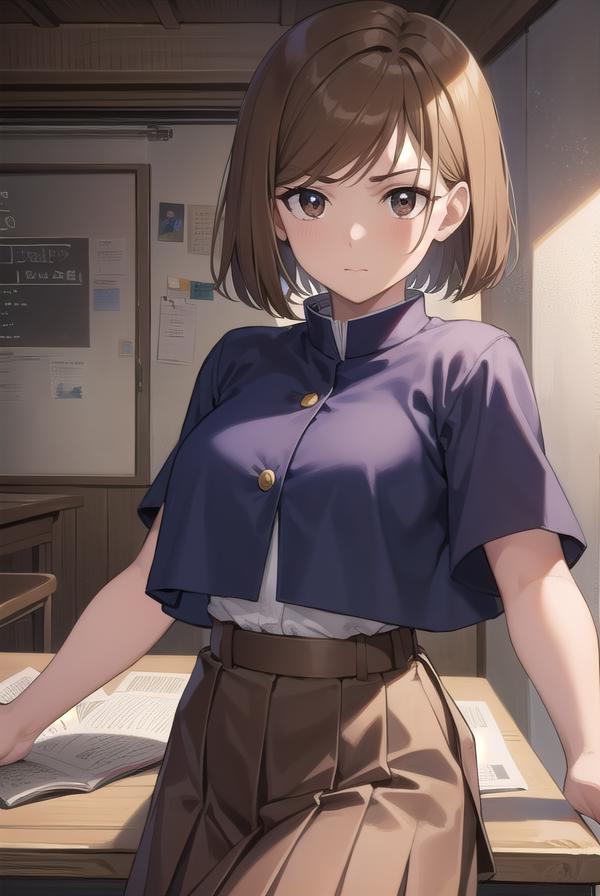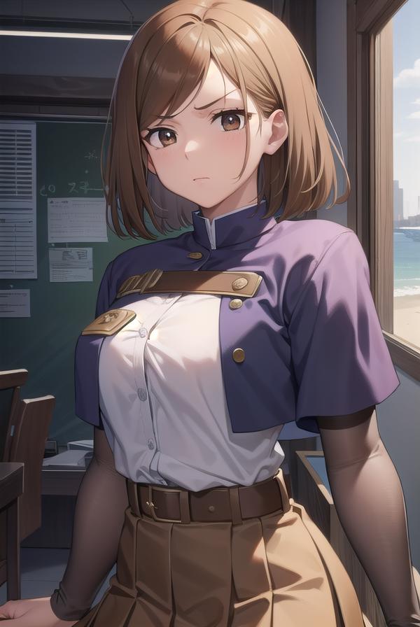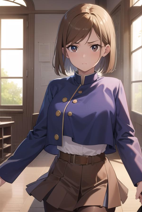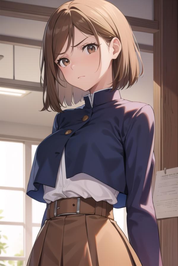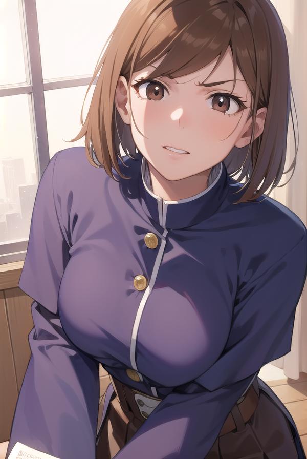 nobara kugisaki, bob cut, (brown eyes:1.7), brown hair, lips, short hair,
