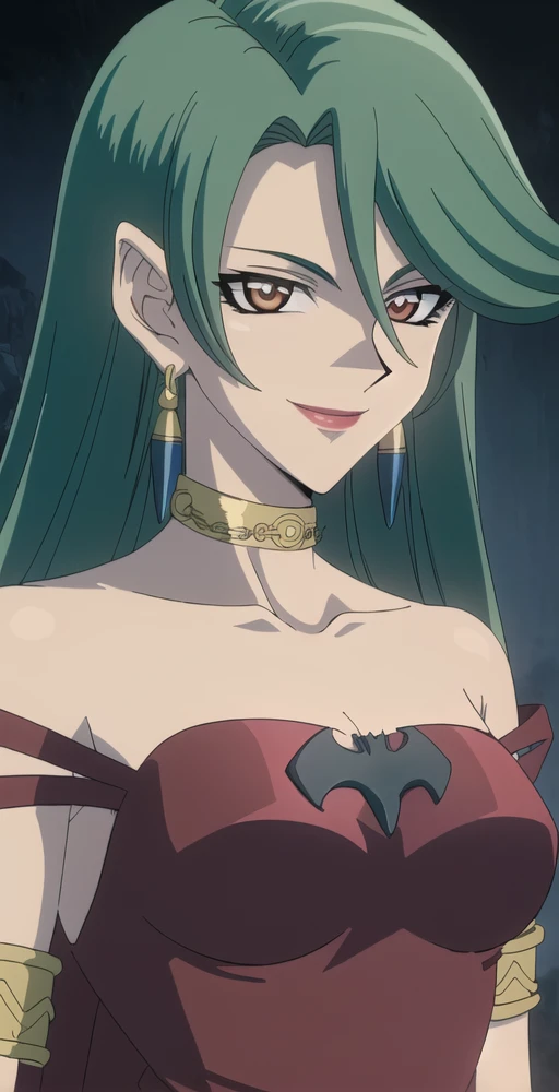 Main outfit, " long red dress, cleavage, long cape, armlet, bracelets, ????????? straps,"