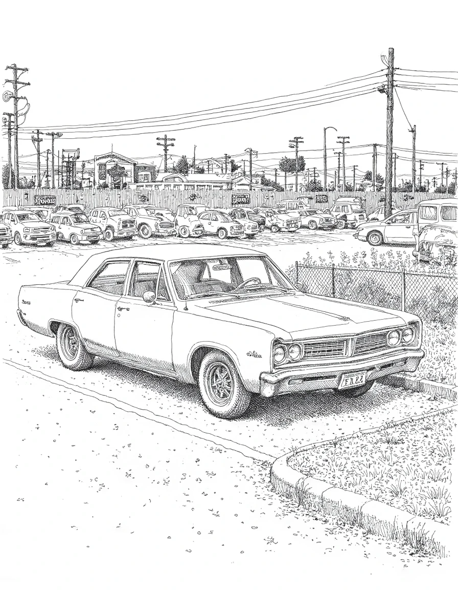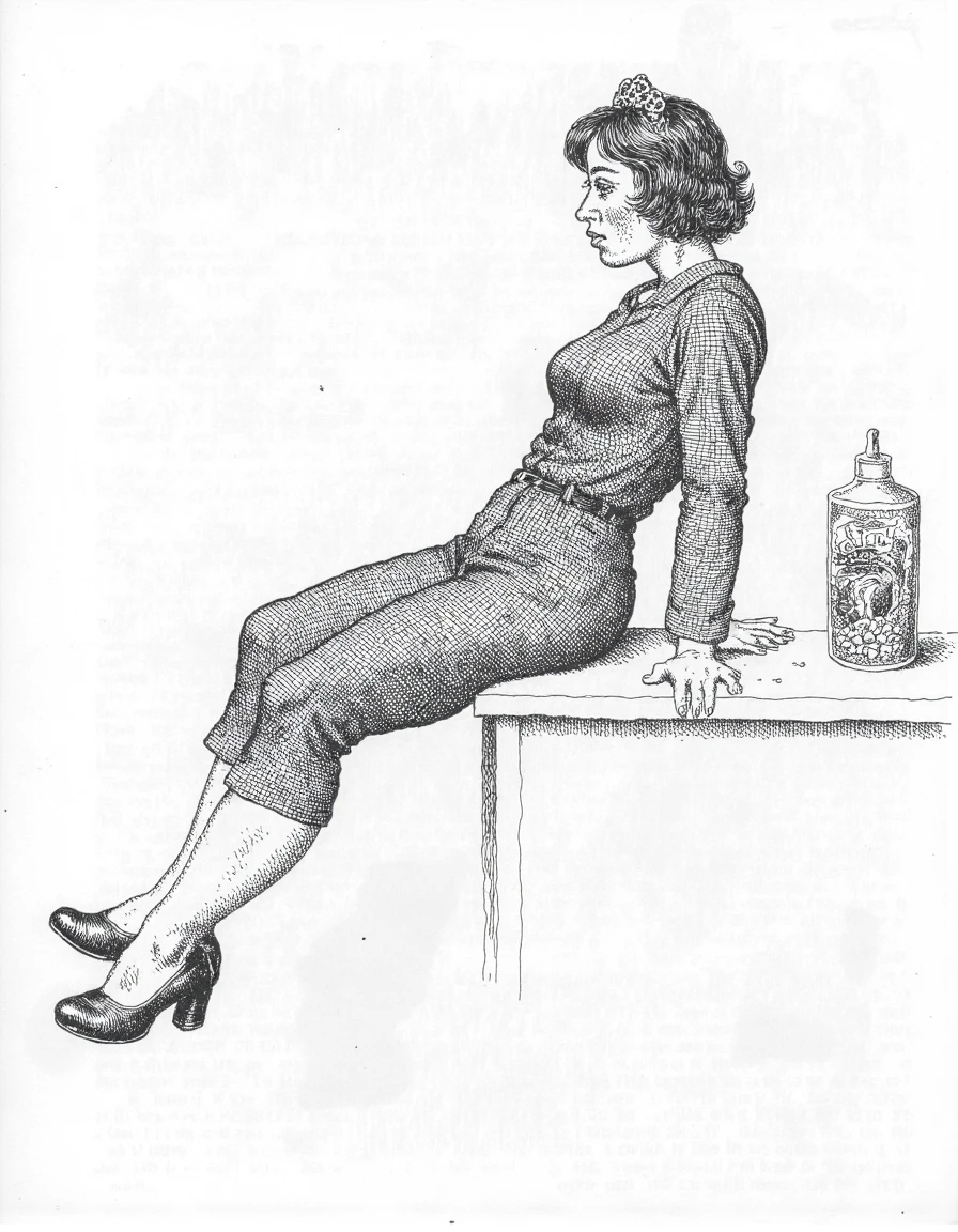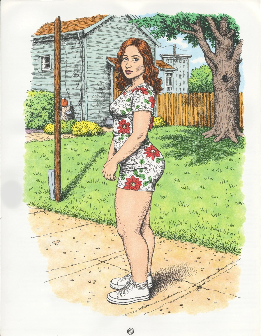 • a drawing of a girl standing in front of a building in the style of robert-crumb