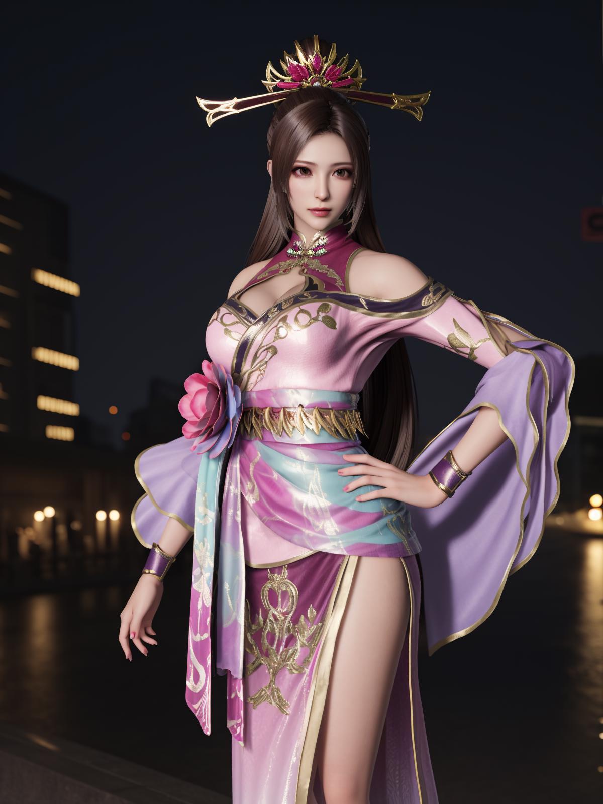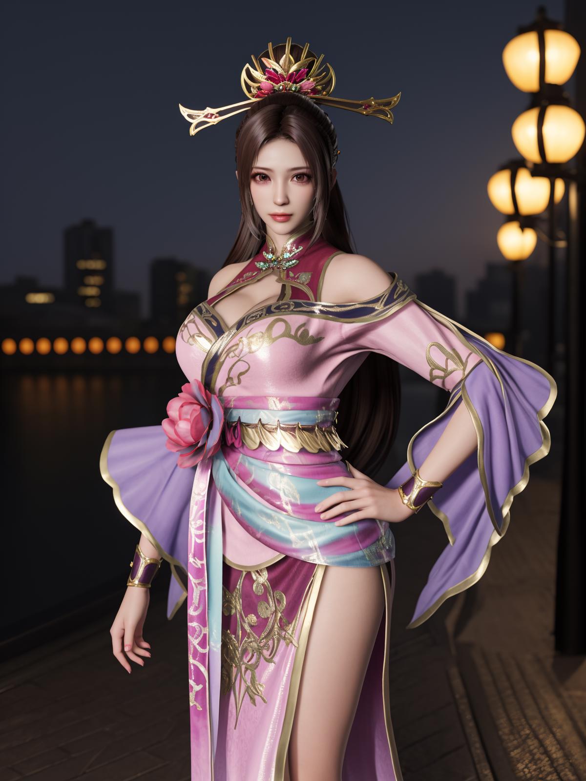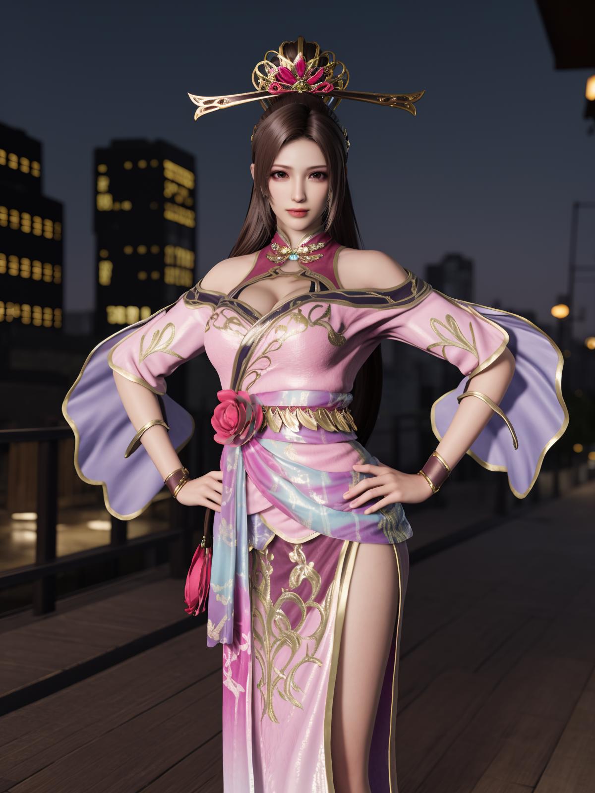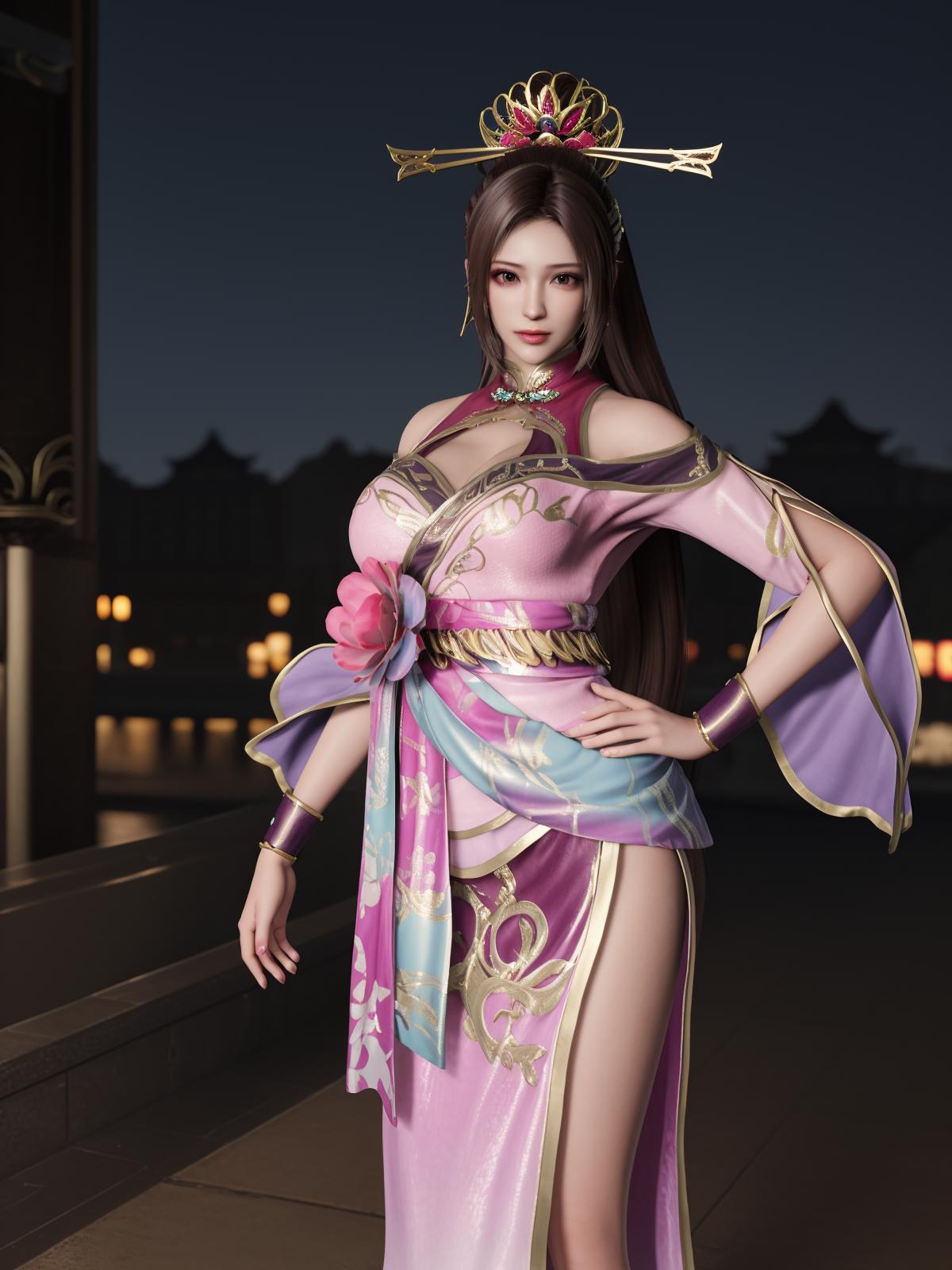 ZSWSdiaochan, 1girl, solo, brown hair, long hair, dress, ???????, clothing cutout, wrist cuffs, obi,headgear,flower,looking at viewer, jewelry,ponytail, cityscape, night, mature female,hand on hip,