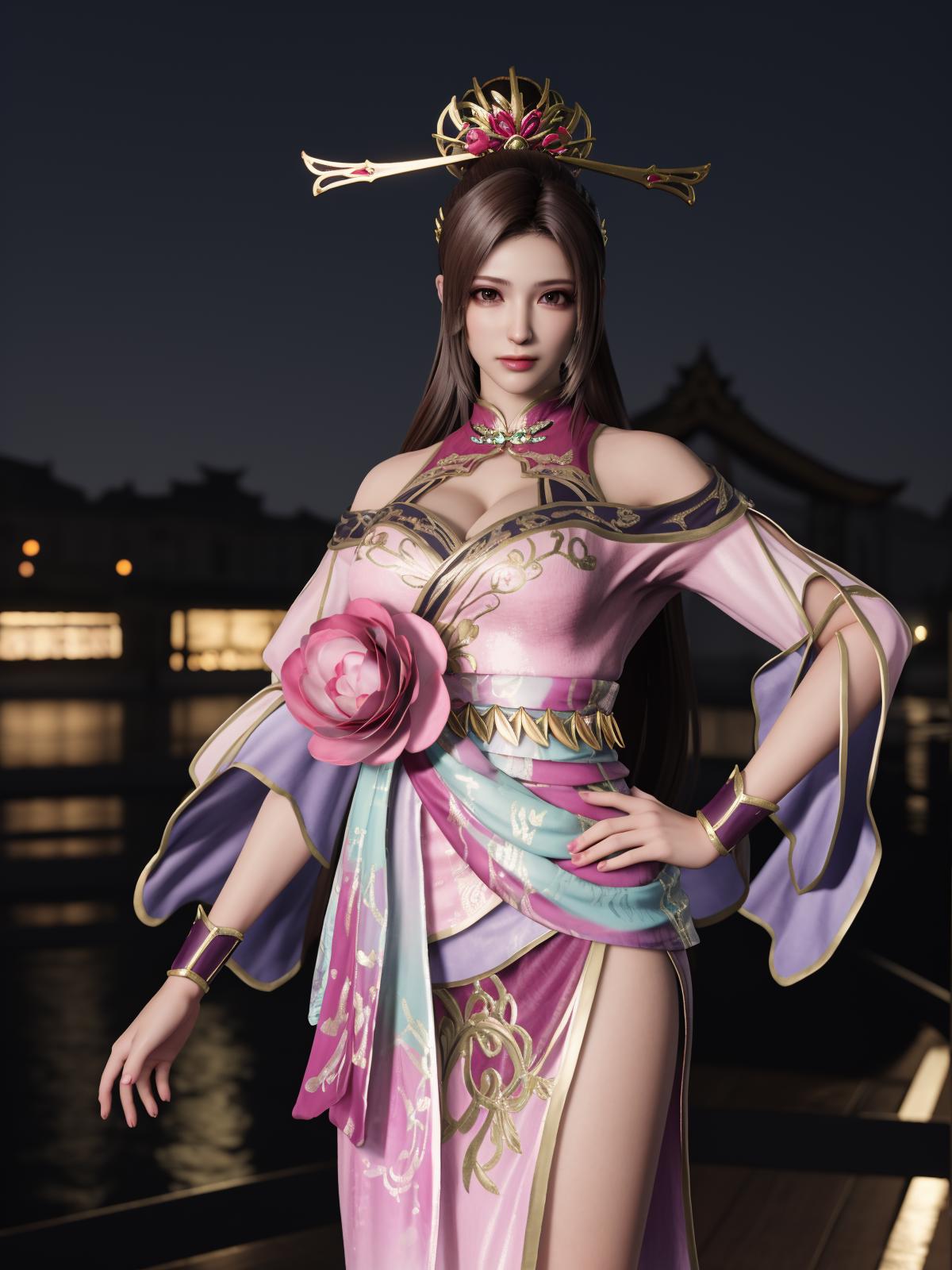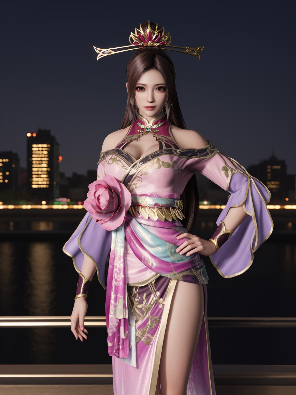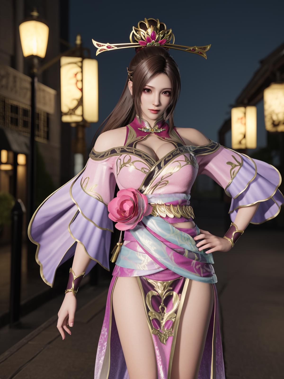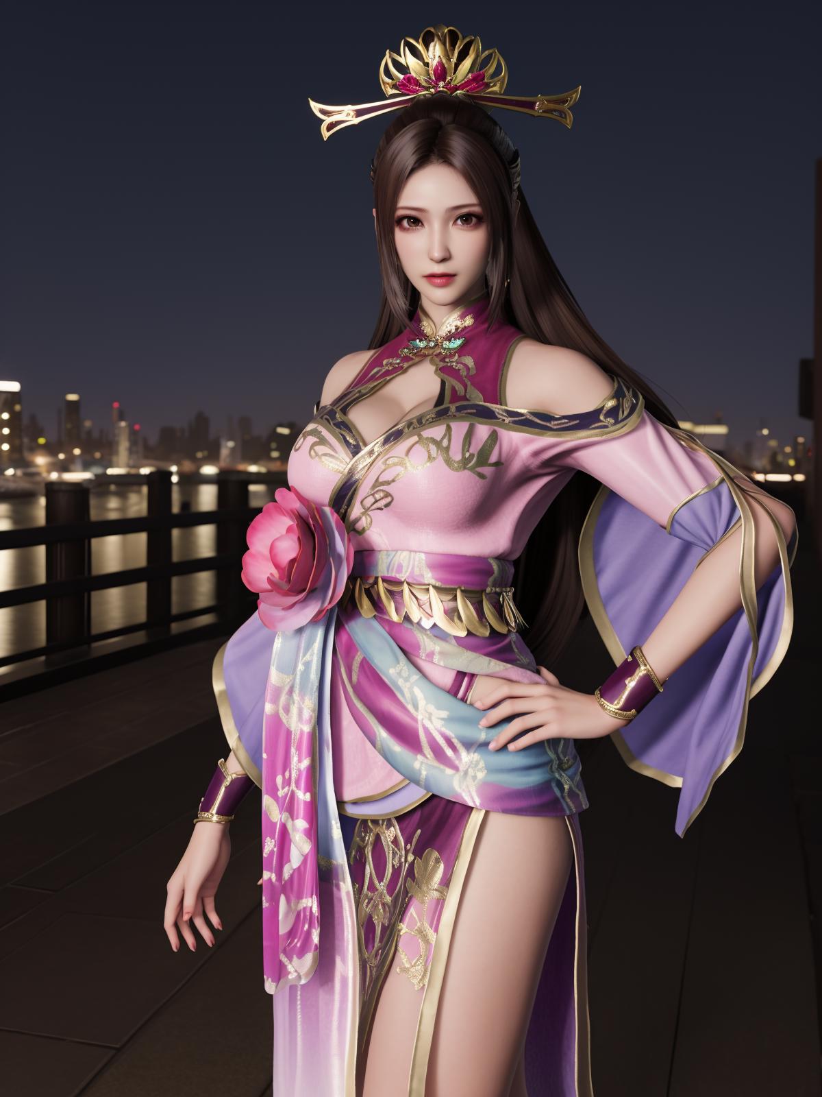 ZSWSdiaochan, 1girl, solo, brown hair, long hair, dress, ???????, clothing cutout, wrist cuffs, obi,headgear,flower,looking at viewer, jewelry,ponytail, cityscape, night, mature female,hand on hip,