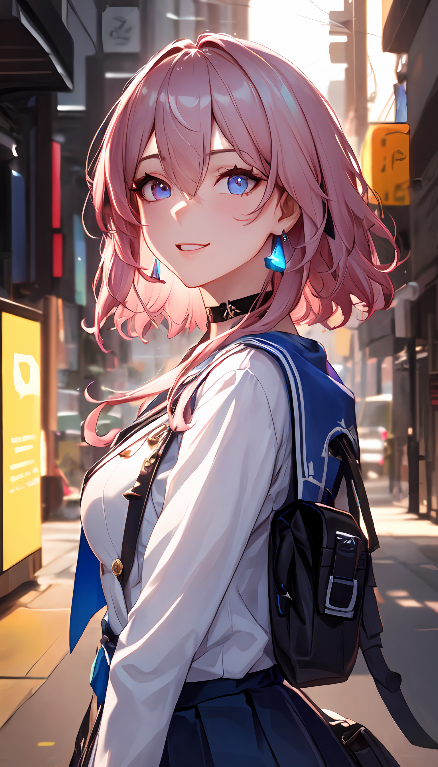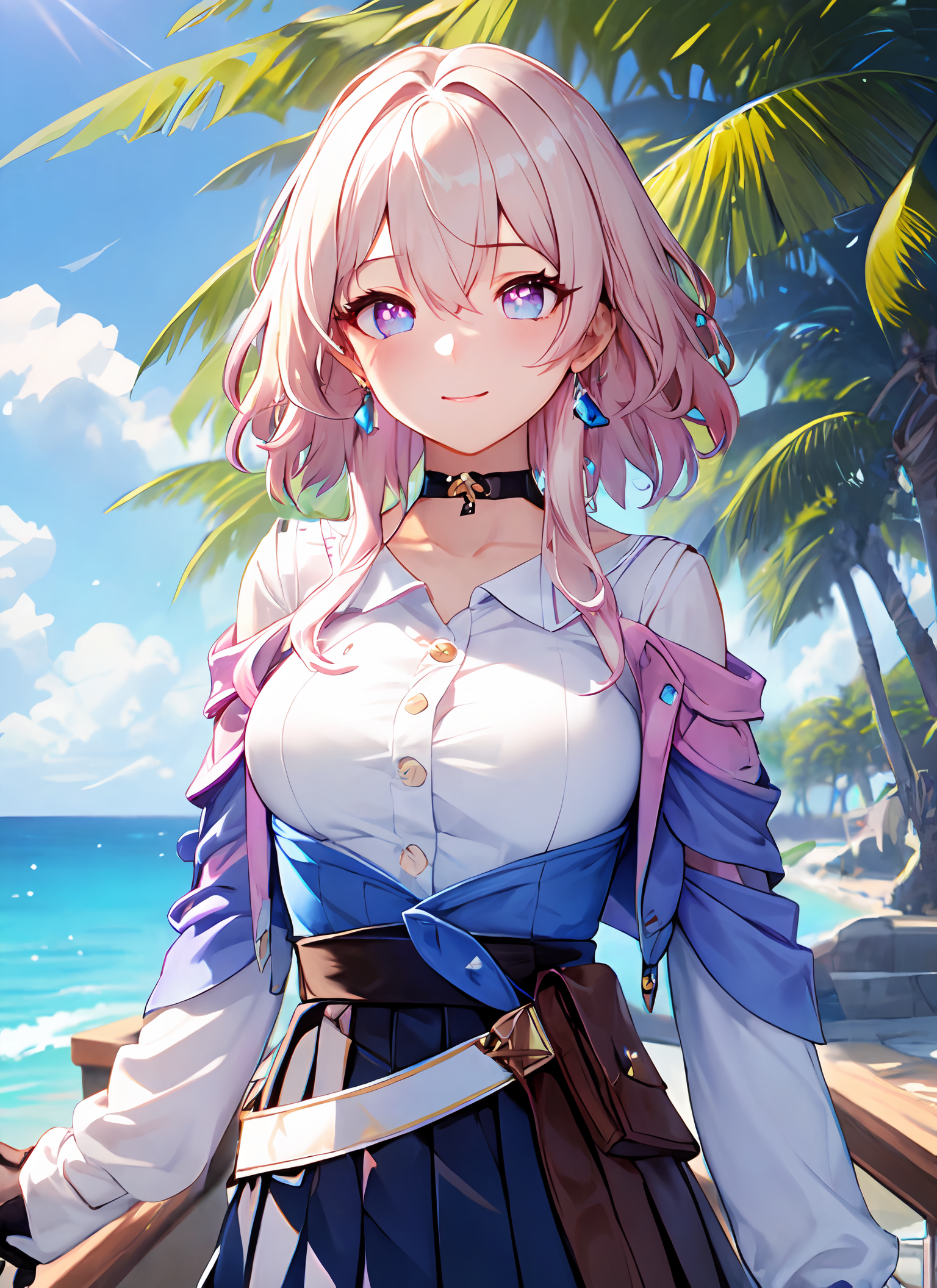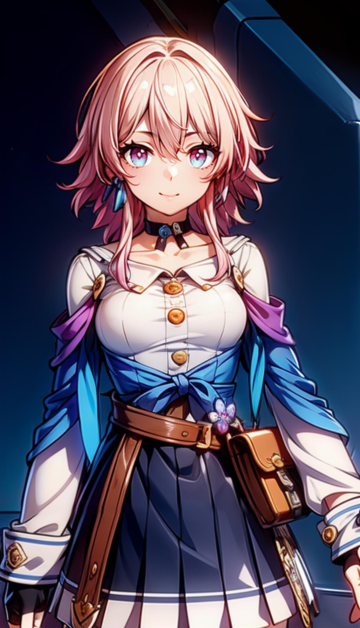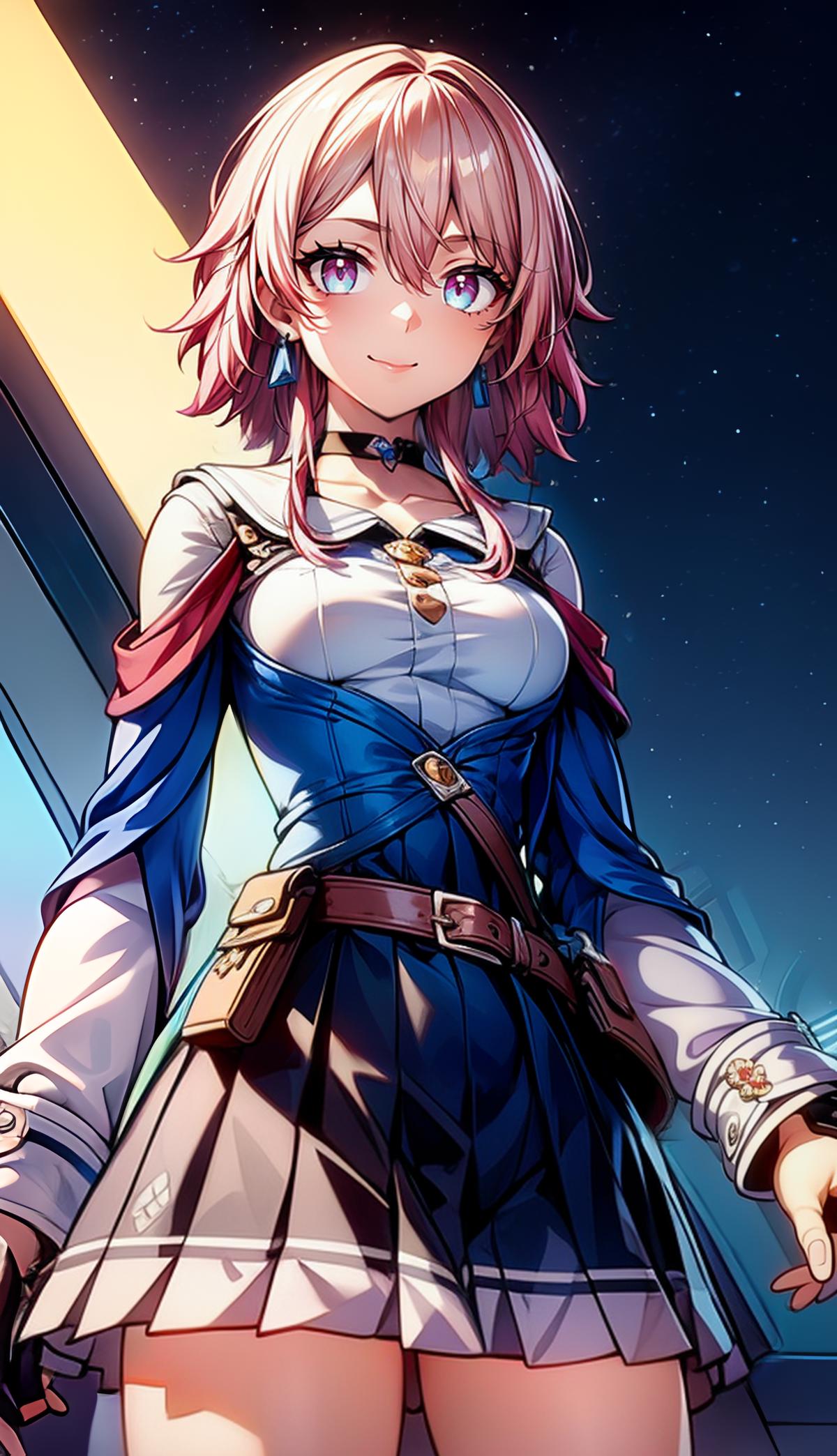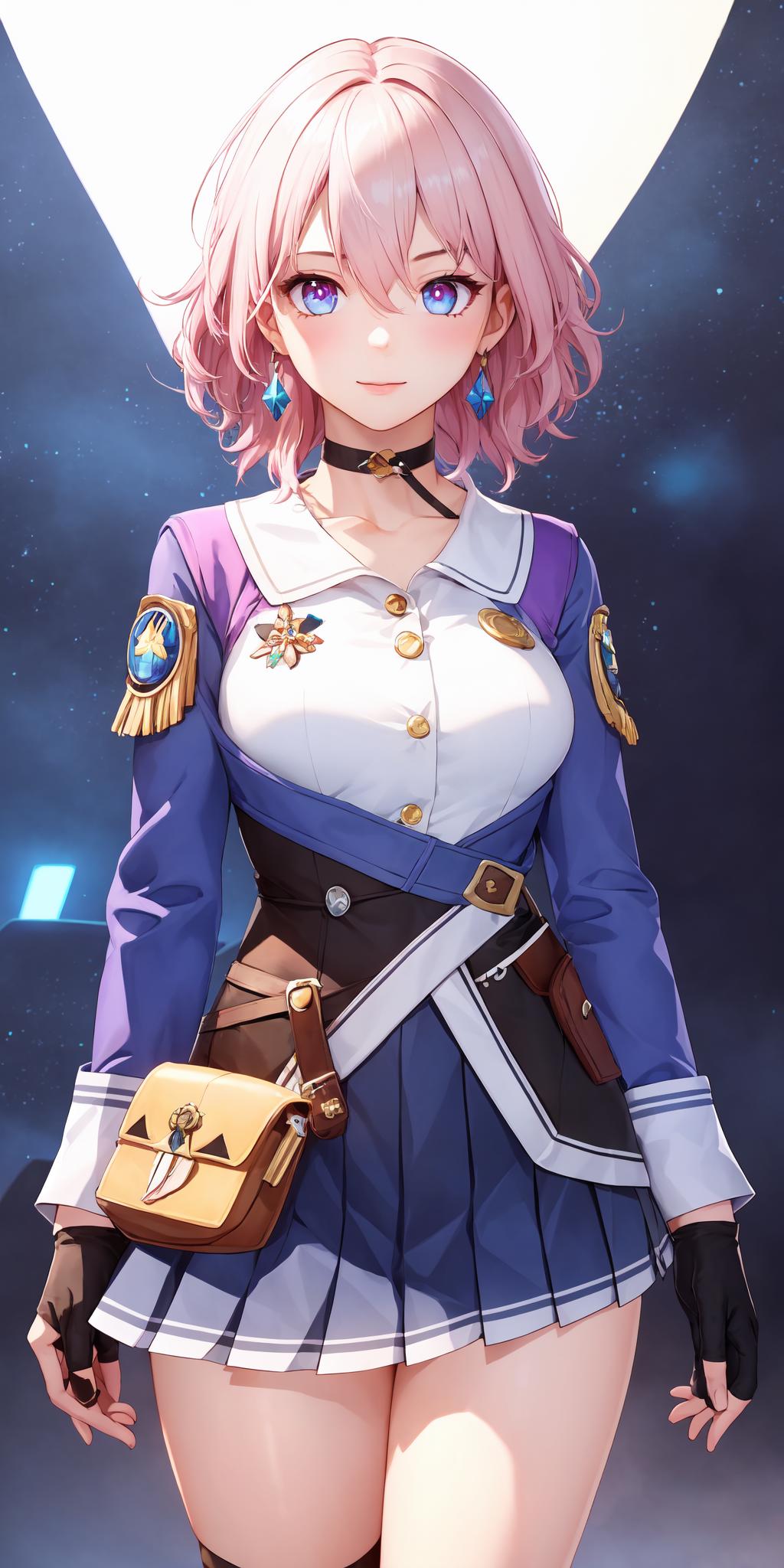 Full trigger words : ph_Mar,Marhd, Mards, 1girl, solo, skirt, gloves, earrings, jewelry, bangs, blue eyes, pink eyes, black gloves, long sleeves, blue skirt, choker, fingerless gloves, white shirt, hair between eyes, short hair, single glove, pleated skirt, partially fingerless gloves, purple eyes, jacket, multicolored eyes