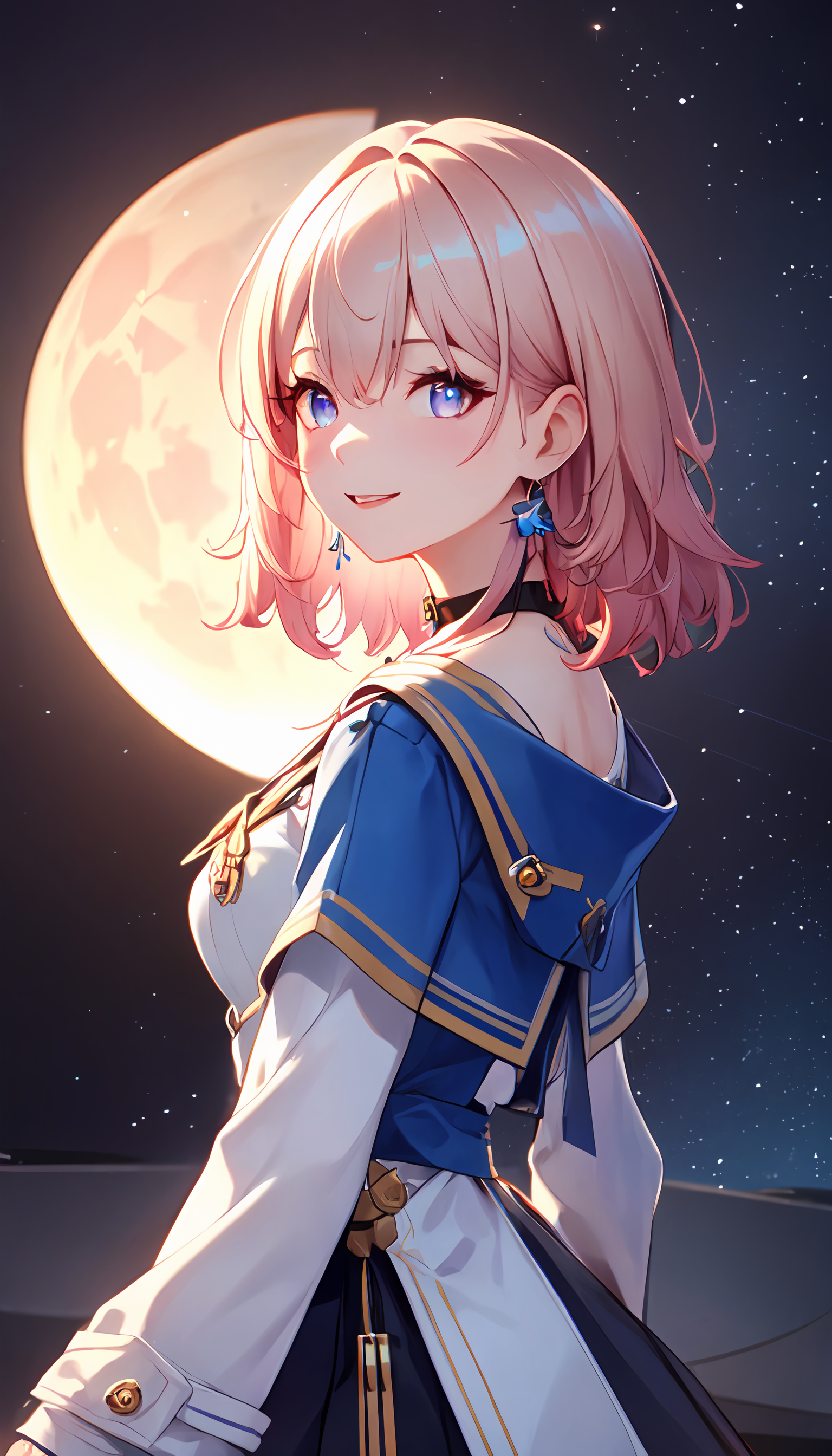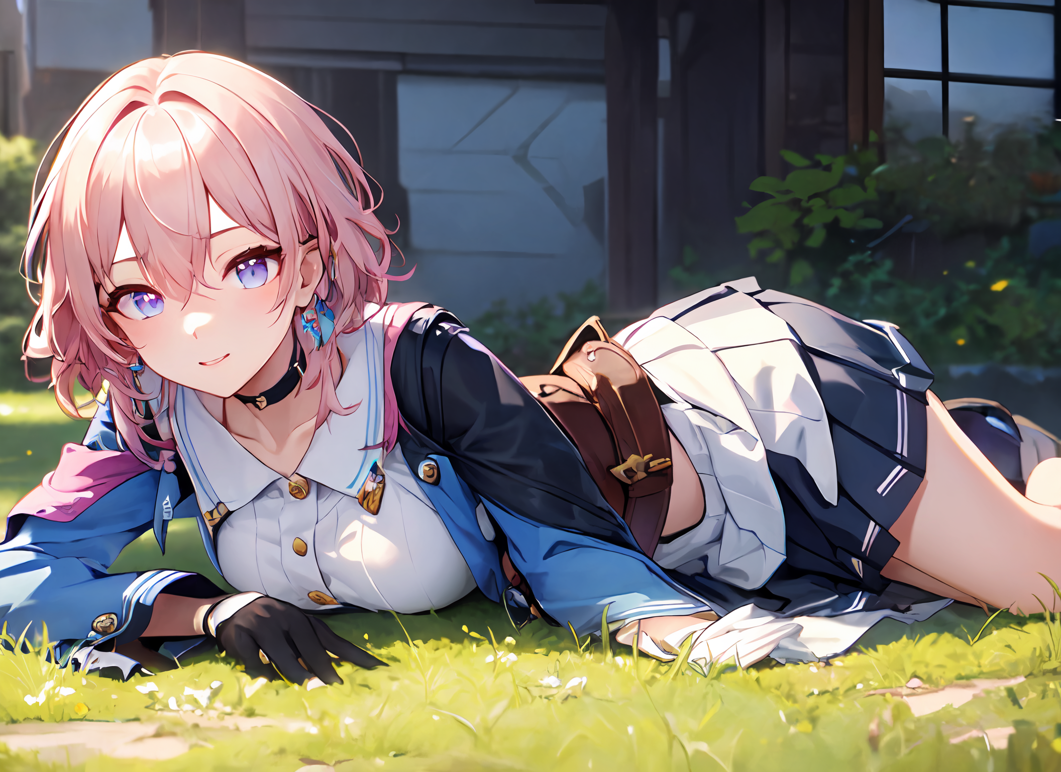 所有触发词:ph_Mar, Marhd, Mards, 1girl, solo, skirt, gloves, earrings, jewelry, bangs, blue eyes, pink eyes, black gloves, long sleeves, blue skirt, choker, fingerless gloves, white shirt, hair between eyes, short hair, single glove, pleated skirt, partially fingerless gloves, purple eyes, jacket, multicolored eyes