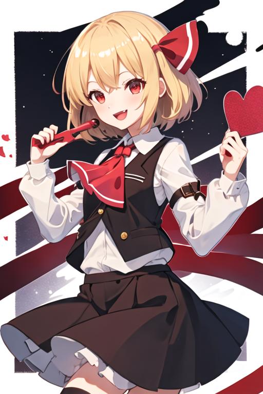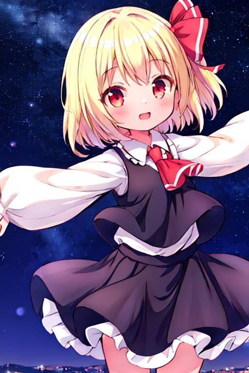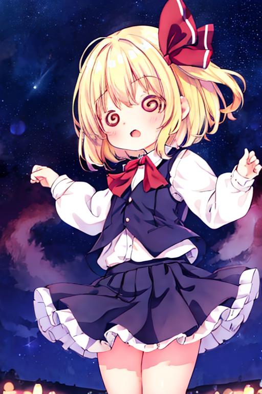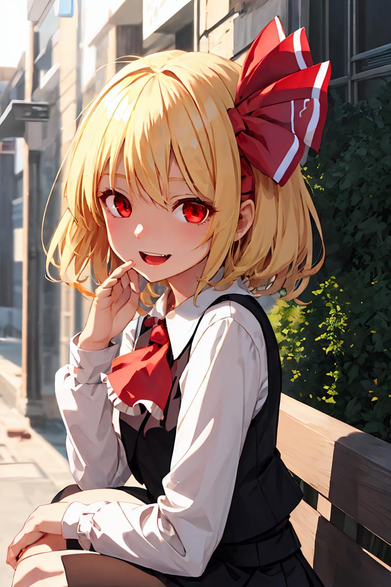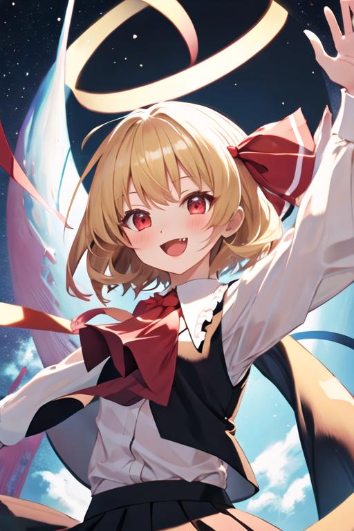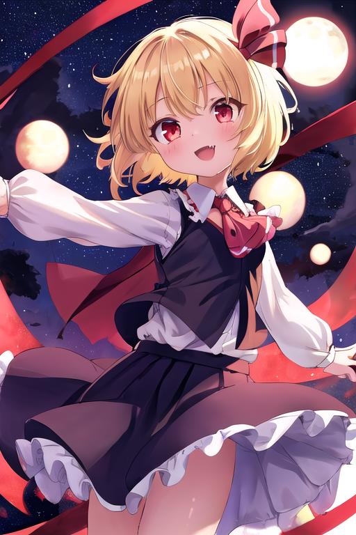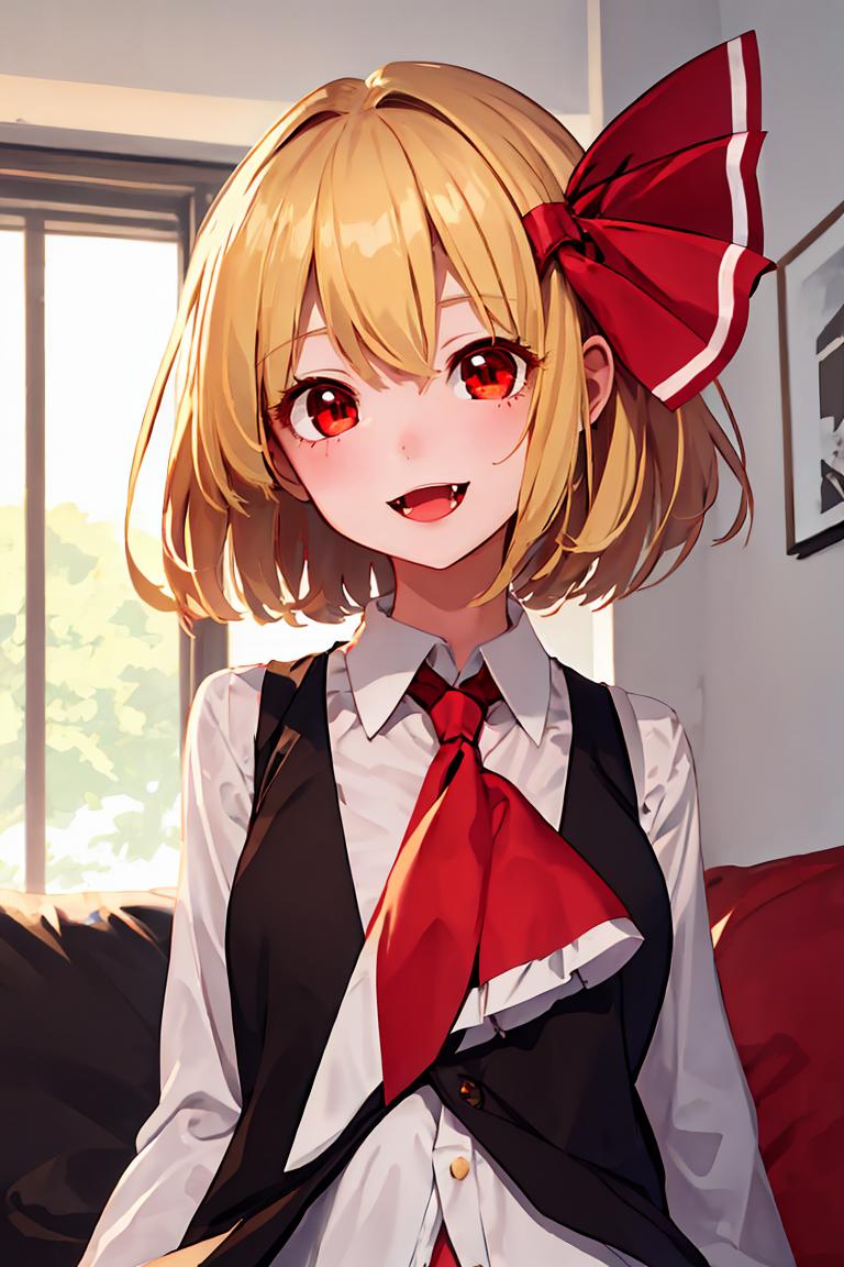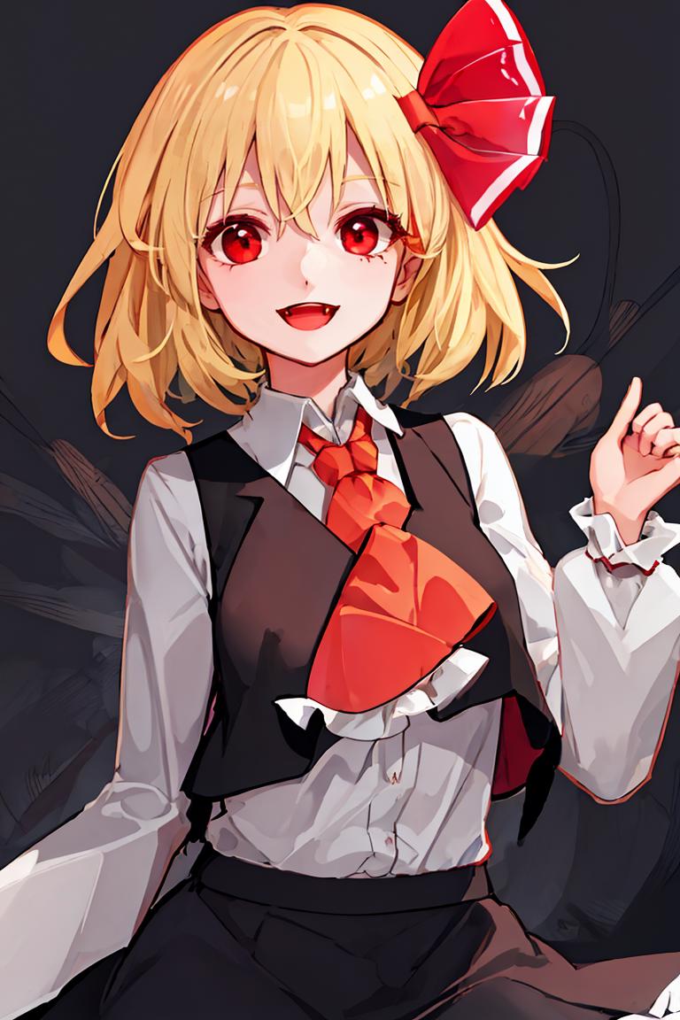 The trigger word is rumia_touhou, and the recommended tags are best quality, masterpiece, highres, solo, {rumia_touhou:1.15}, blonde_hair, ribbon, short_hair, hair_ribbon, red_eyes, vest, smile, open_mouth, red_ribbon, ascot.