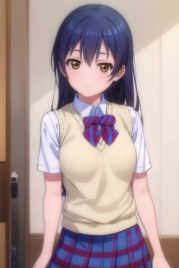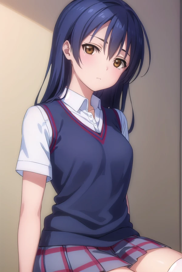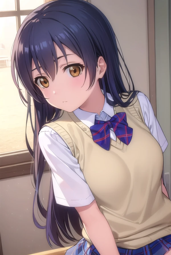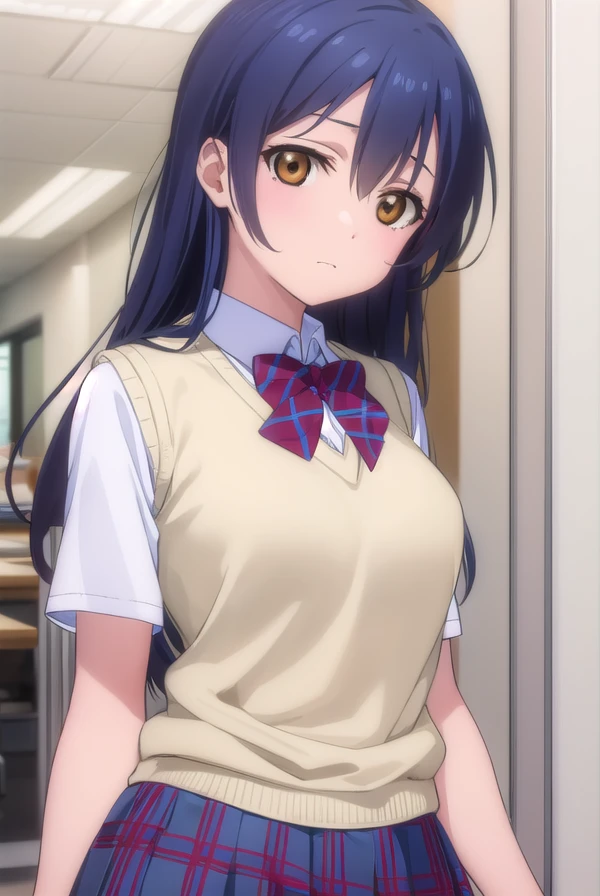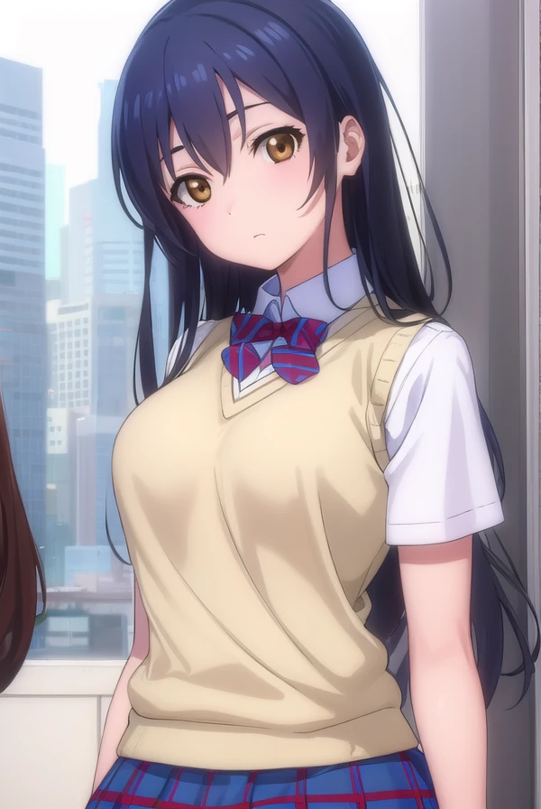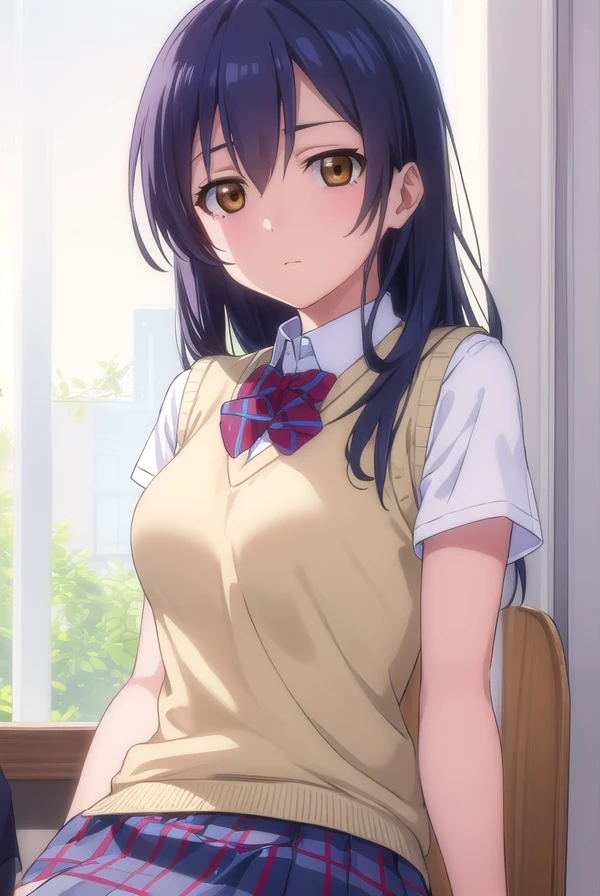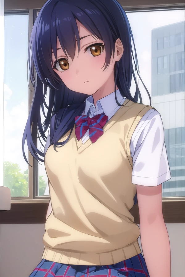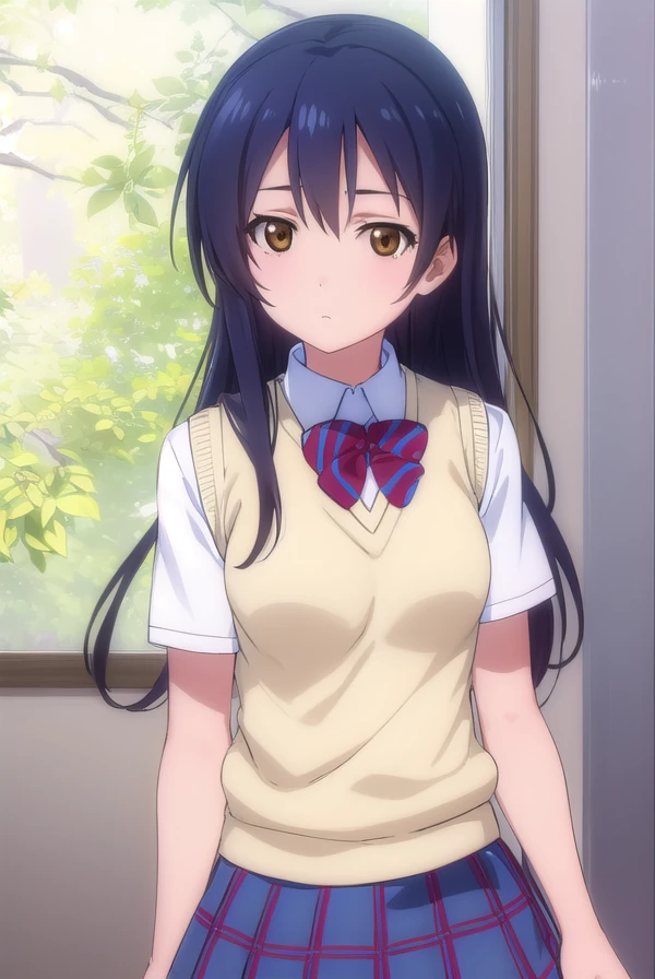 umi sonoda, long hair, bangs, hair between eyes, (brown eyes:1.5), (blue hair:1.5),