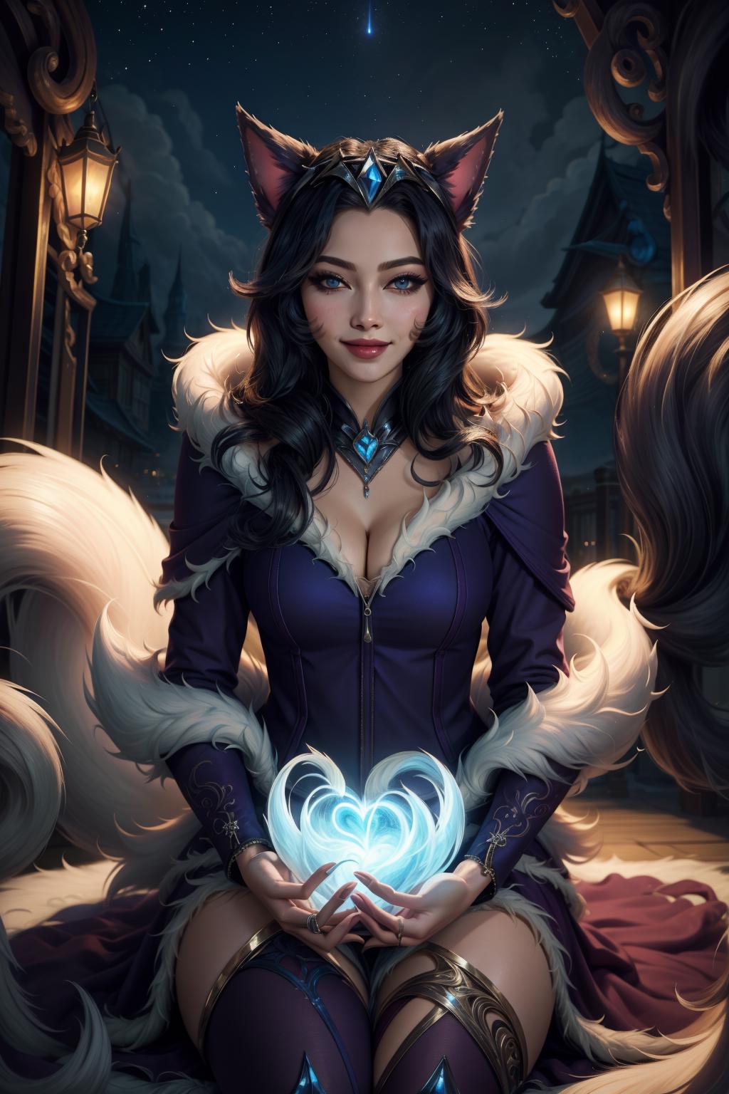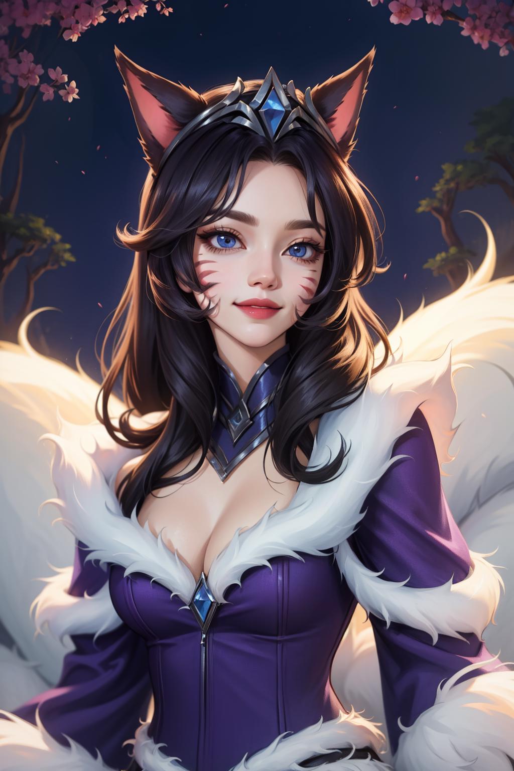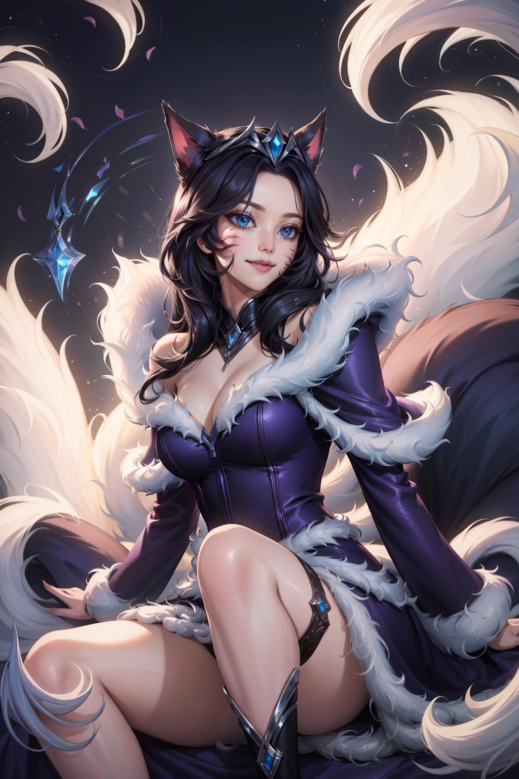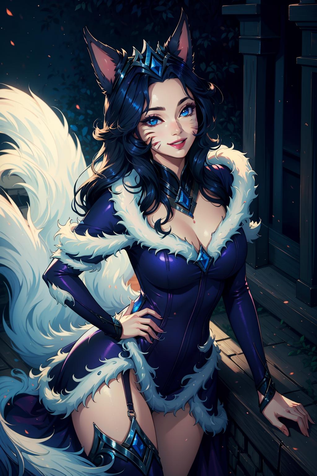 tags: midnight ahri, 1girl, dress, fur trim, animal ears, cleavage, long hair