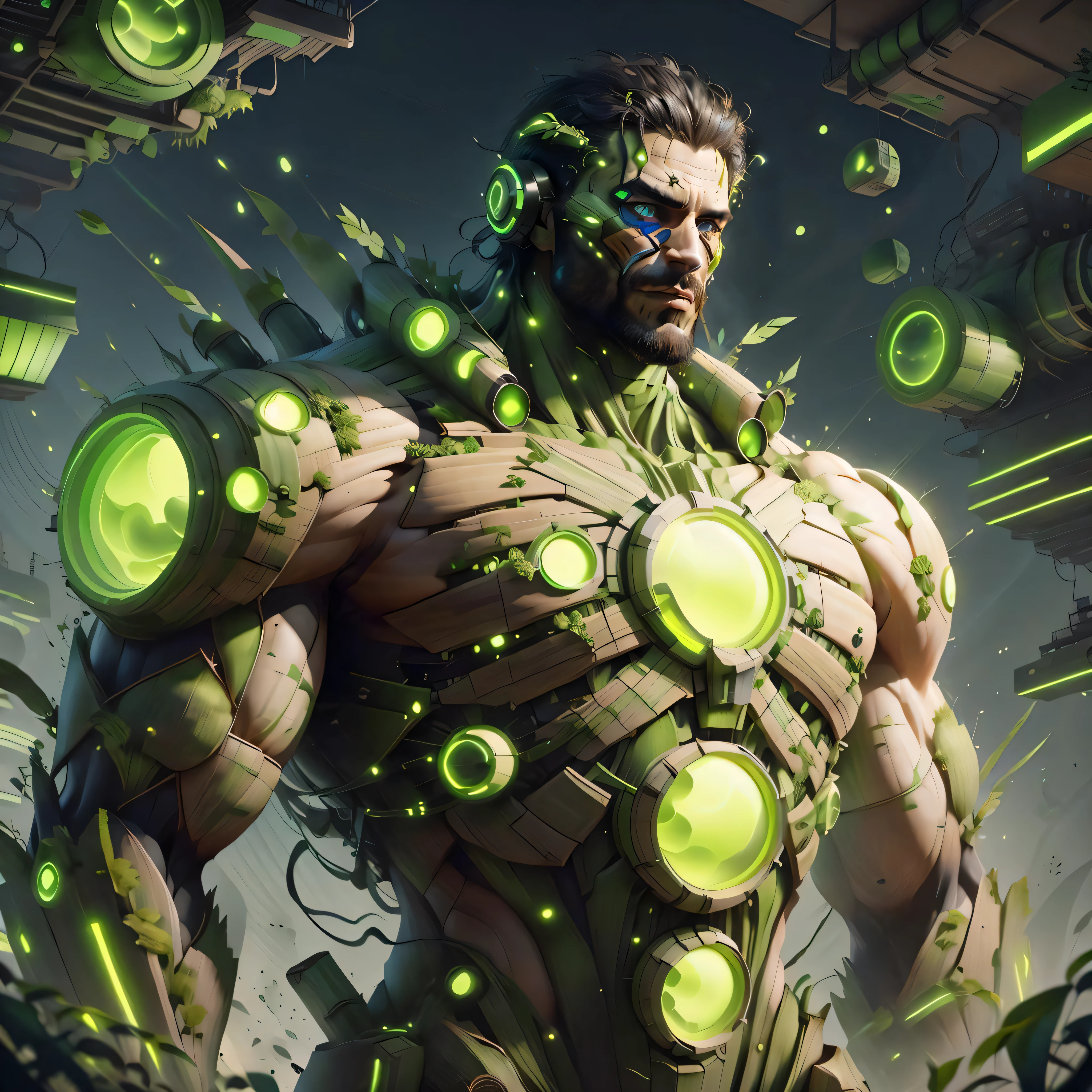 A close up of a man with green eyes and a green light