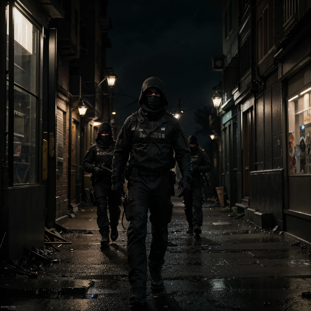 a special ops team moves with precision through the shadowy alleys of a forsaken city