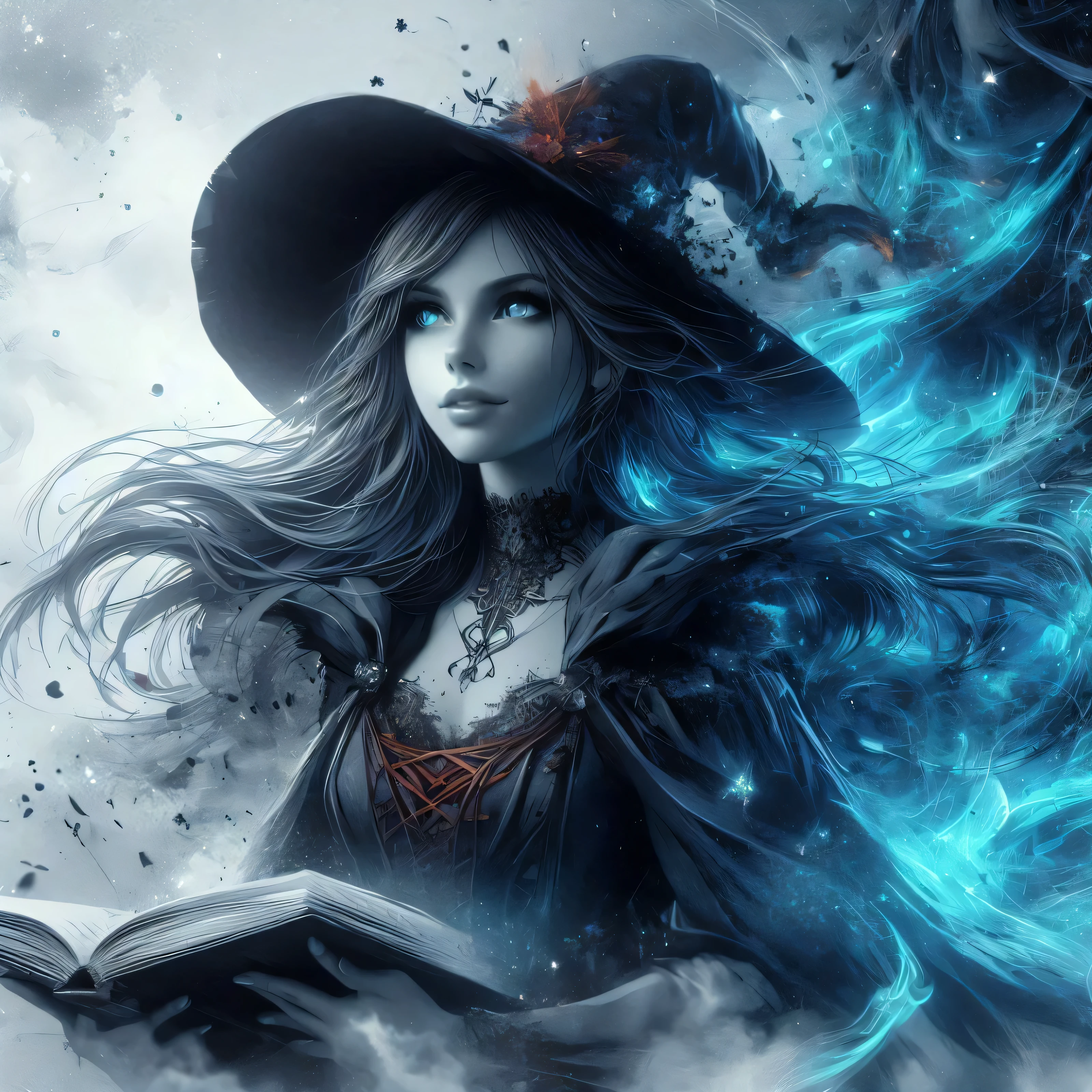 A woman in a witches hat reading a book in the clouds