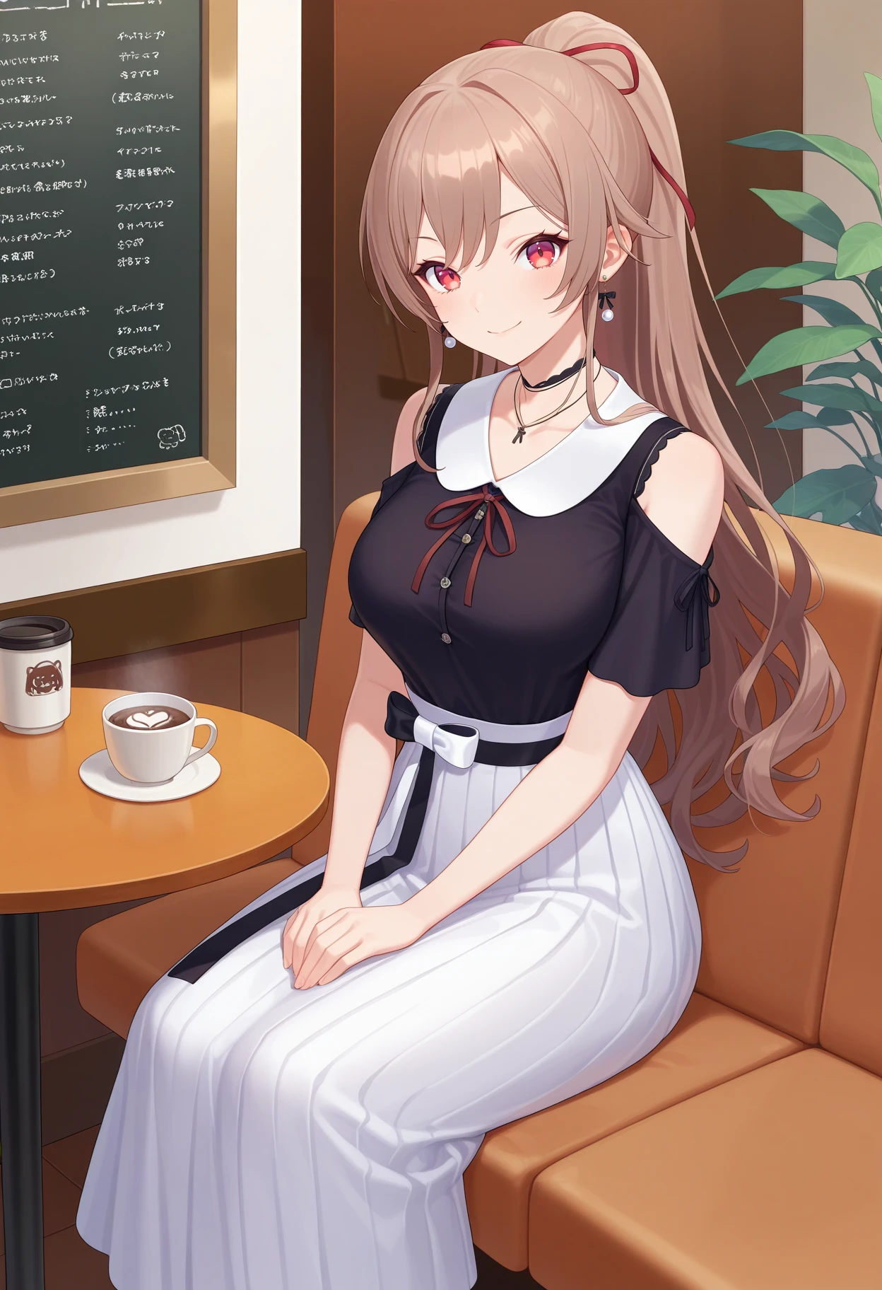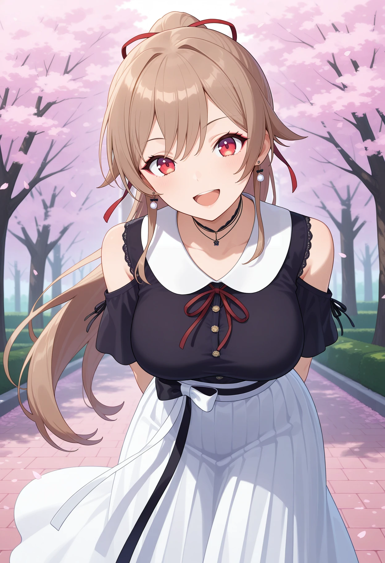 outfit3aafuren, long hair, brown hair, ponytail, hair ribbon, red ribbon, earrings, red eyes, ???????, black choker, necklace, neck ribbon, shoulder cutout, black shirt, short sleeves, two-tone bow, long skirt, white skirt