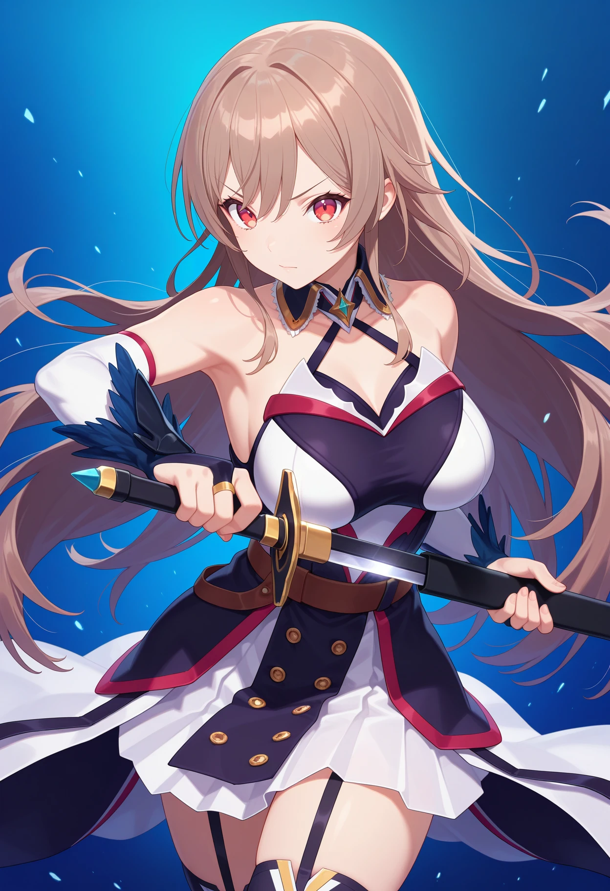 outfit1aafuren, long hair, brown hair, red eyes, ???????, detached collar, halterneck, ???? shoulders, black dress, detached sleeves, white sleeves, bridal gauntlets, belt, white skirt, garter straps, black thighhighs