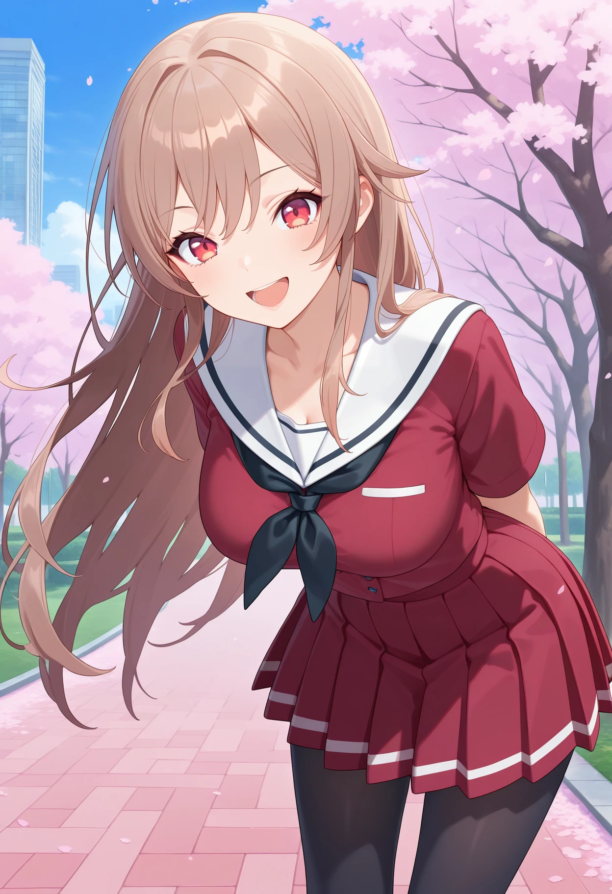 outfit6aafuren, long hair, brown hair, red eyes, ???????, serafuku, white sailor collar, black neckerchief, red shirt, short sleeves, red skirt, pleated skirt, black pantyhose