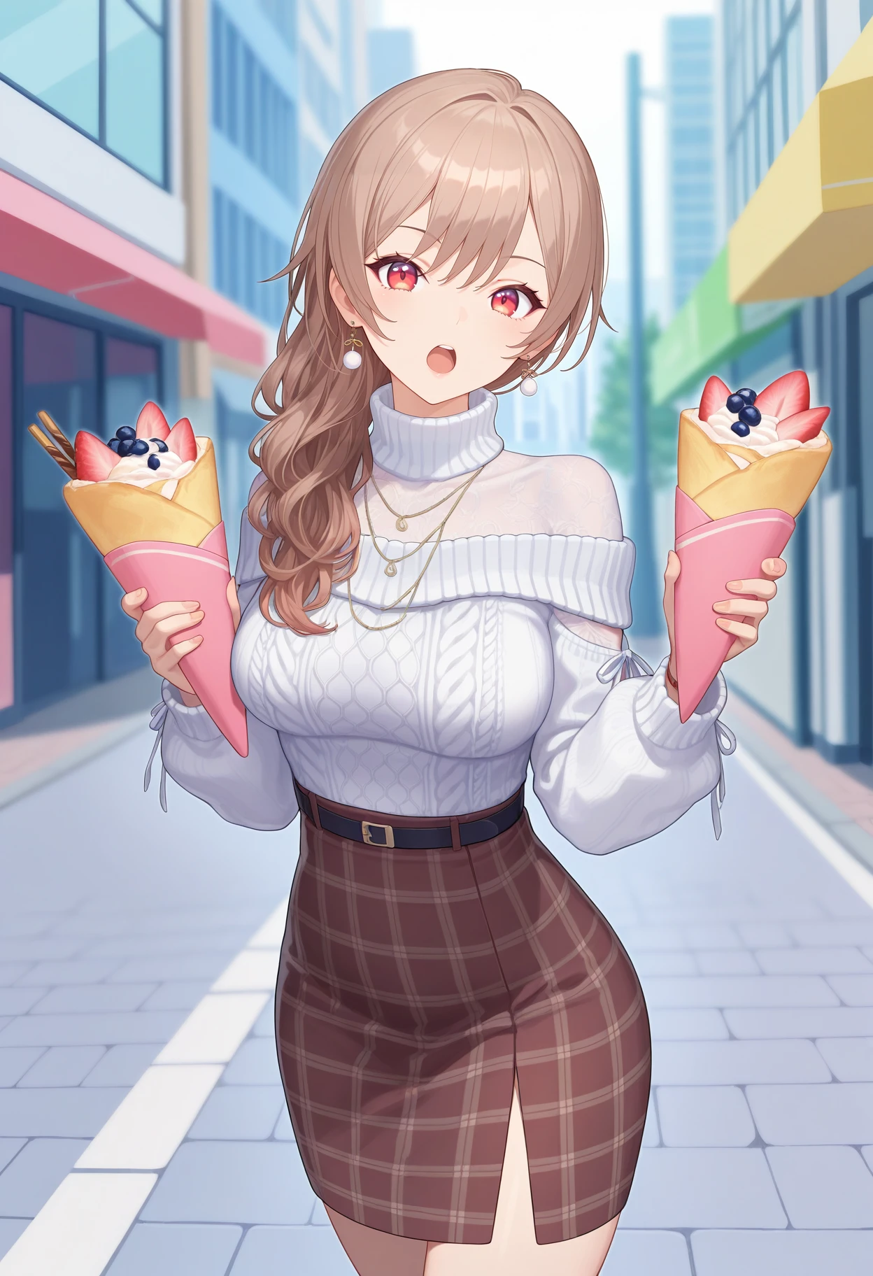 outfit4aafuren, long hair, brown hair, earrings, red eyes, ???????, hair over shoulder, turtleneck, necklace, off shoulder, white sweater, long sleeves, black belt, high-waist skirt, plaid skirt, brown skirt