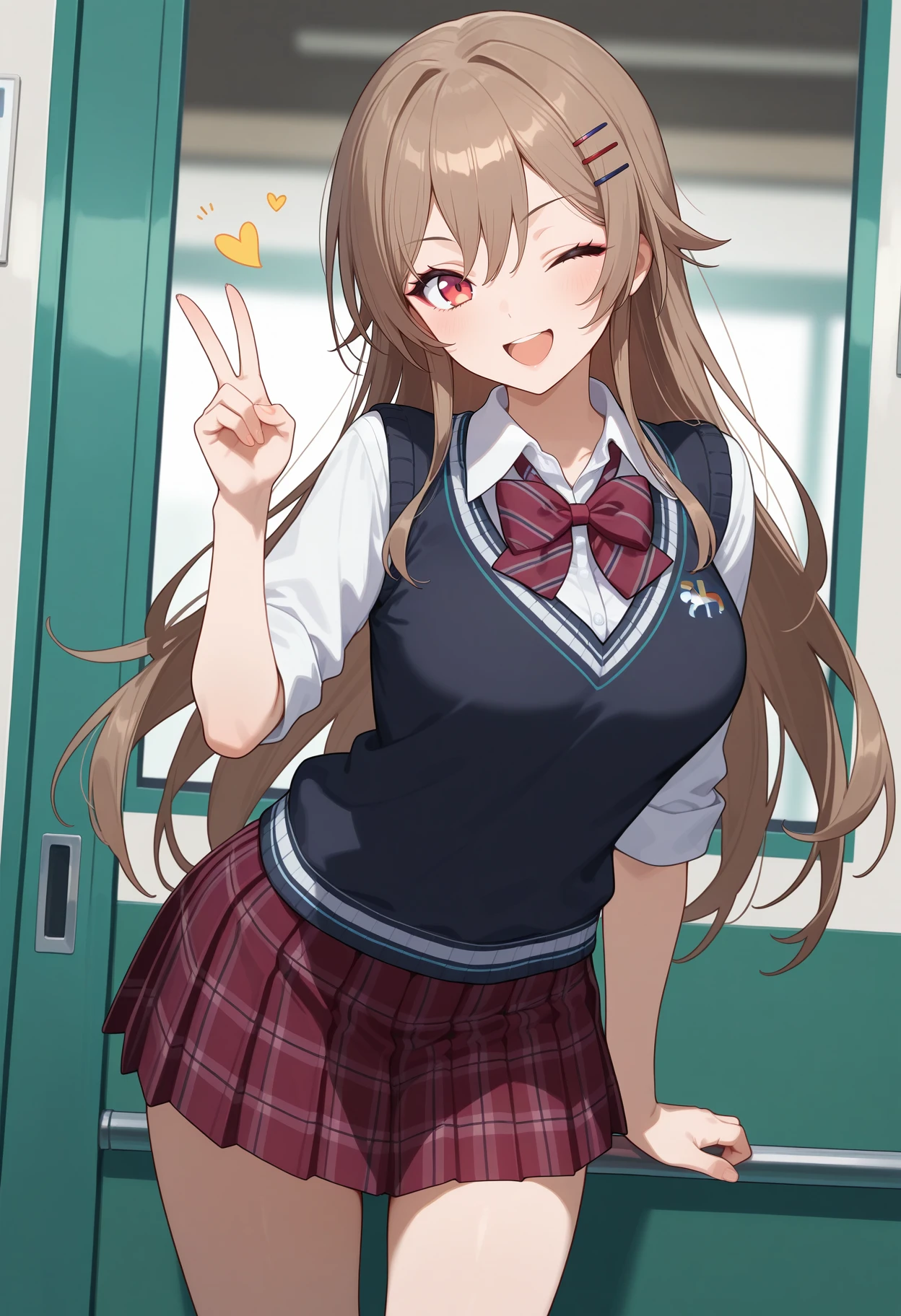 outfit2aafuren, long hair, brown hair, hairclip, red eyes, ???????, school uniform, striped bowtie, red bowtie, collared shirt, white shirt, sweater vest, black vest, sleeves rolled up, plaid skirt, red skirt
