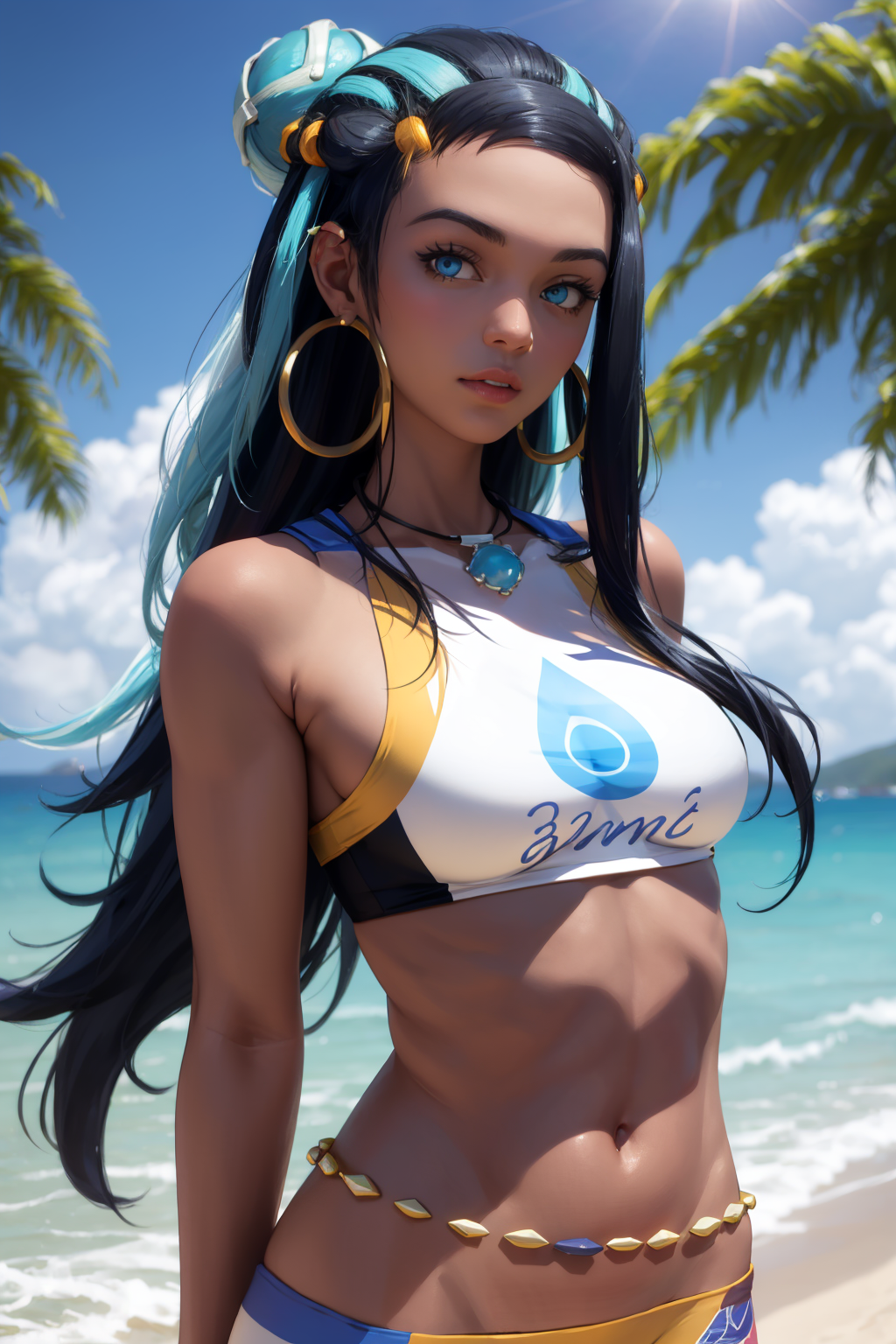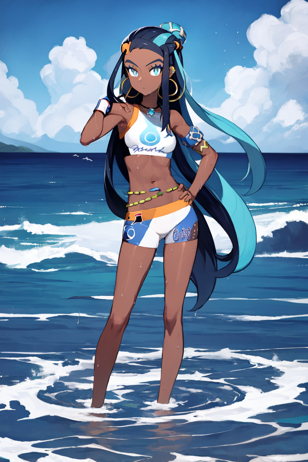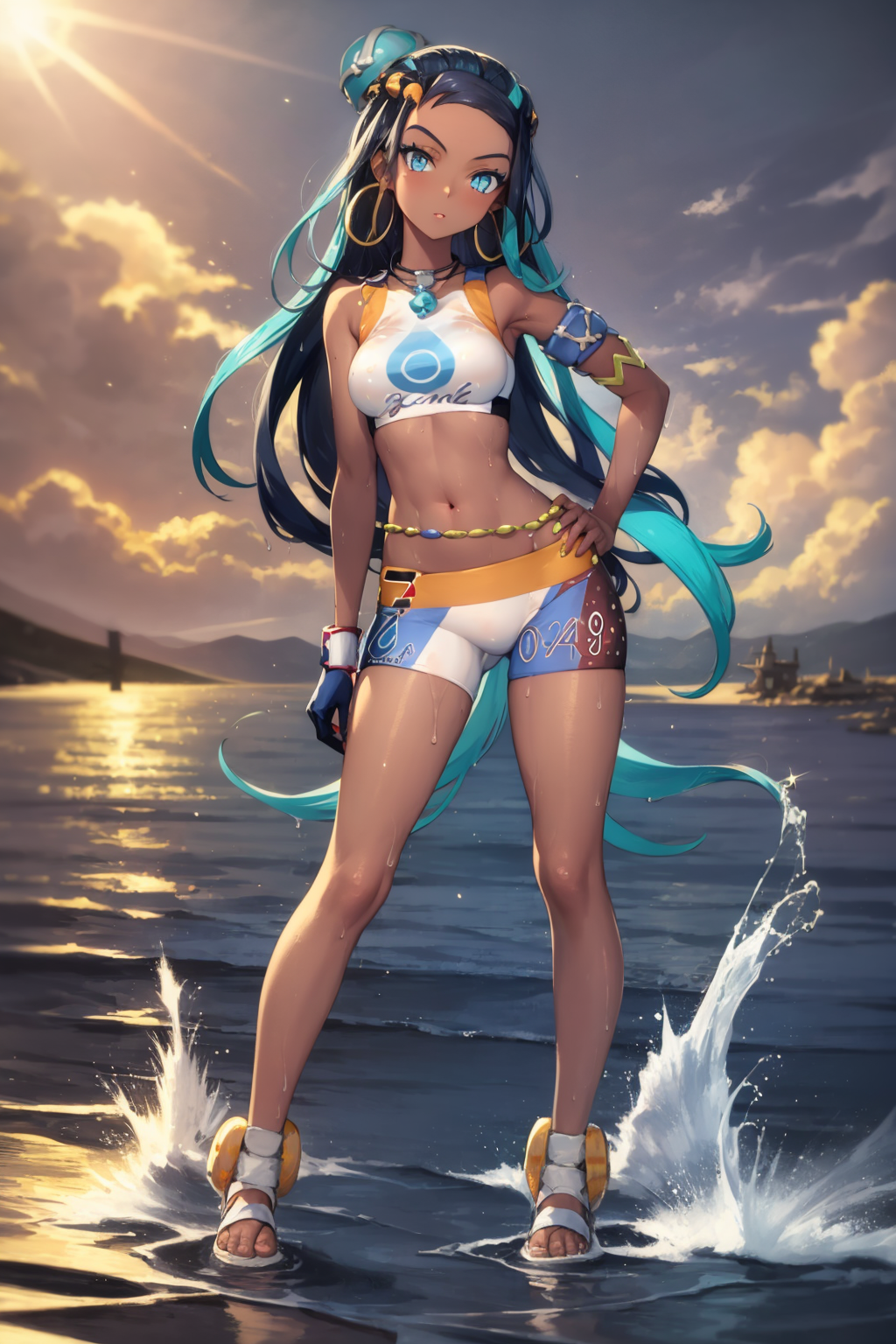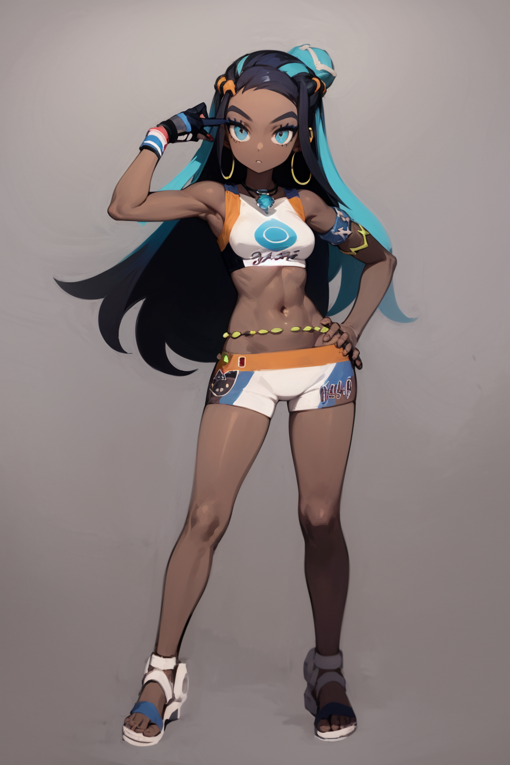 Outfit prompts : armlet, belly chain, ??????, crop top, shorts, single glove, hoop earrings, necklace, midriff, navel, sandals